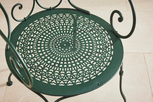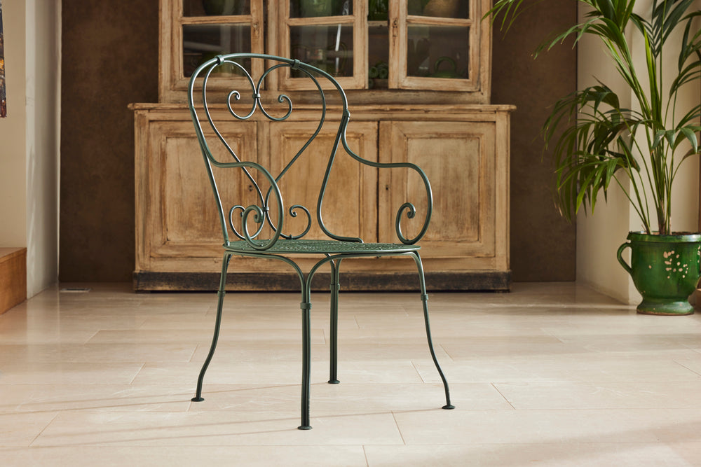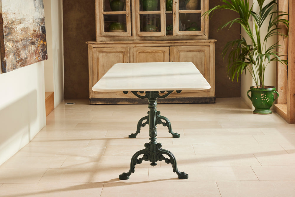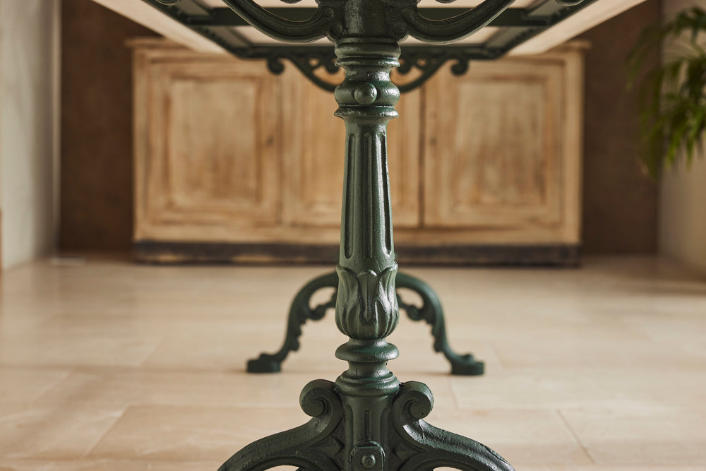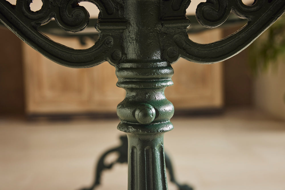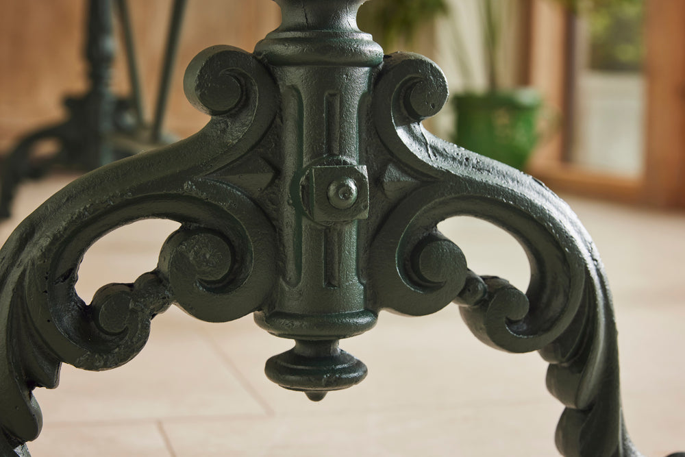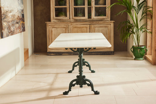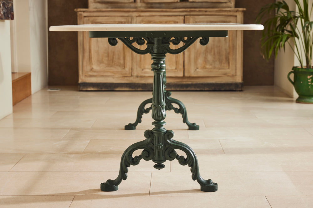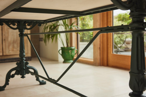 We found this exceptional late 19th century cast iron garden table in the South of France to which we have added new marble top as the original had perished. We have added eight chairs and 2 armchairs all of which come with seat cushions. The entire set has powder coated in a dark green providing the ultimate protection from weathering. A really lovely and original set which has been restored for another generation to enjoy and is therefore the ultimate eco purchase.