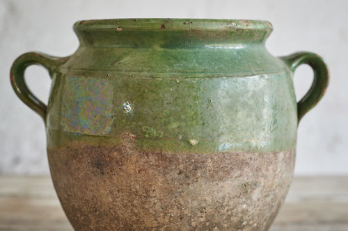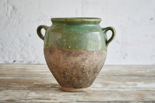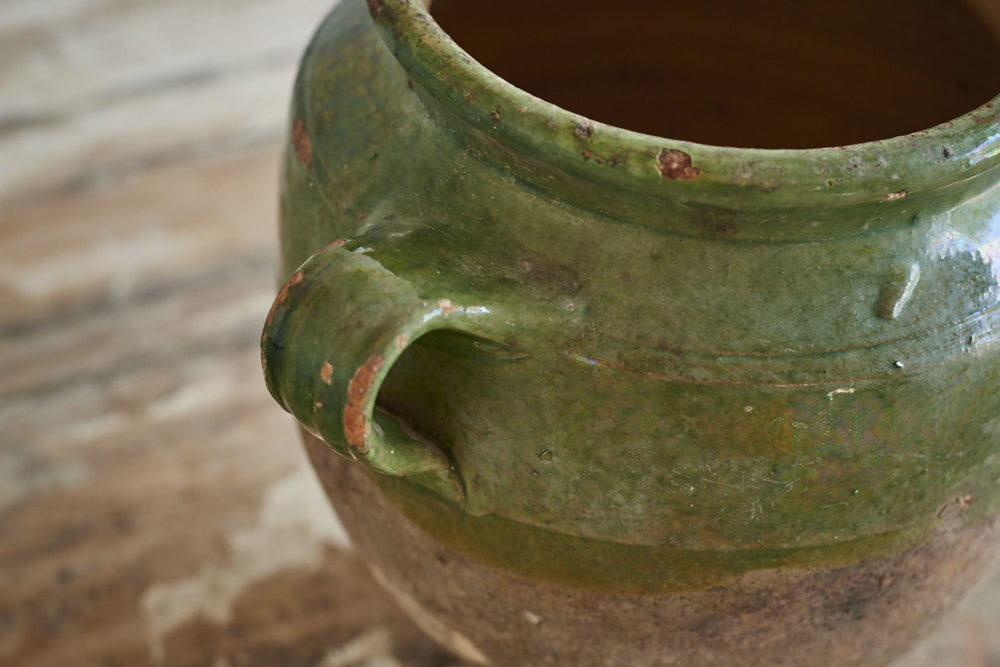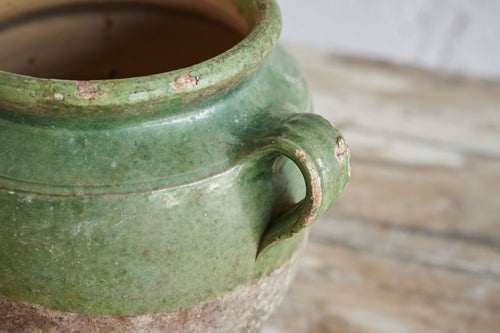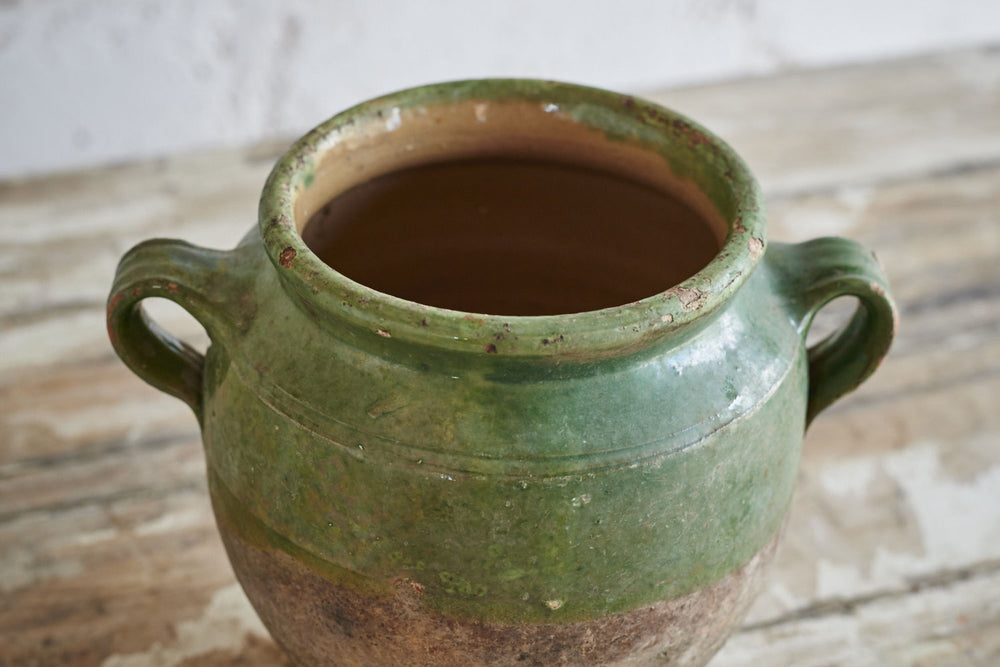 Confit pots have a very pleasing shape, with two small handles and a plump round body. The green glaze on this one is extremely attractive and in wonderful condition for a domestic item. Confit pots make lovely ornaments or small planters.