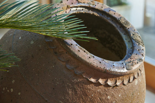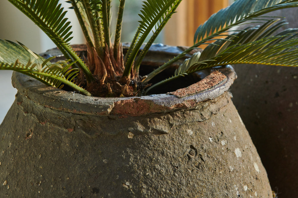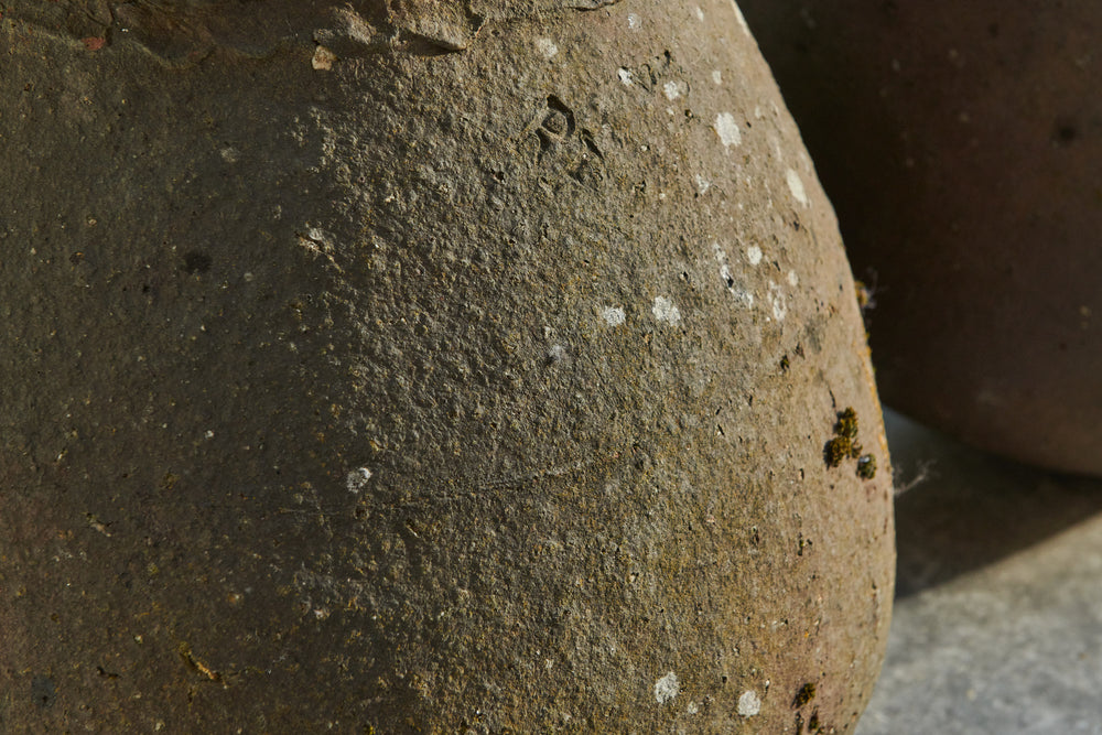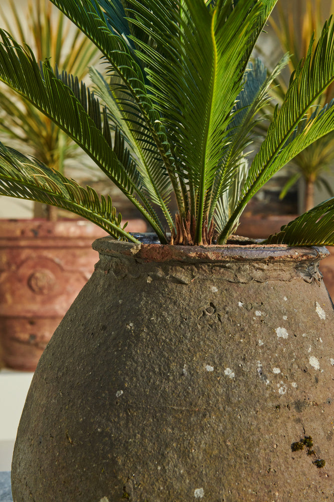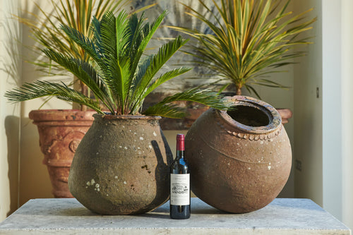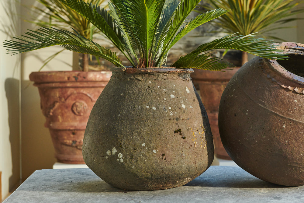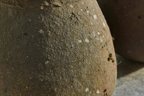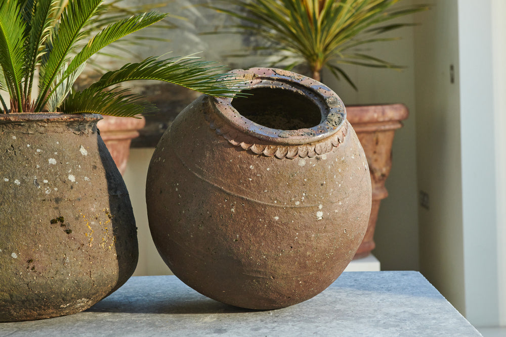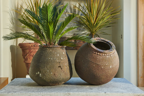 This pair of terracotta salt pots would have originally been used to preserve food in the 18th century. They have an attractive, weathered patina with some naive decoration around the neck. They sit flat and at a slight angle and would make unusual and interesting planters.