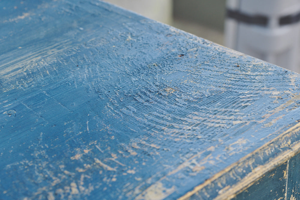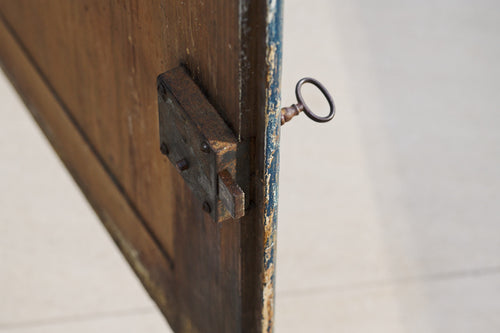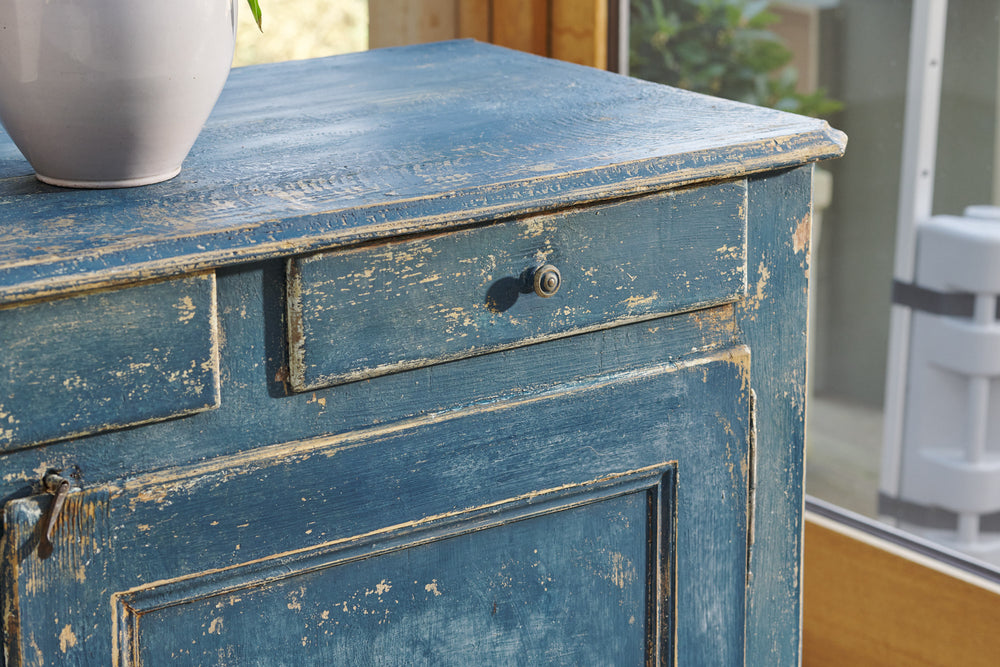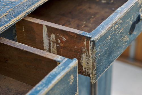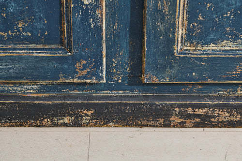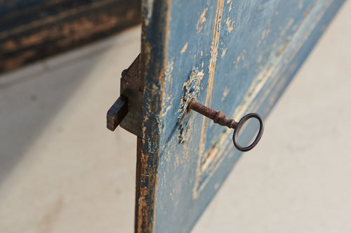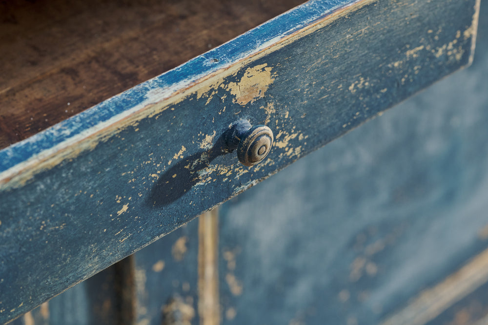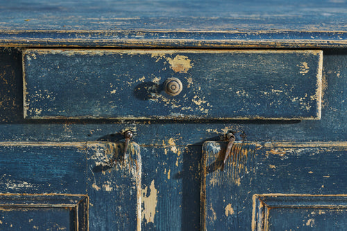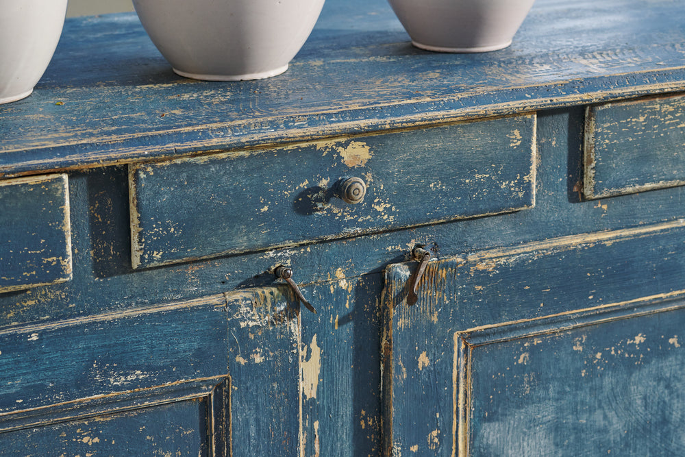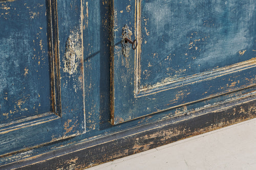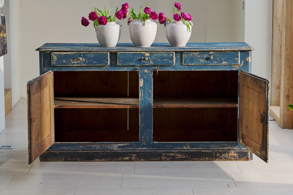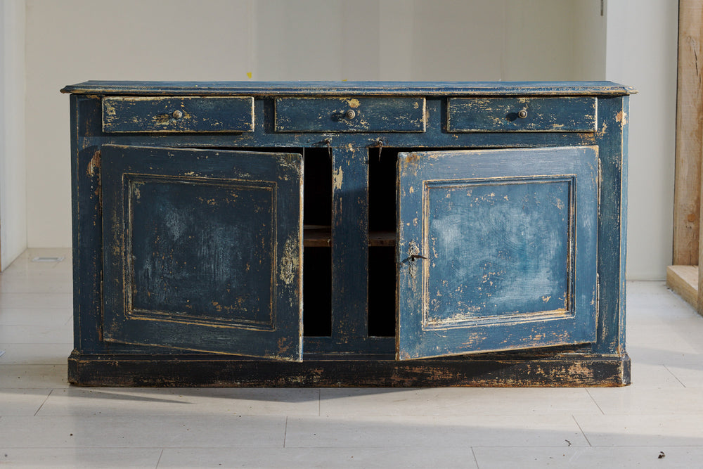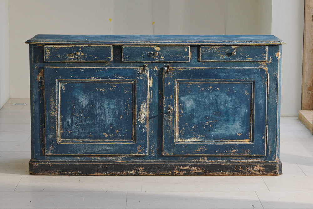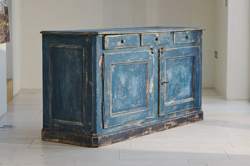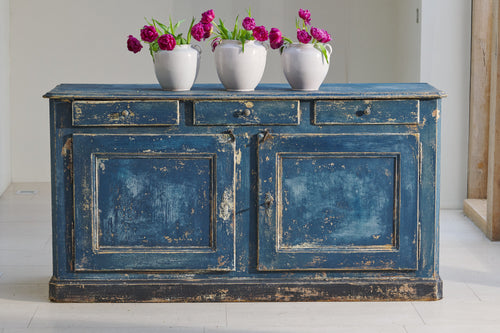 An 18th century French painted sideboard in original condition. It has developed over the years of use a delightful worn blue patina. It is made of pine and features 3 drawers with two cupboards below. One cupboard is locked from the inside and the other features its original double lock and key. In very good condition this attractive piece has many uses throughout the house wherever storage is required.