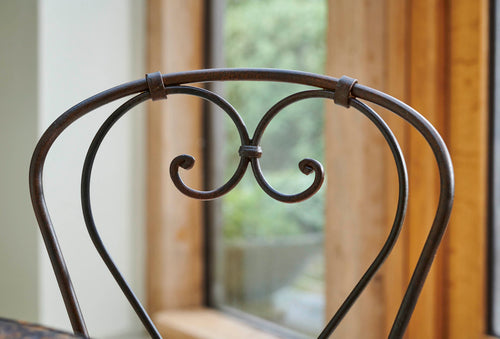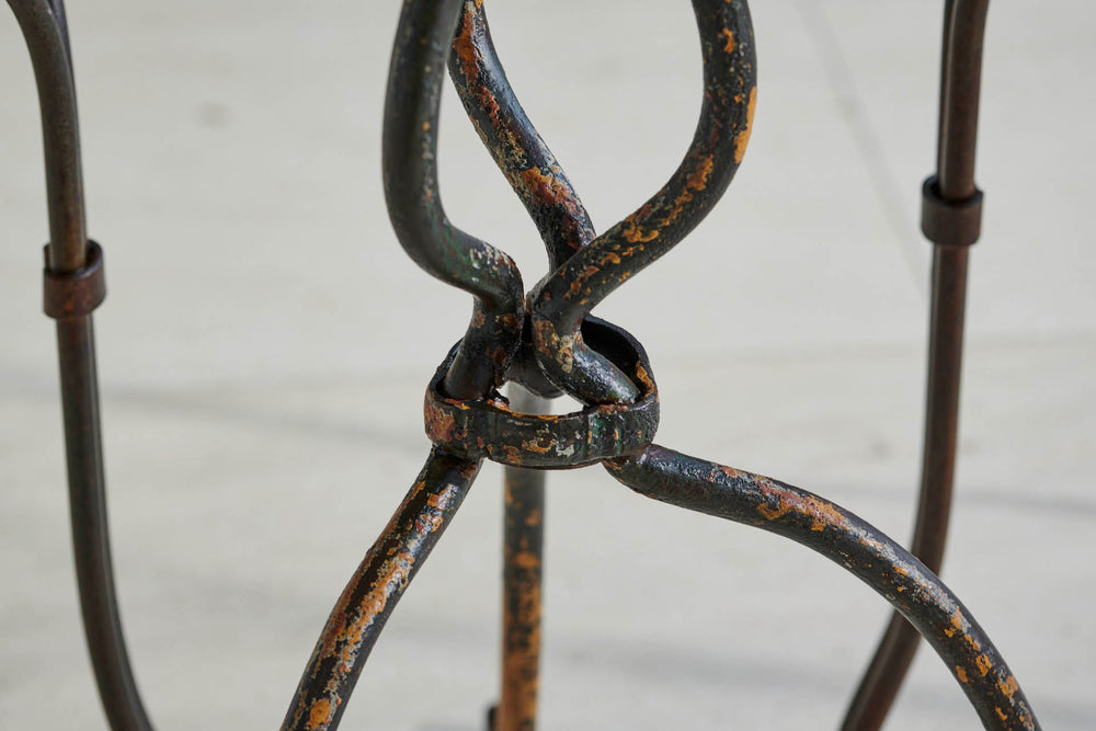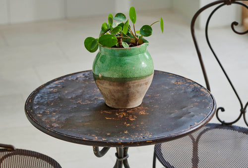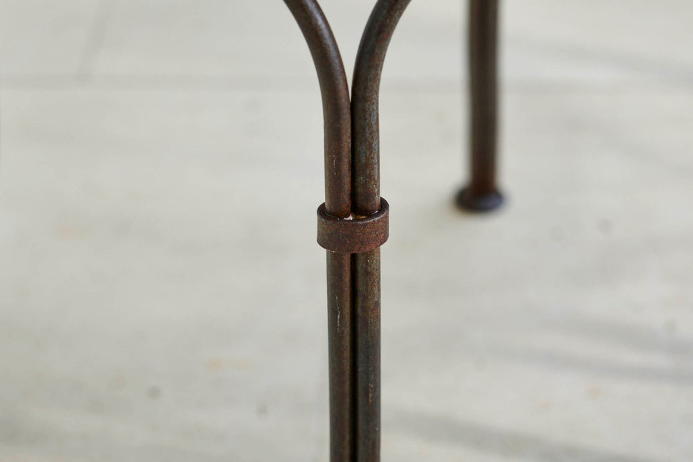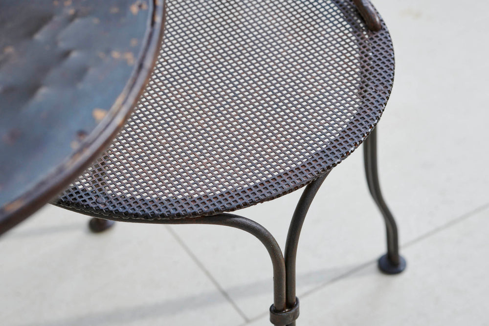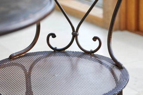 The delightful cafe set is designed for either Coffee or Aperol! The table has a pretty twisted wrought iron frame and metal top. Matched with two chairs that have heart-shaped backs and stamped metal seat this set would suit a small balcony or a quiet corner in the garden.