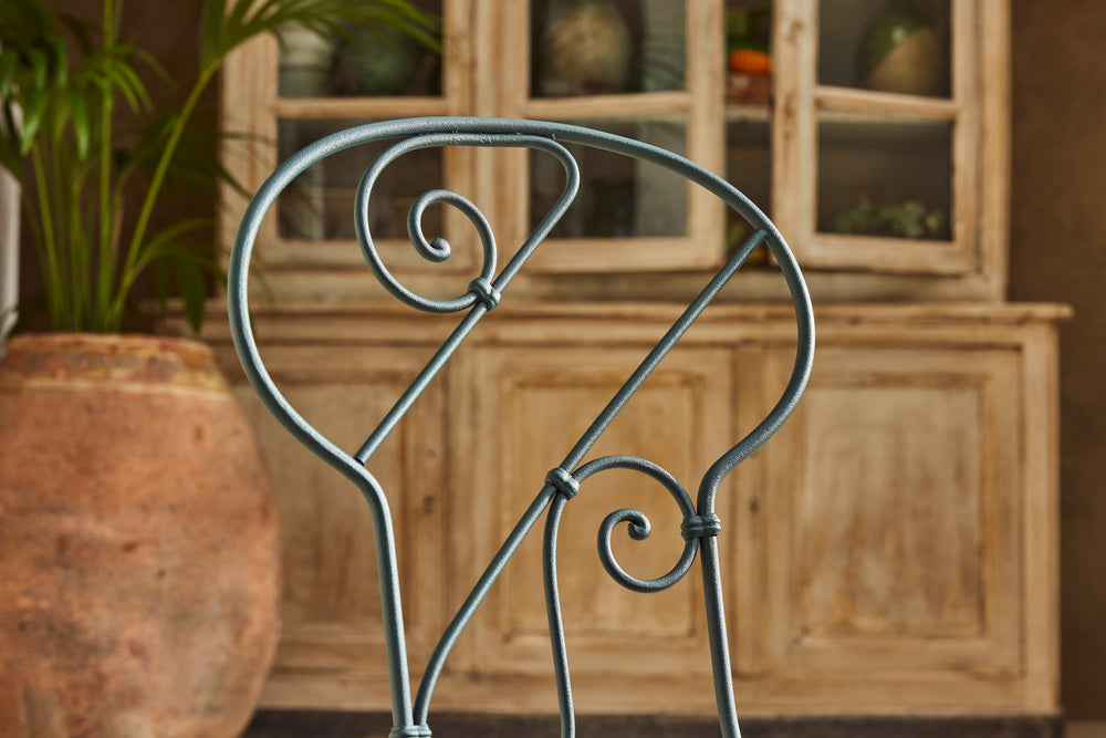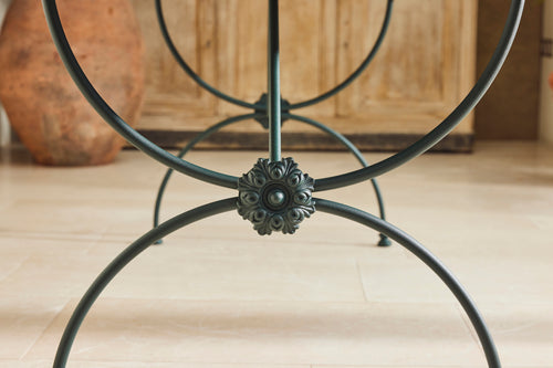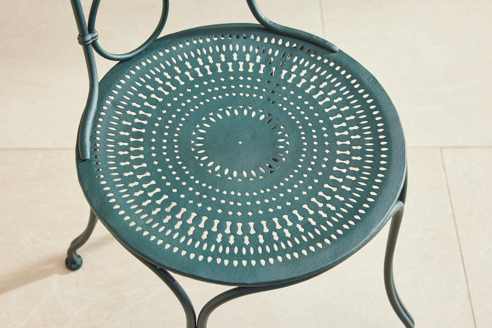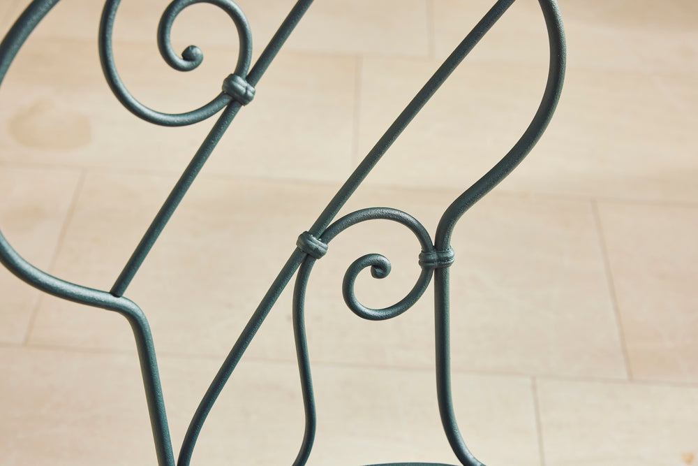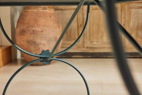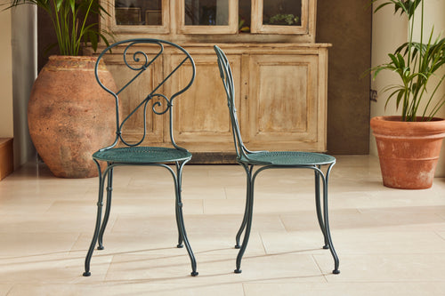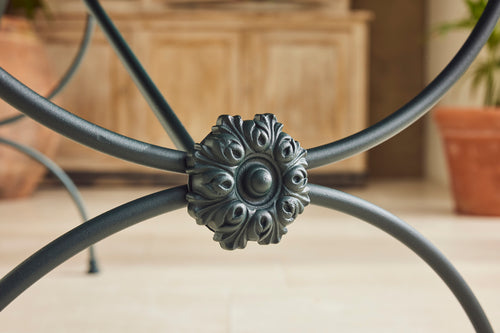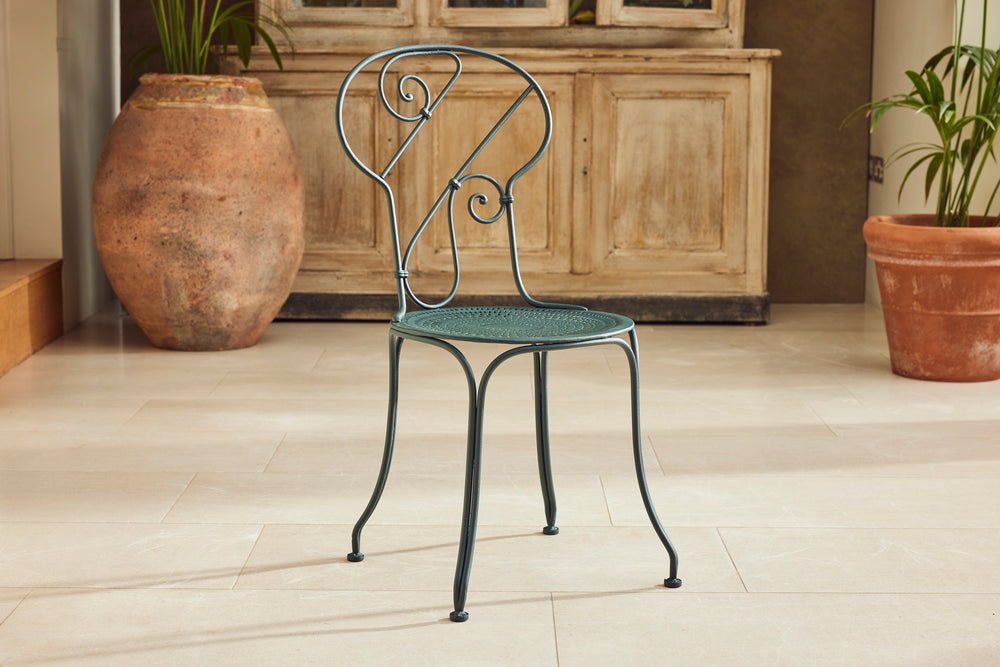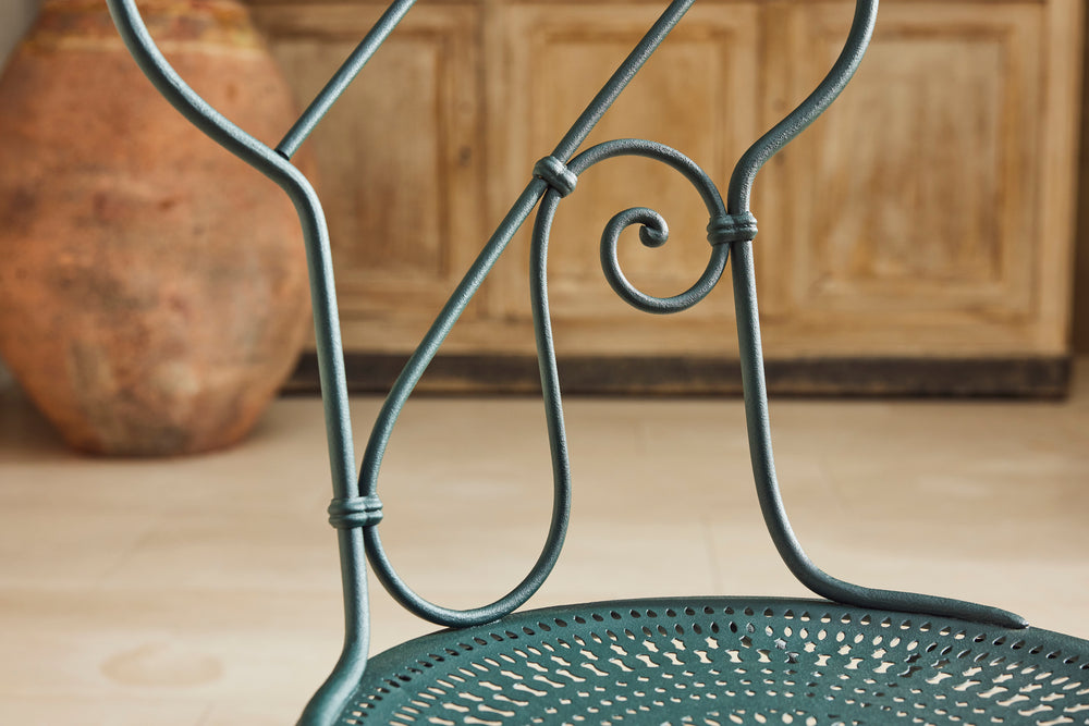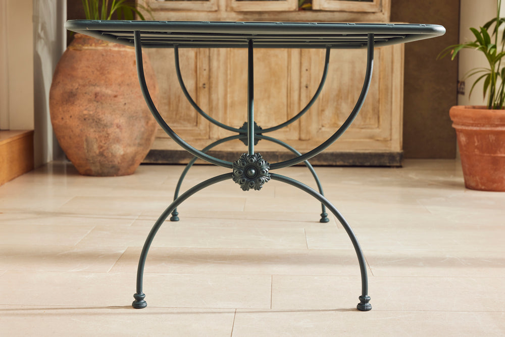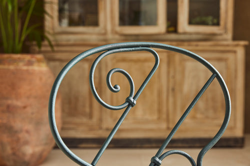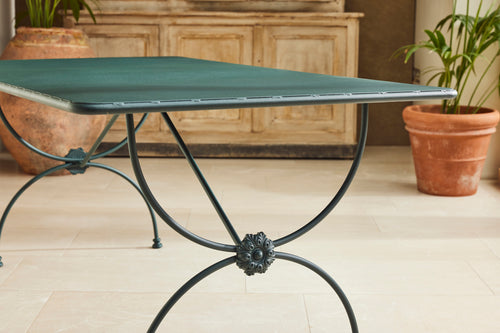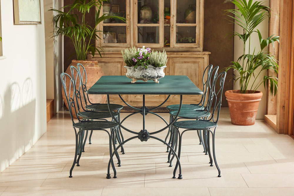 A good size wrought iron metal table with six unusual chairs from the 1920s. In very good condition having been fully restored by us the table features a curved frame with a floral motif at each end and round lead feet. The chairs have an art deco styled backs and pierced metal seats. A really attractive set for outside dining with family and friends.