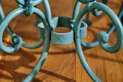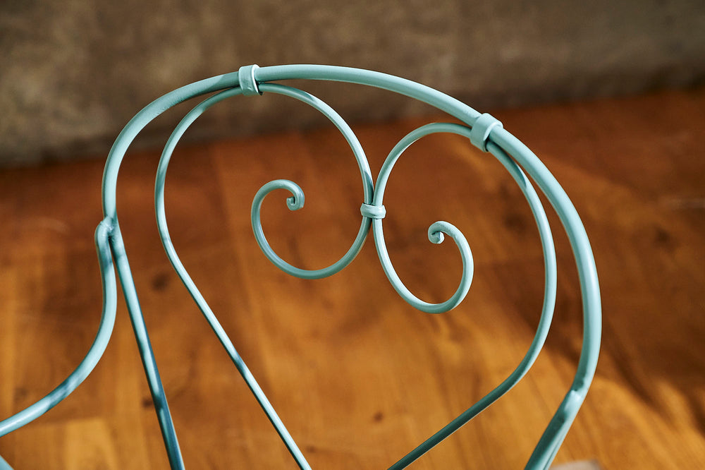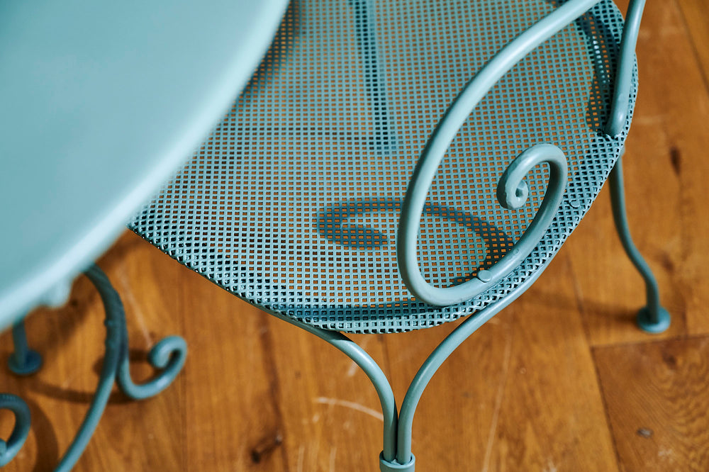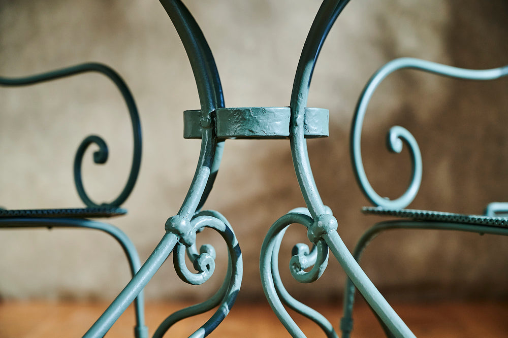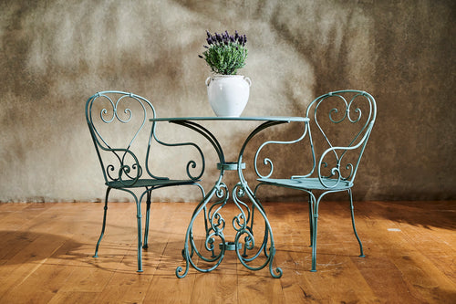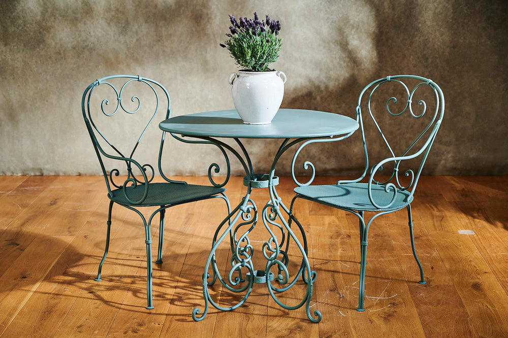 A lovely garden set which we have fully restored. We love the curved design of the hand-forged table base. The attractive armchairs are large, very comfortable and have a mesh seat. The perfect dinner for two set finished in Farrow and Ball 'Smoke Green'.