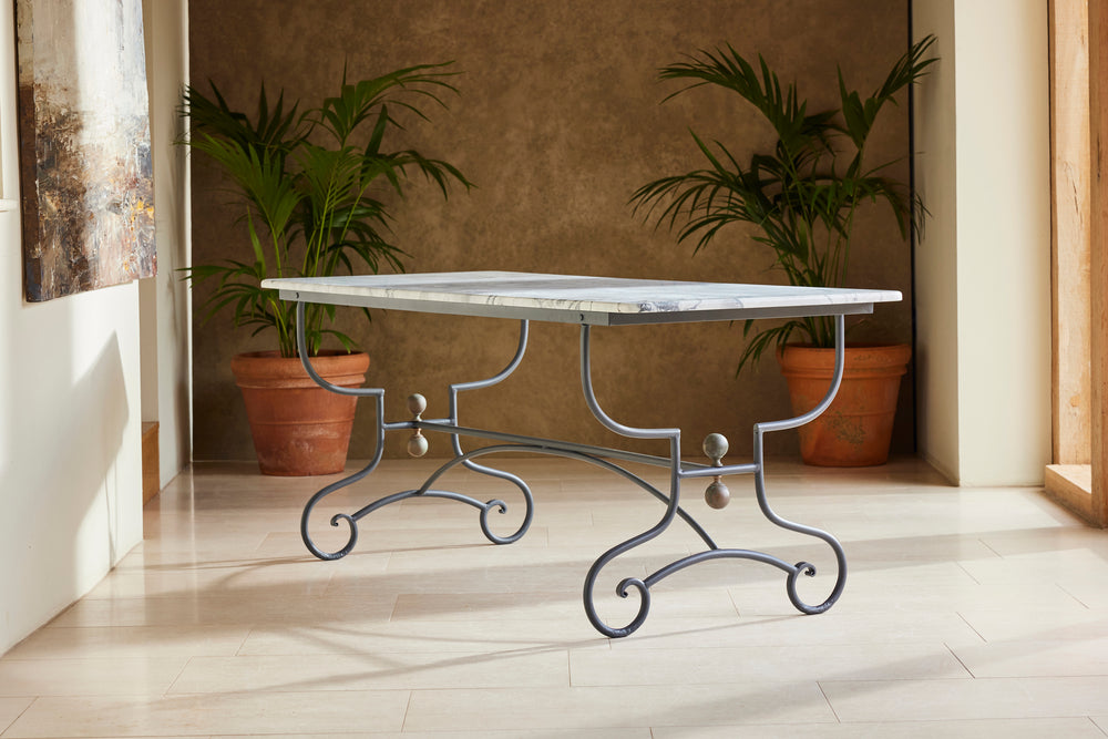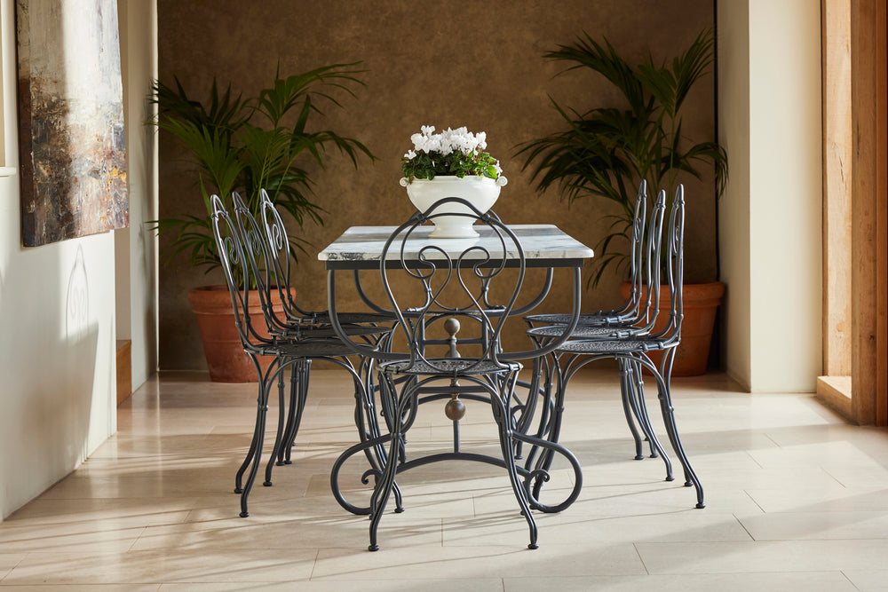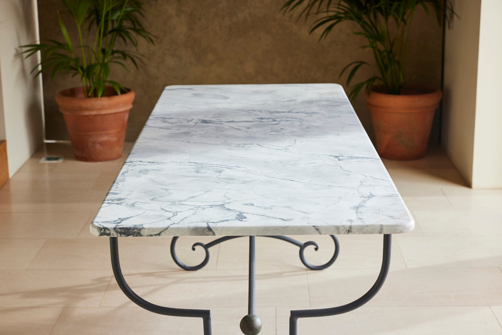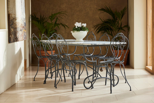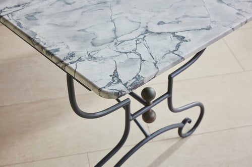 The original marble was beyond repair, and we have replaced it with this very attractive white piece with grey veining throughout. We then painted the table and chairs to match the marble to create this distinctive set.