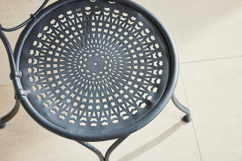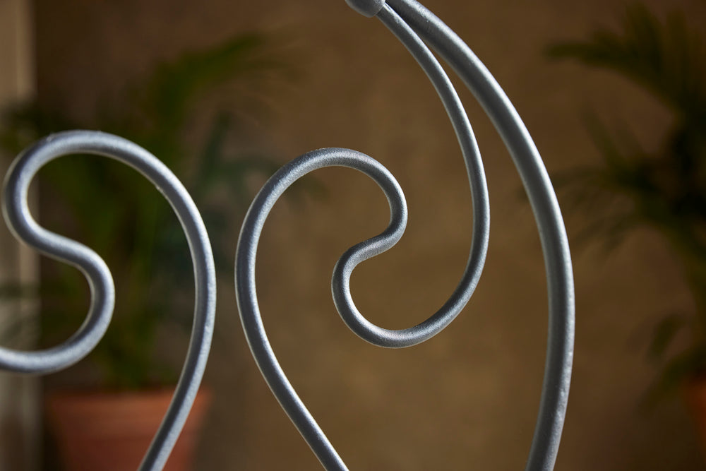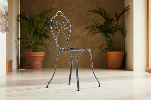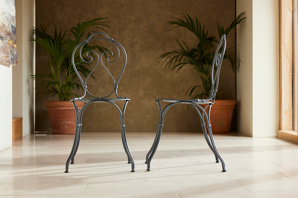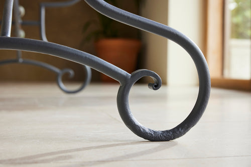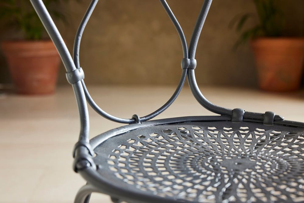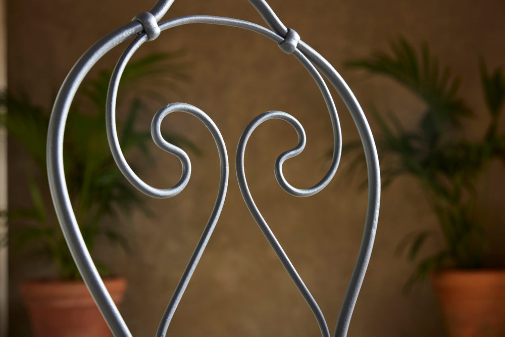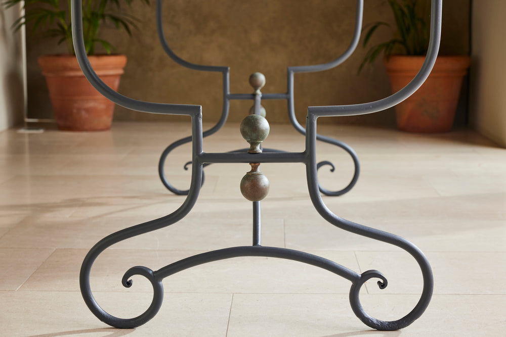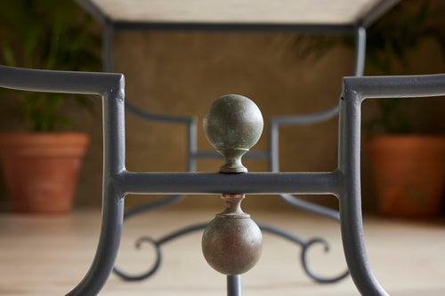The attractive hand-forged wrought iron table base and pair of brass finials at each end and the unusual chairs have stamped seats and mushroom shaped backs.