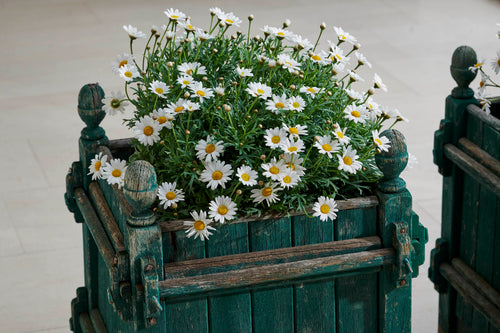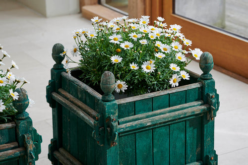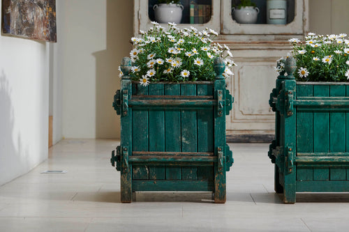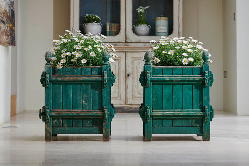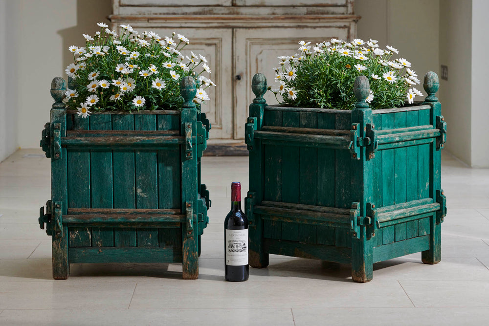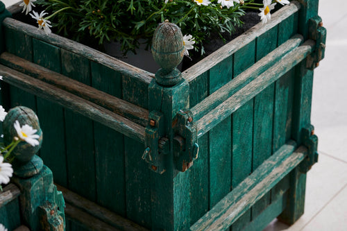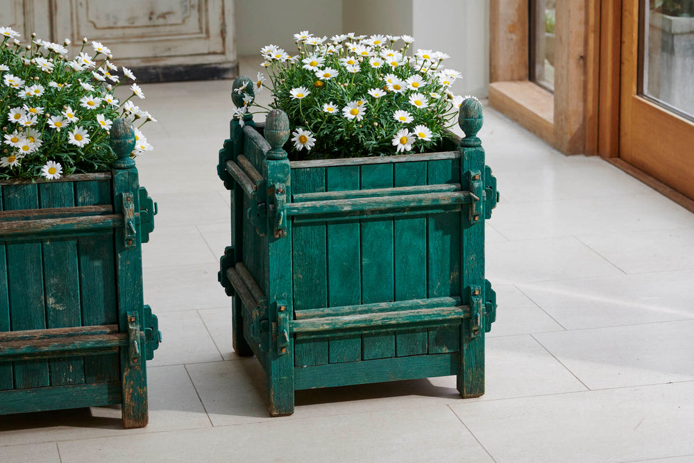 A really lovely pair of square 1930s orangery planters in green painted hardwood with acorn finials at each corner. They are in very good condition and would easily accommodate a small tree or shrub. They would be perfect in a garden room or conservatory or either side of a front door.
