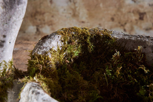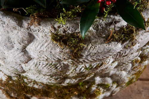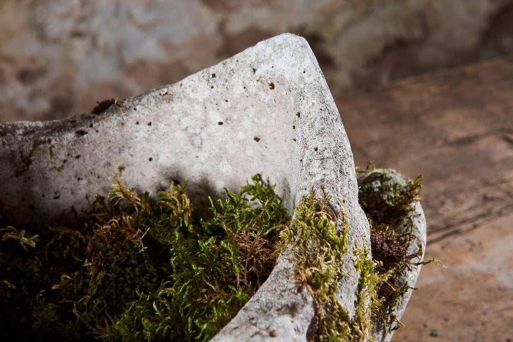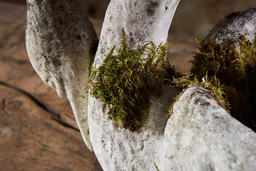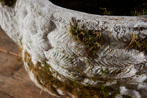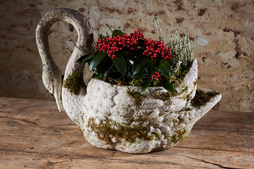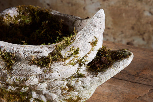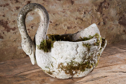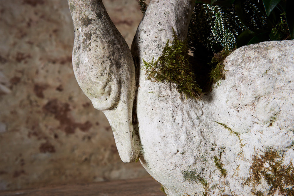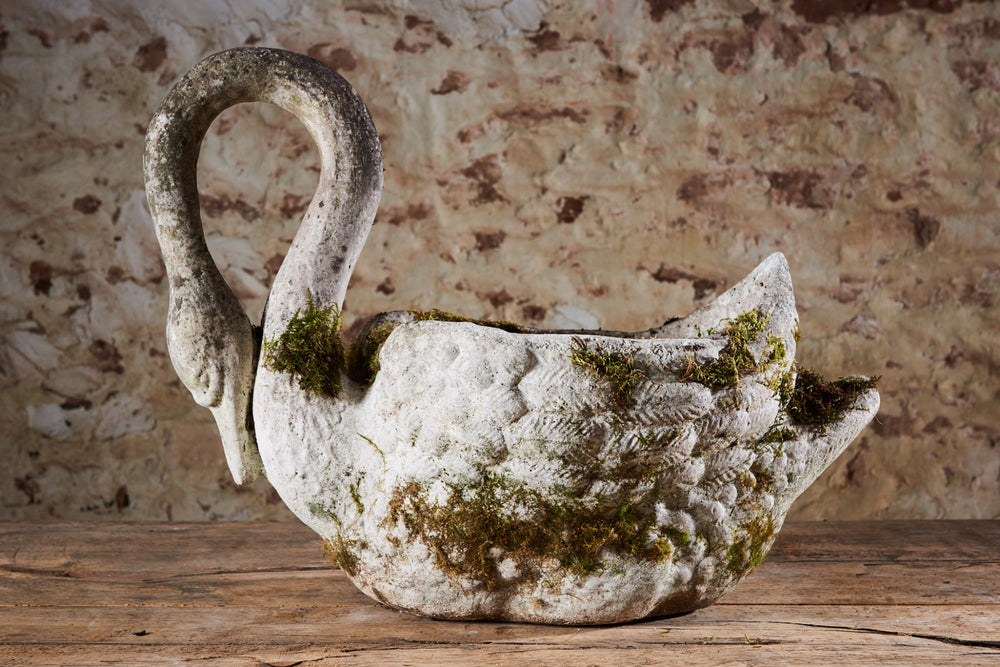 A fine and elegant swan planter with a beautiful curved neck would make an ideal statement piece in the garden. Detailing of the feathers, original, untouched patina and the addition of moss add to its beauty.
