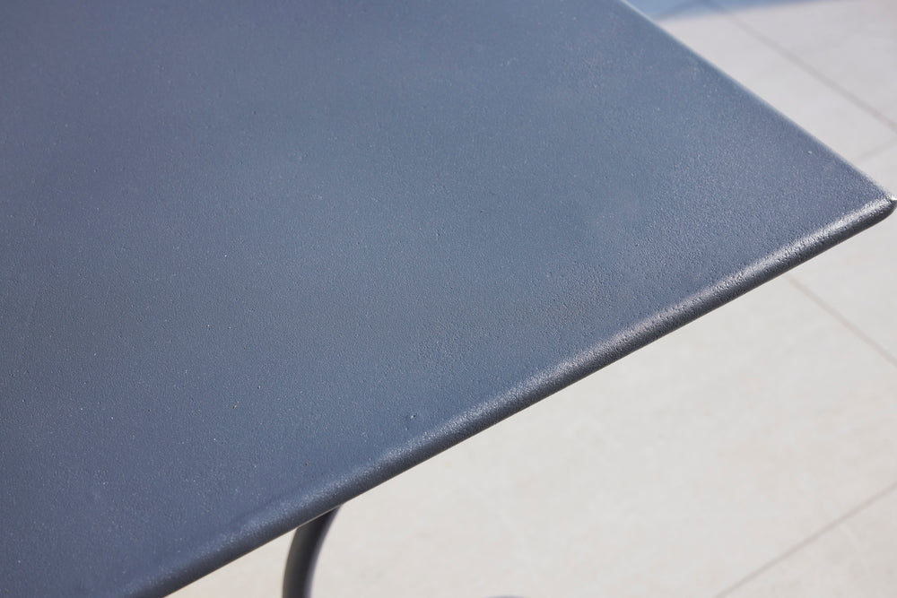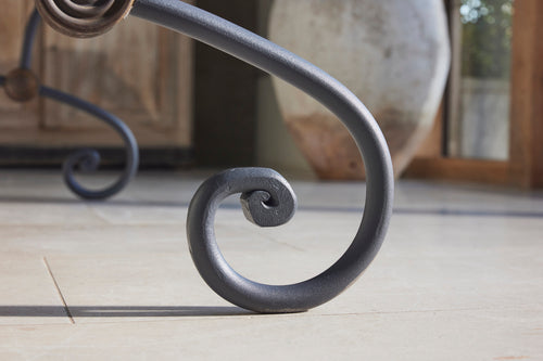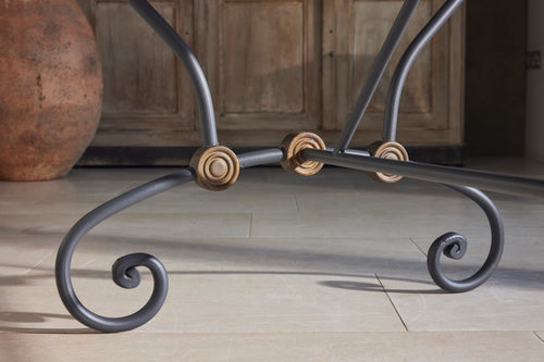 Fully restored by us, it features a wrought iron base, matching chairs, and a metal tabletop—all powder-coated for lasting weather protection. It comfortably seats eight, perfect for stylish outdoor entertaining.