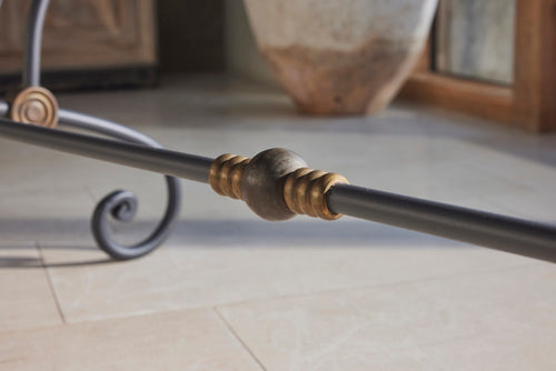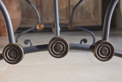 This substantial French garden set includes what is known as a macaroon table owing to the distinctive circular brass connectors joining the frame.