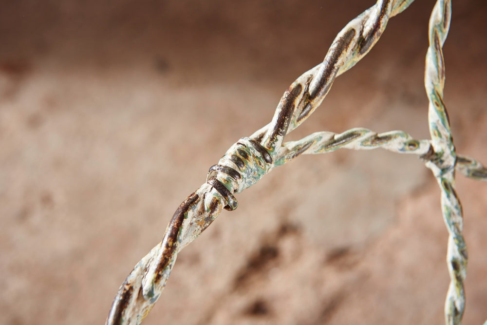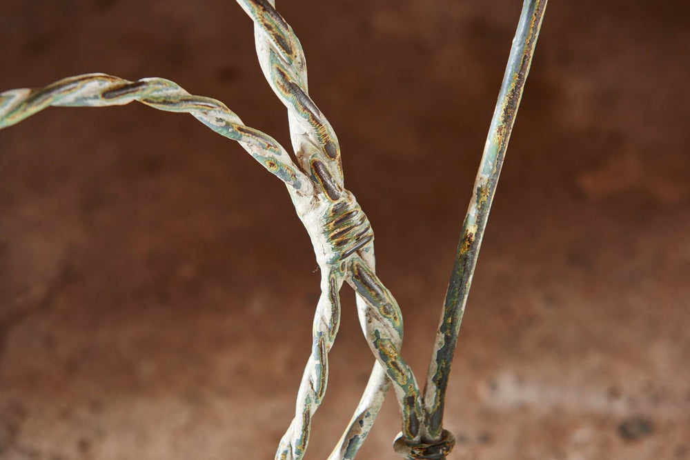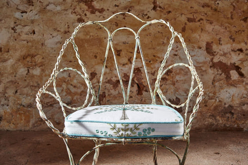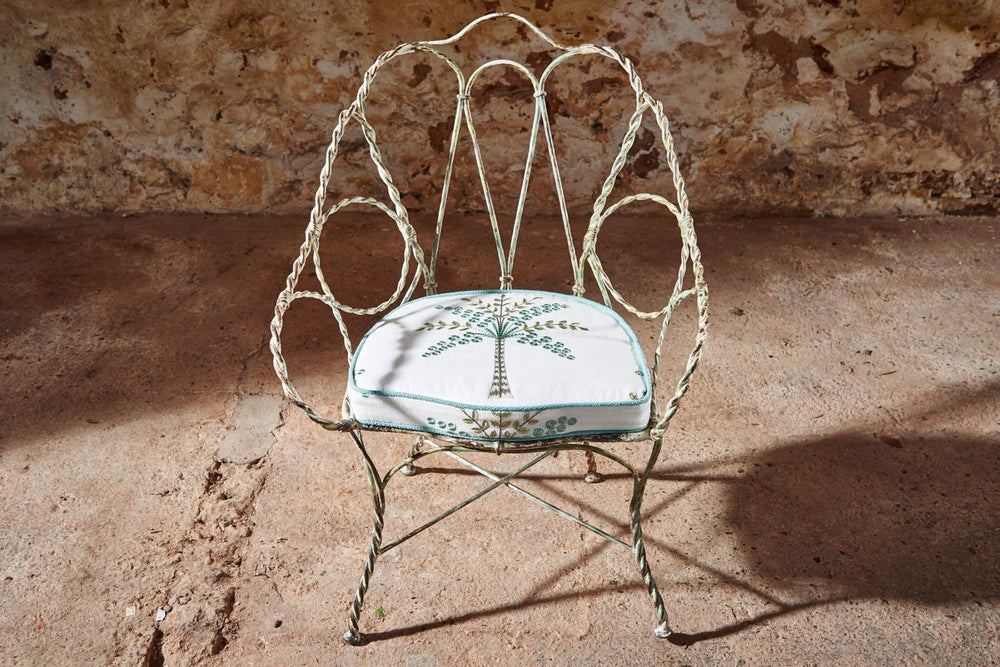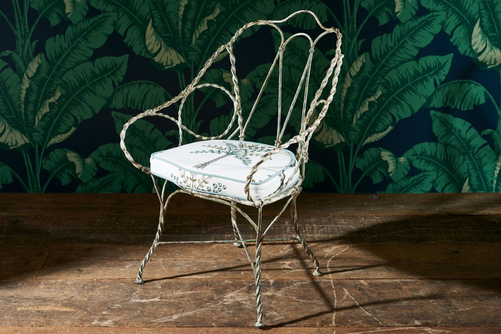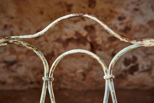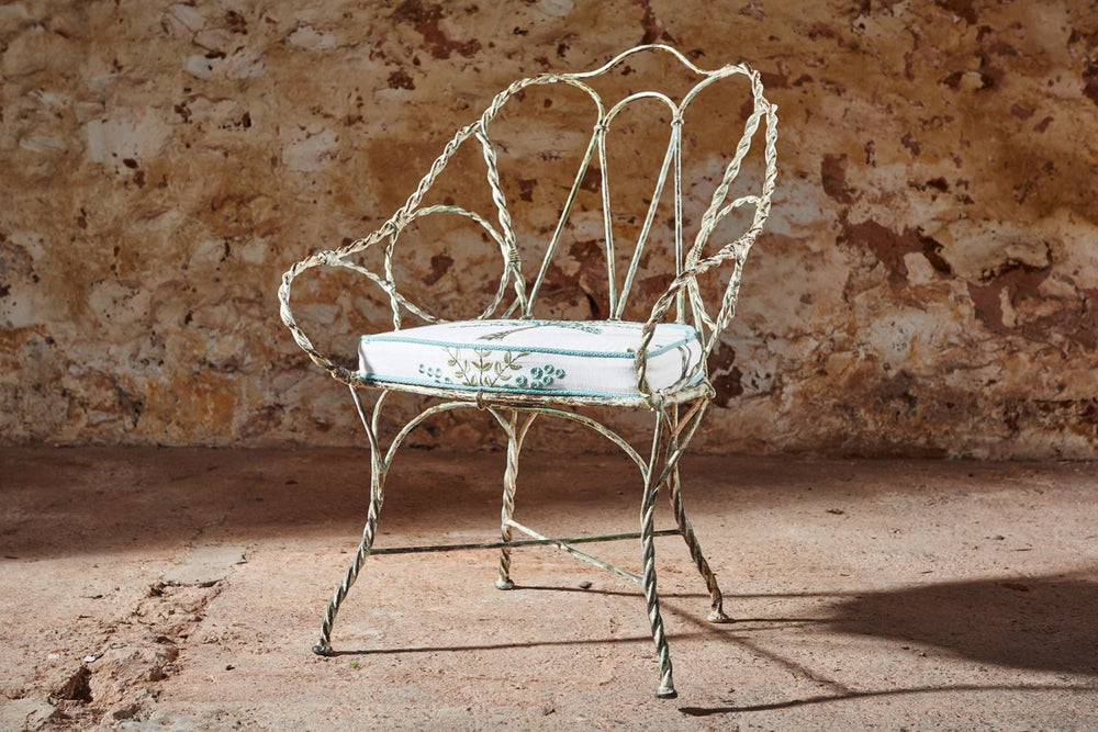 All the joints are fixed with clips or riveted as this chair was produced before the widespread use of welding. The frame has been hand forged with iron twisted when heated to form the rope effect to the legs and decorative details.