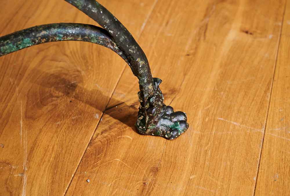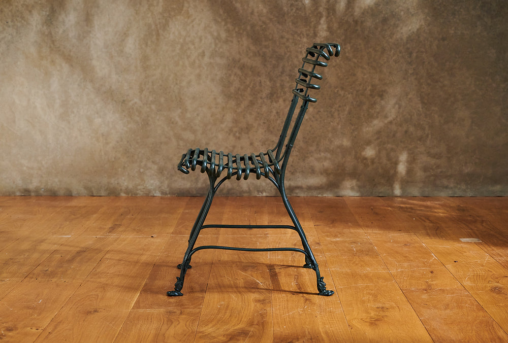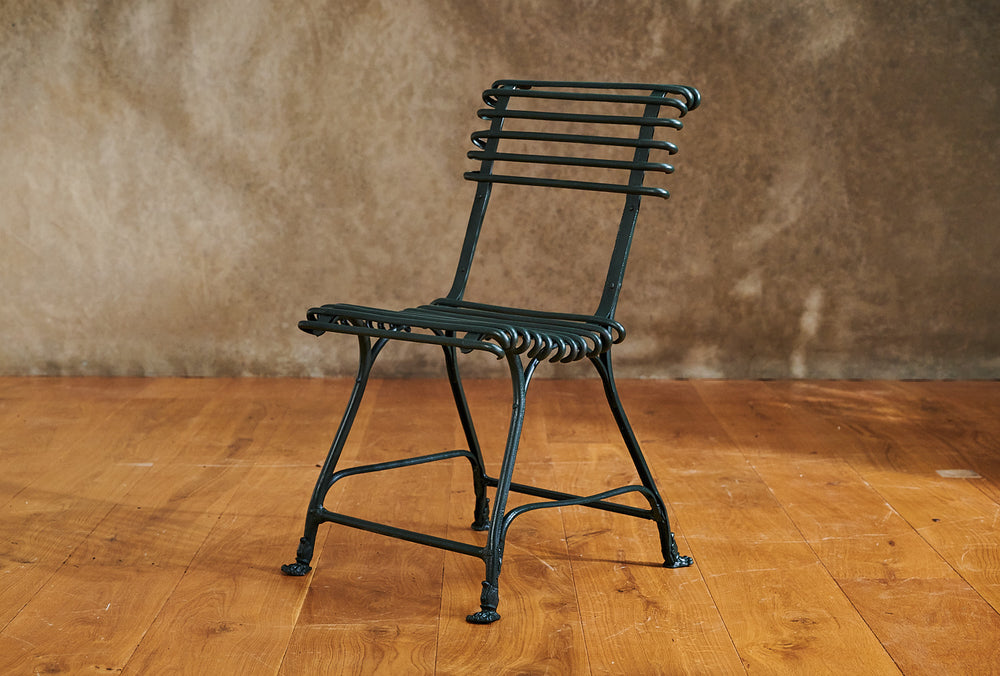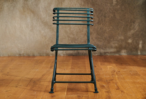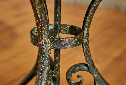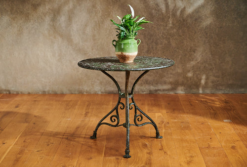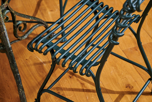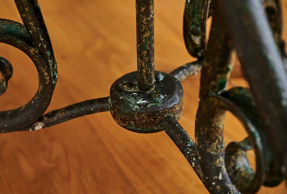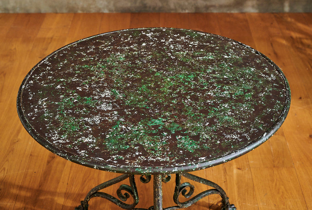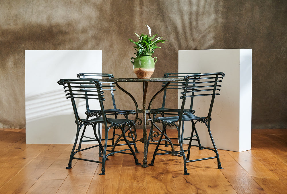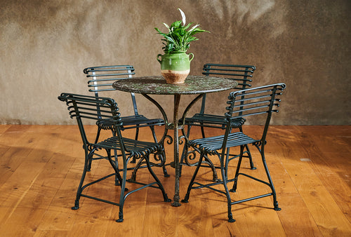 This is a rare set of Arras garden furniture. The four half-backed chairs and the table all have the distinctive "lion's claw" feet, a feature of Arras furniture of the 19th century. All loose and flaking paint has been removed from the table to reveal an attractive green patina. The original chairs have been painted to match the predominant colour of the table.