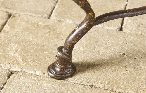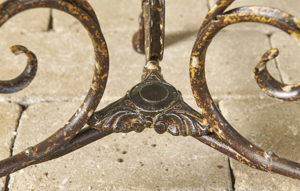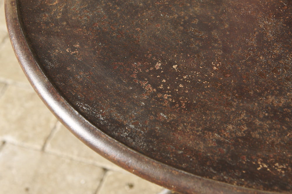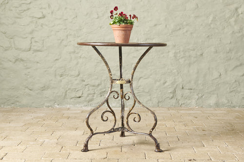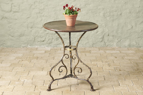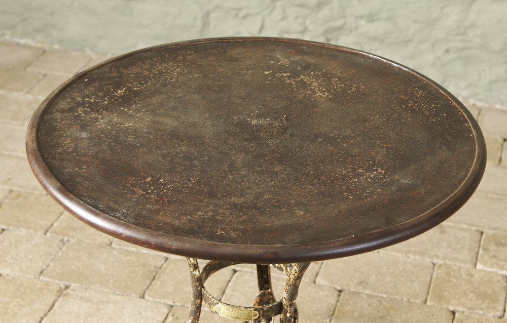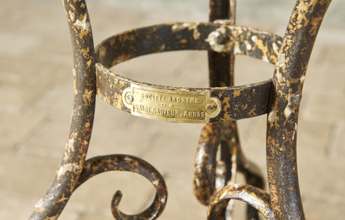 An elegant round Arras table which has had all the loose and flaking paint removed to reveal the most stunning patina on both the frame and the top. Could be used for dinner for two or as a side or occasional table and would contrast beautifully with soft furnishings. This hand-forged wrought iron table has hoof feet and a brass makers plaque indicating that it was made between 1900 and 1914.