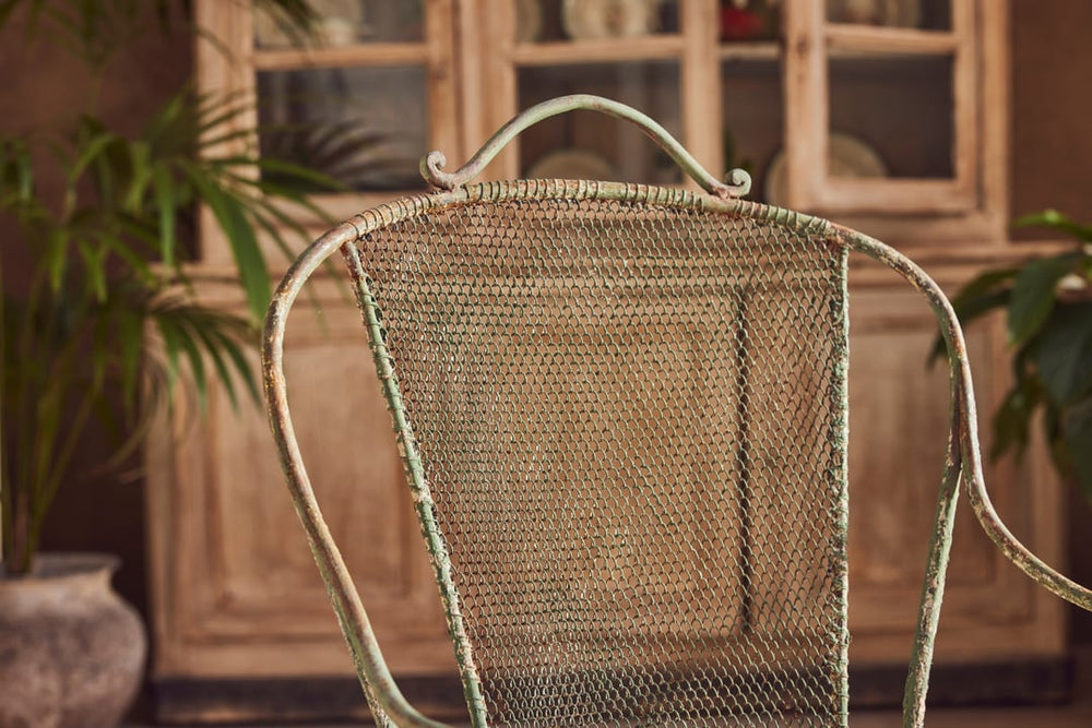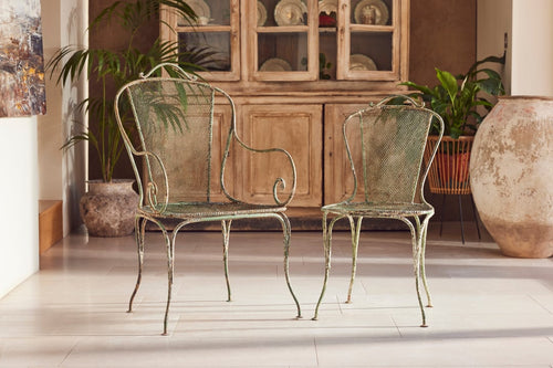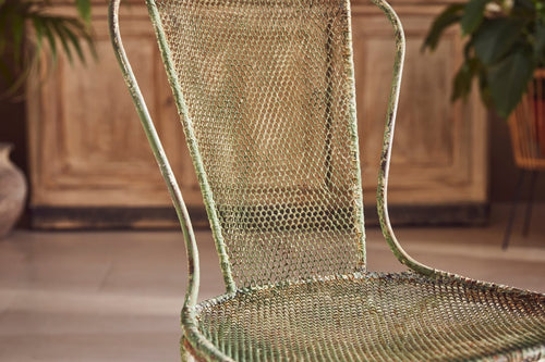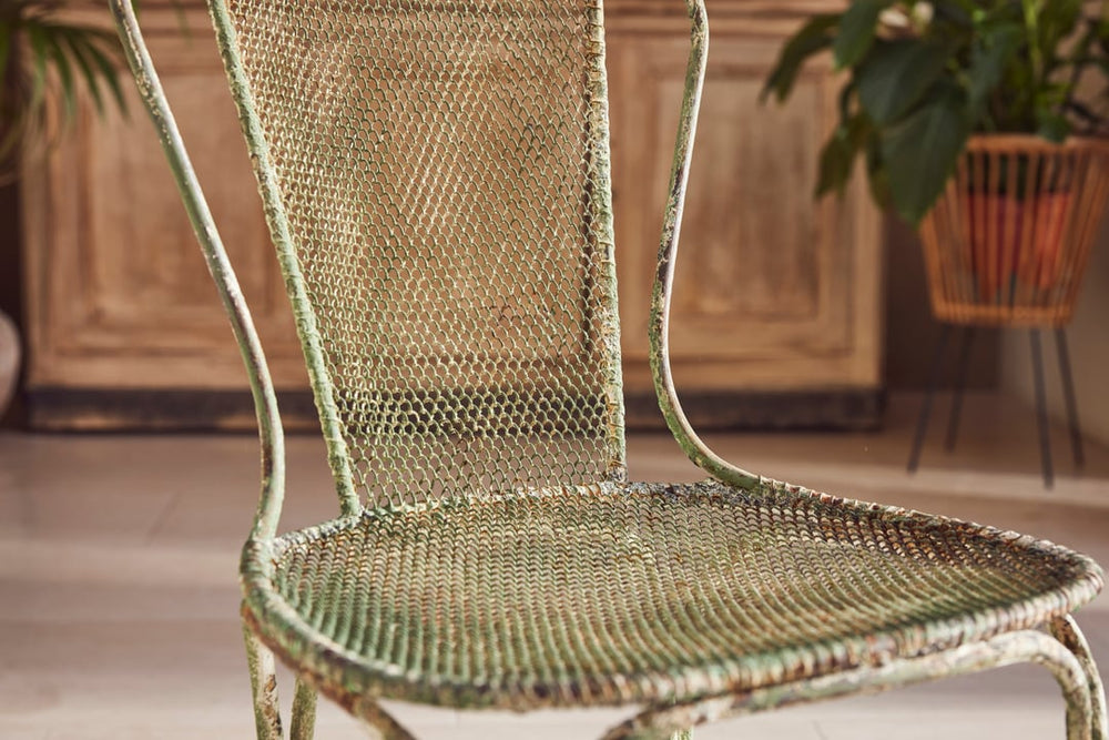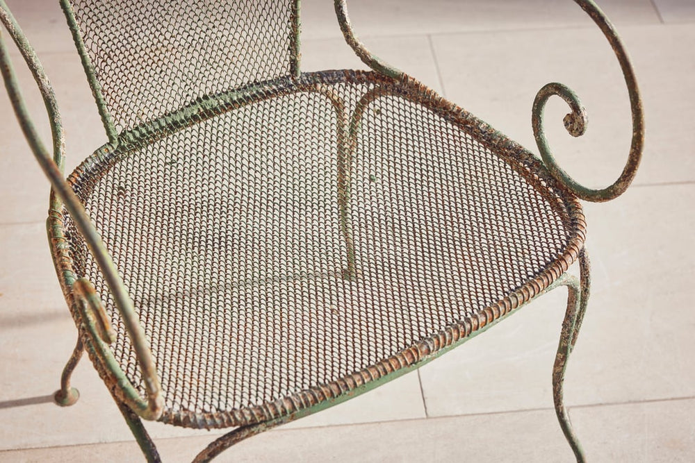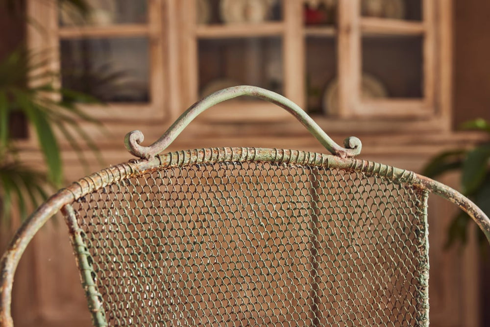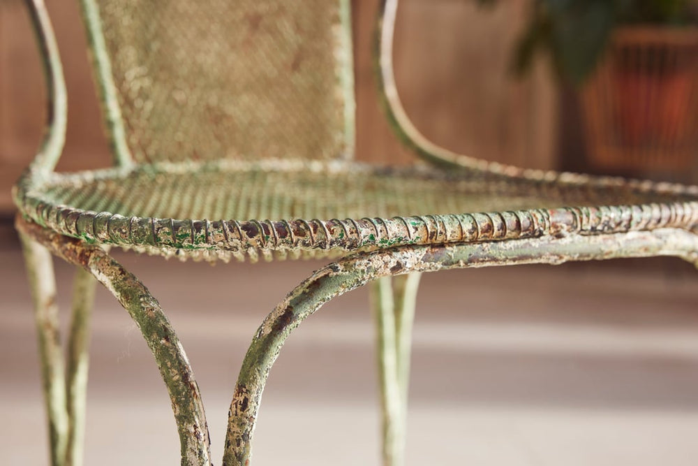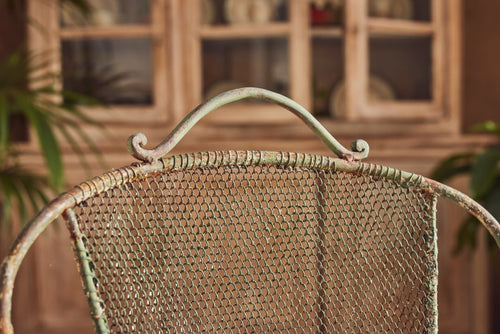 Made nearly 200 years ago, they retain original traces of green and white paint and have developed a rich, untouched patina over time. Crafted with care using rivets, clips, and wire, they reflect early garden furniture craftsmanship at its best.