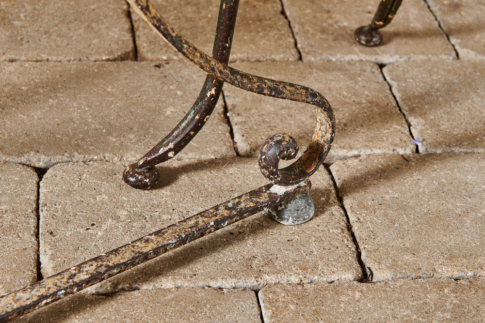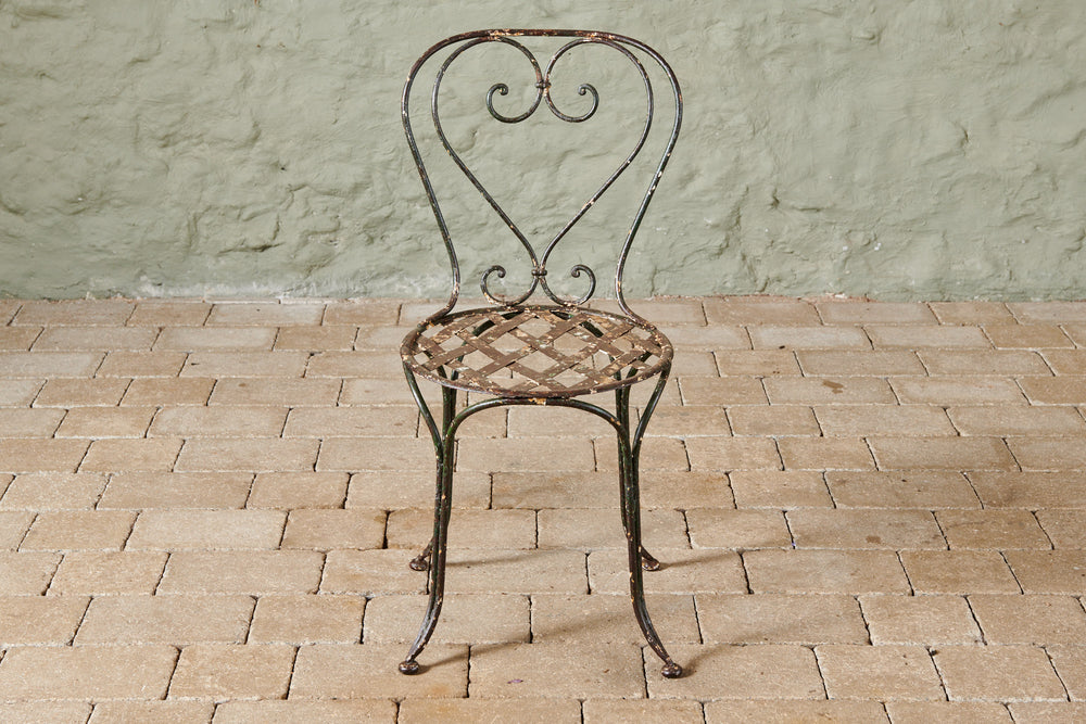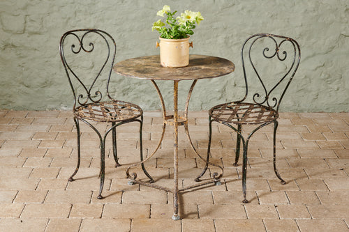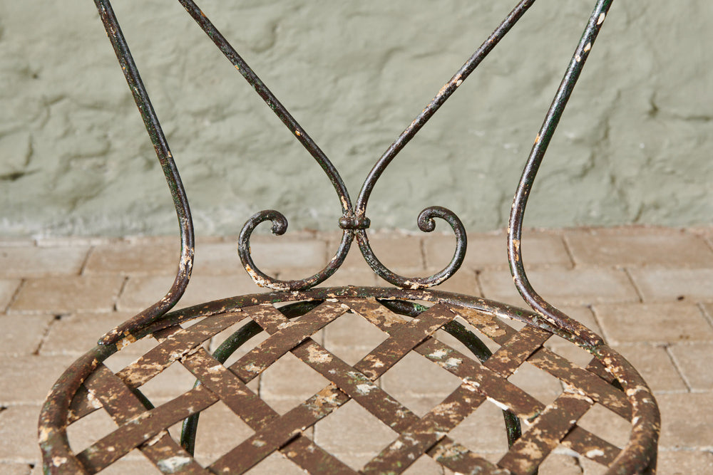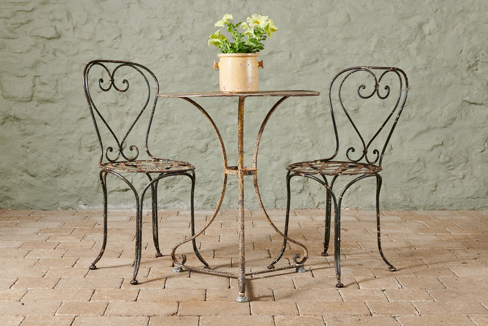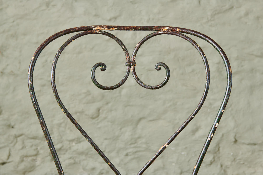 This 19th-century bistro set comprising of wrought iron table and two chairs has developed a very attractive painted patina. The chairs are hand-forged with heart-shaped backs and slatted seats and the table has an interesting and sturdy frame with a metal top. This feature set would be perfect on a balcony or on the patio
