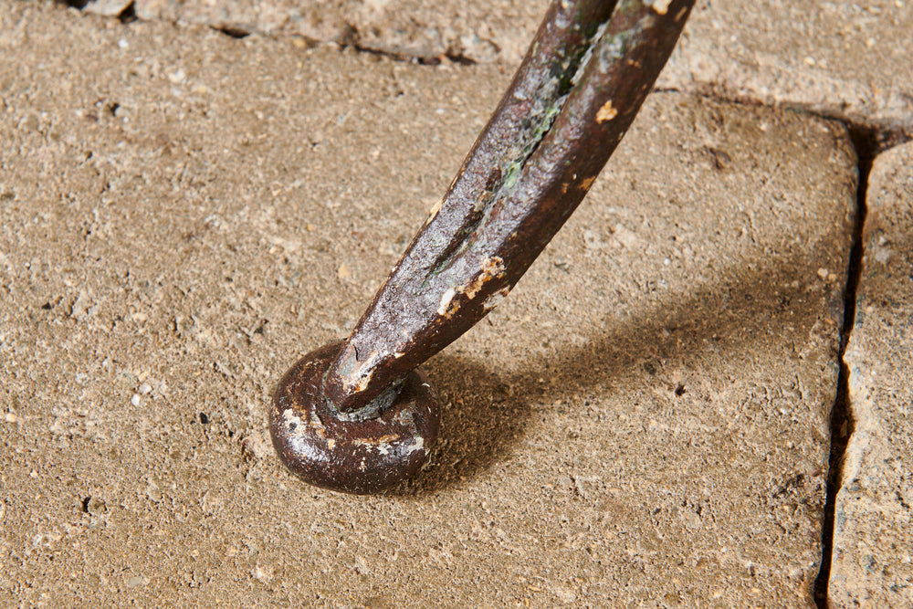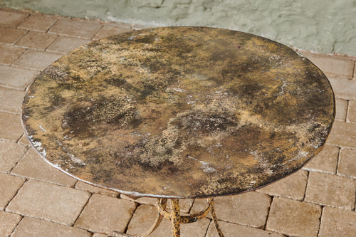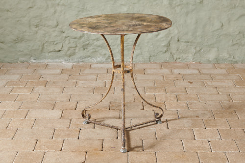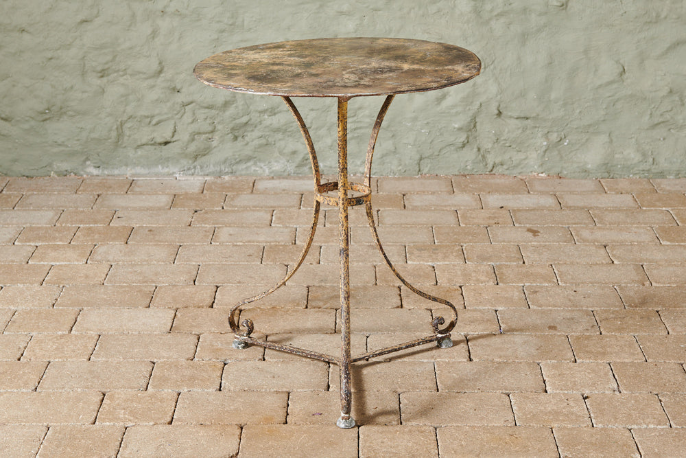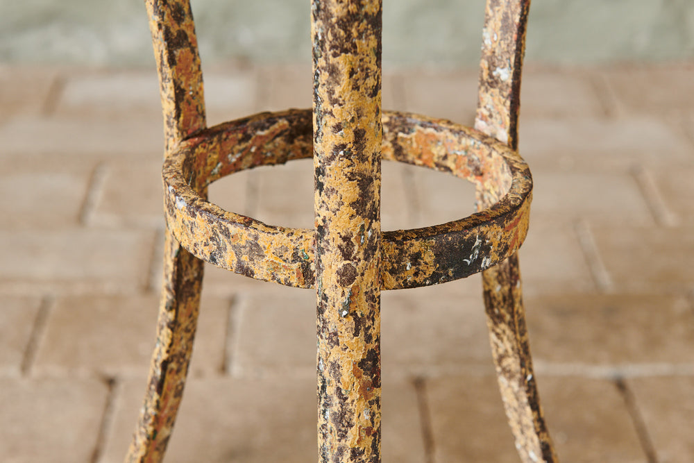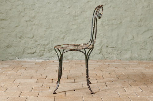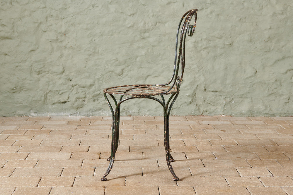 This 19th-century bistro set comprising of wrought iron table and two chairs has developed a very attractive painted patina. The chairs are hand-forged with heart-shaped backs and slatted seats and the table has an interesting and sturdy frame with a metal top. This feature set would be perfect on a balcony or on the patio