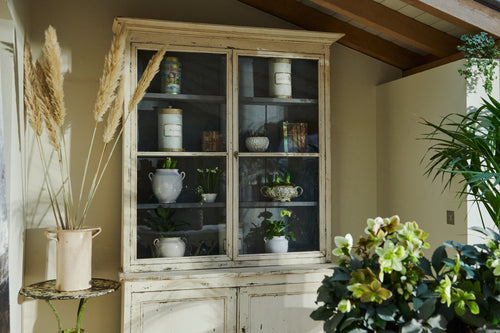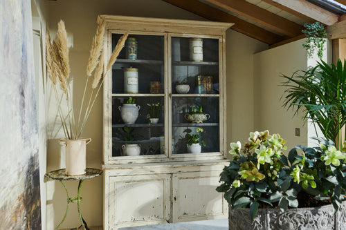 A lovely looking painted French country bookcase that has been dry scraped to reveal an attractive off white patina. In two parts with glazed doors with original wavy glass and double cupboard below. Made from pine and in good condition, this bookcase has many uses as a small kitchen dresser or for general storage around the house.