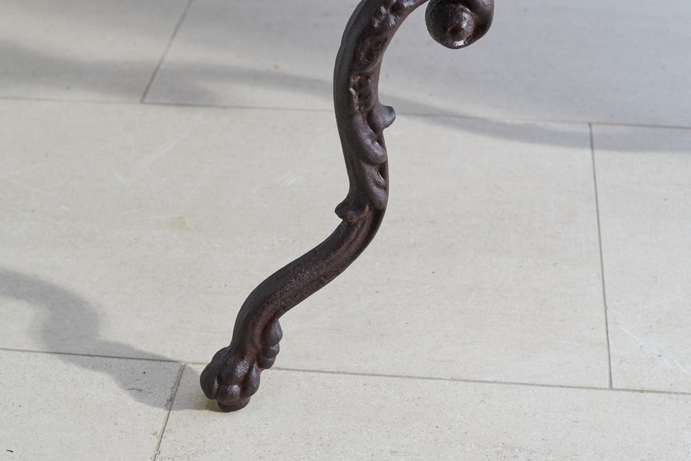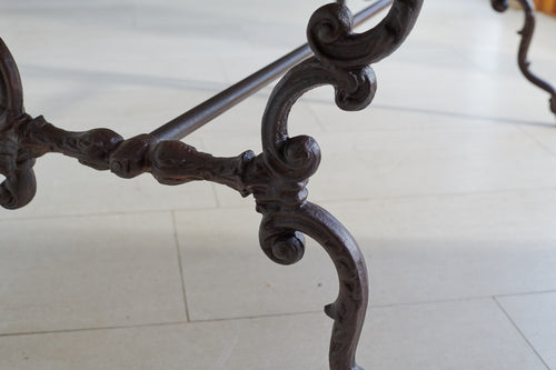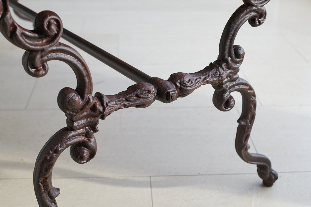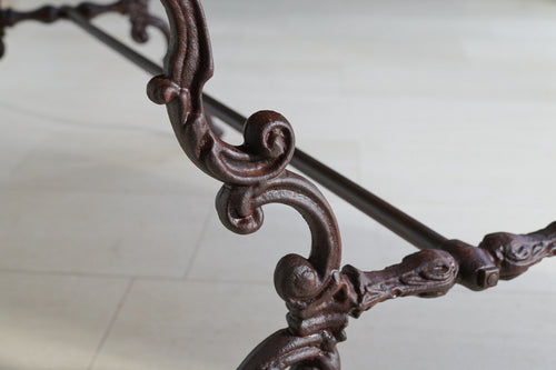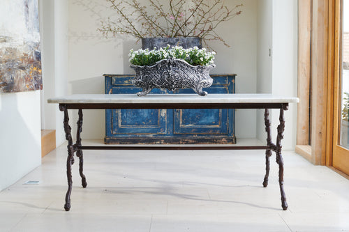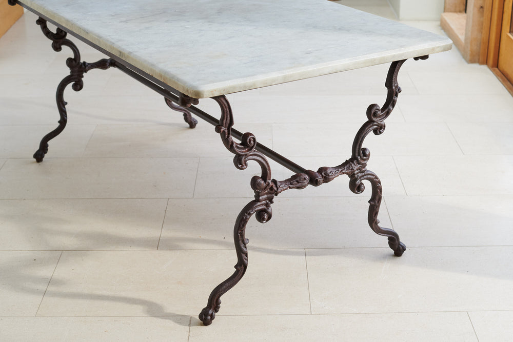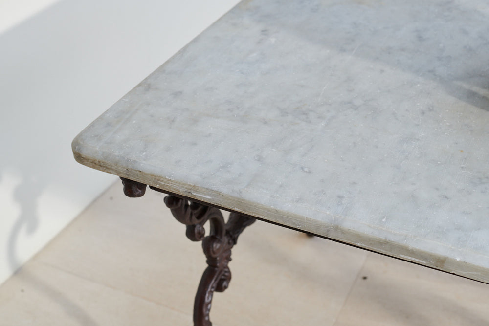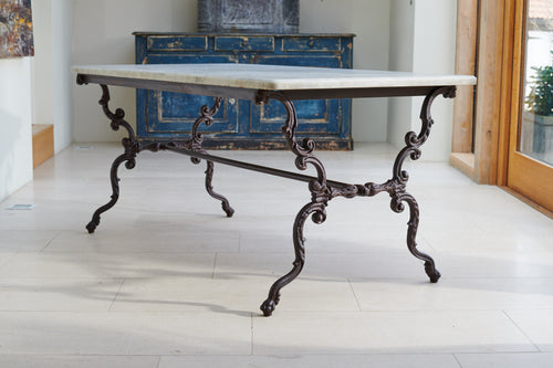 A really substantial 19th-century dining table with its original marble top. The decorative base is made from cast iron which carries a 30mm marble top with ease. The marble is in good condition and has a chamfered edge. The table would easily sit 6 both inside and out.