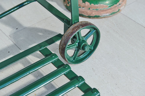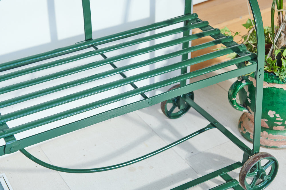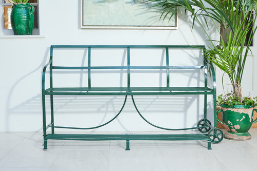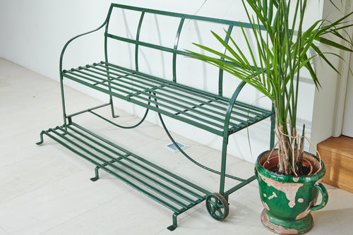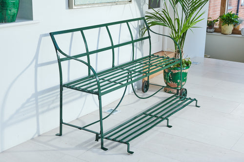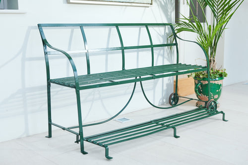 This substantial country house bench was originally made to be wheeled onto a lawn for people to watch croquet and perhaps tennis with their feet and dresses raised above the grass on the drop-down footrest.