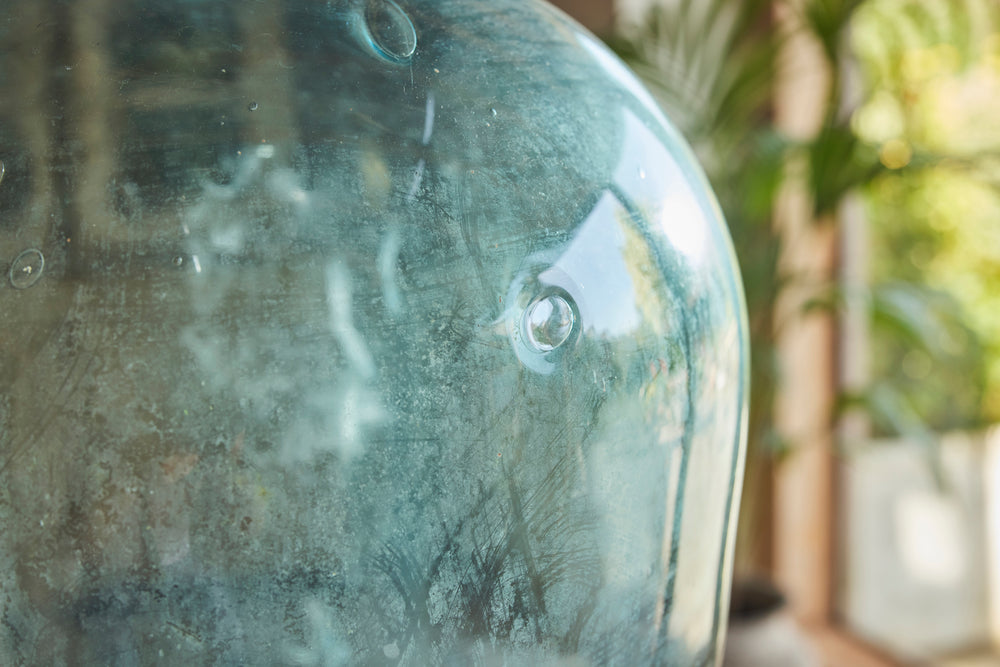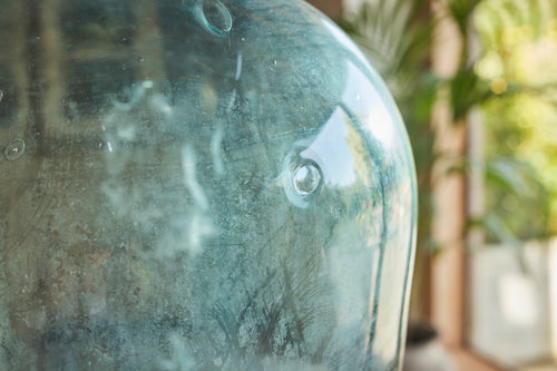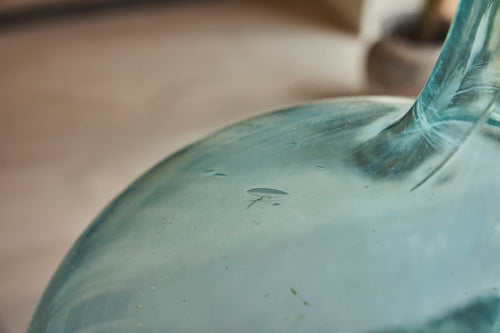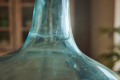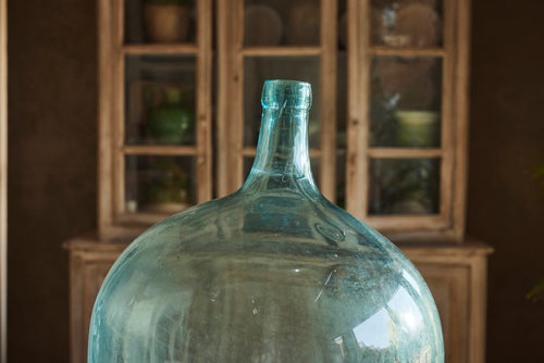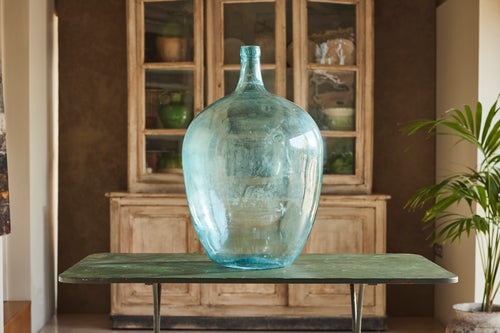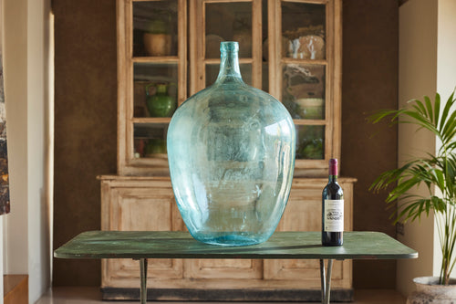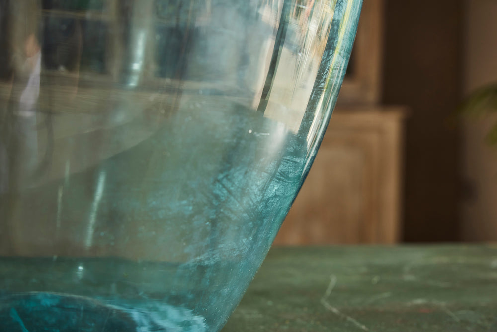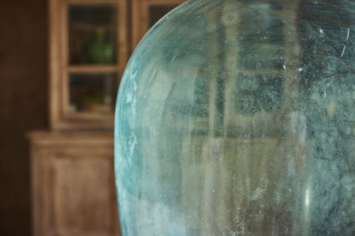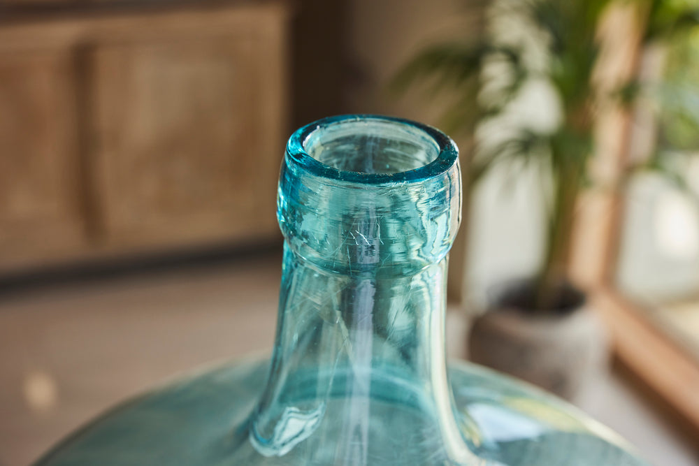 The term demijohn or Dame-Jeanne as it's known in France, refers to any glass vessel with a large body and small neck. Legend has it that on a stormy night in 1347, Queen Jeanne of Naples took refuge in the home of a glass blower in Provence. Nervous at the prospect of blowing glass for the Queen, the Provençal glass blower overdid the blowing, creating an enormous bottle with a capacity of ten litres. When he wanted to call the bottle "Queen Jeanne," the modest queen suggested calling it "Dame Jeanne" instead. This large statement piece has turquoise hue and is in good condition apart from an original imperfection in the neck.