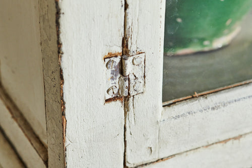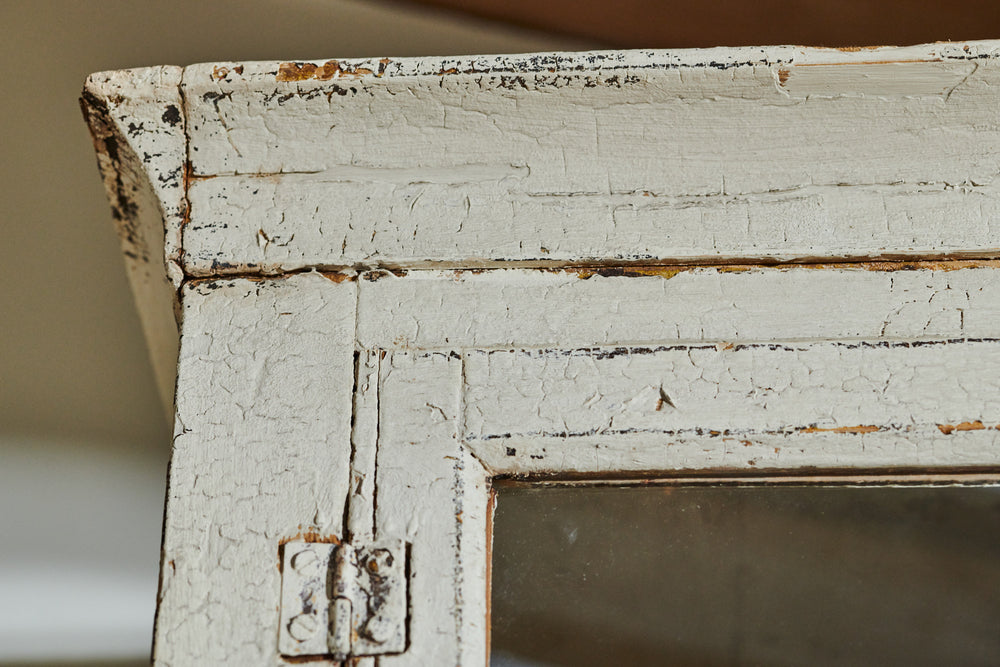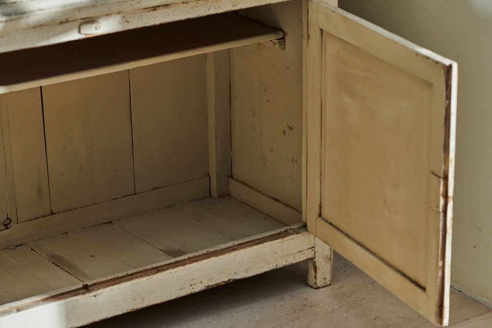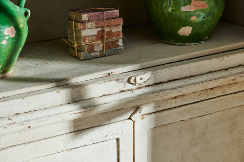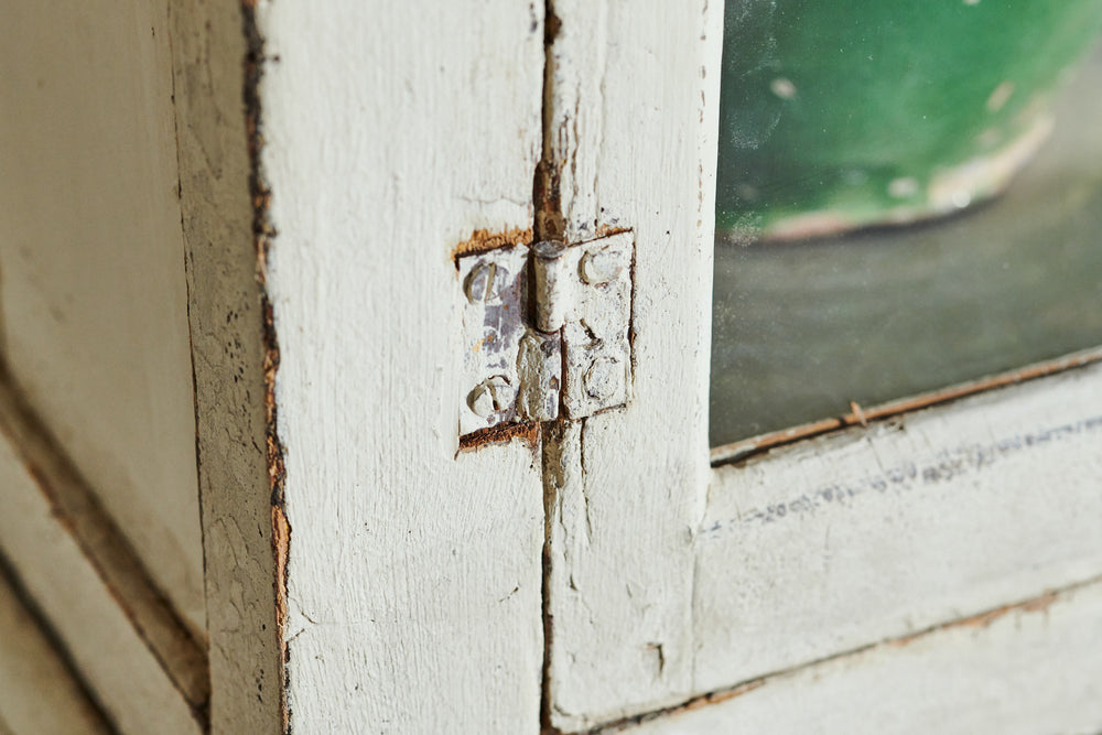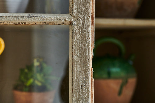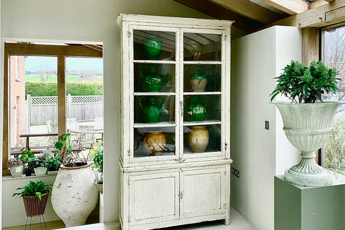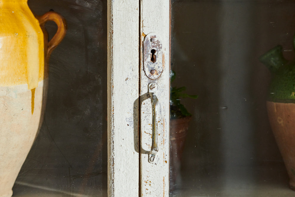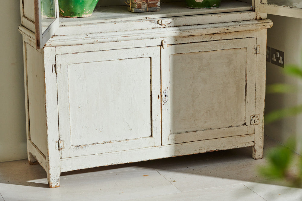 A lovely looking French 18th-century display cupboard that has been dry scraped to reveal an attractive off white aged patina. In two parts with glazed doors with original wavy glass and double cupboard below and whilst it retains its original locks the keys are long gone and have been supplemented with small toggles to keep the doors shut. Made from pine and in good condition, this character piece could be used as a small kitchen dresser or for general storage around the house.