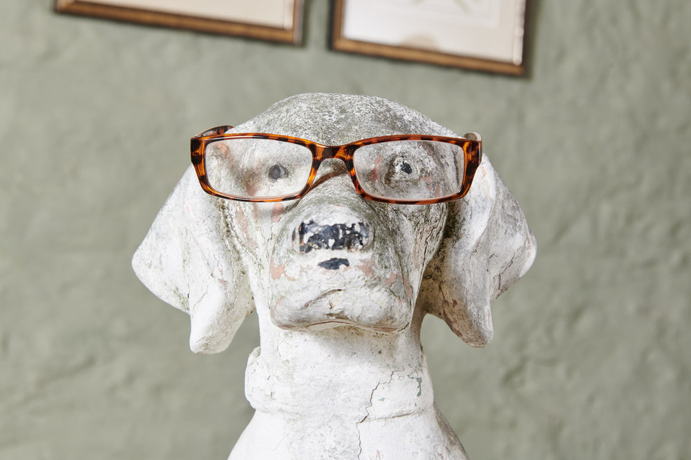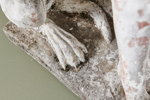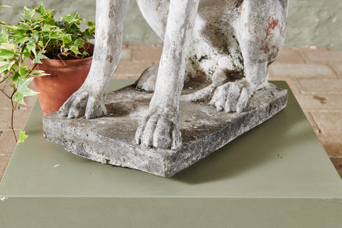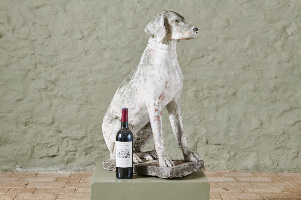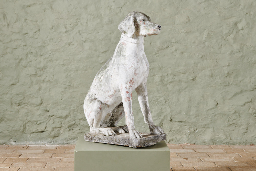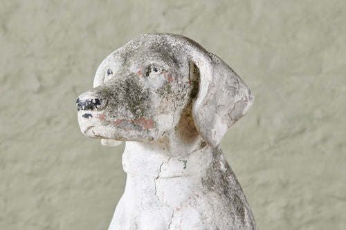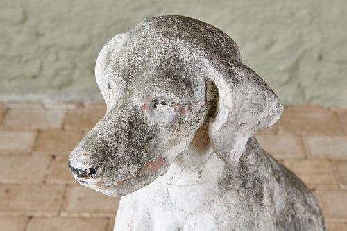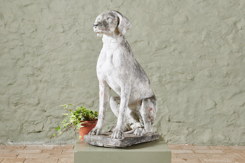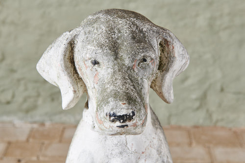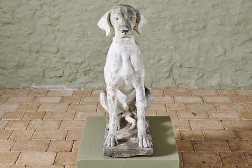 A stunning life-size composite stone dog from the 19th century. In very good condition it has been painted over the years which combined with some moss has created a very attractive patina. He would look great in any garden with the design probably based on a Hungarian Vizsla or a Pointer.