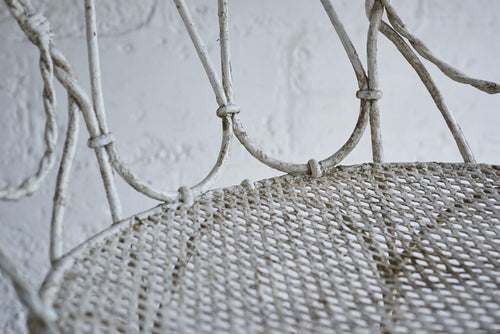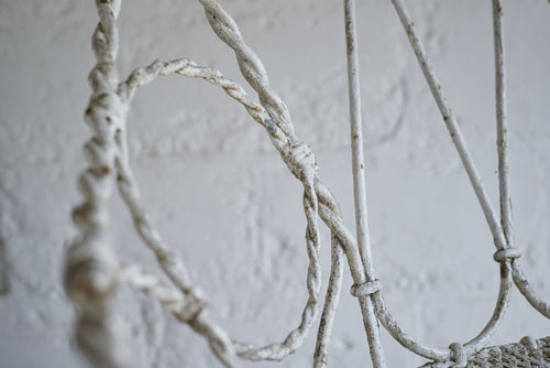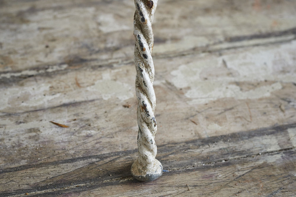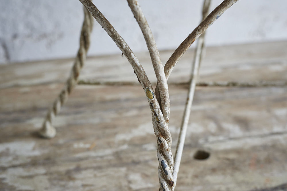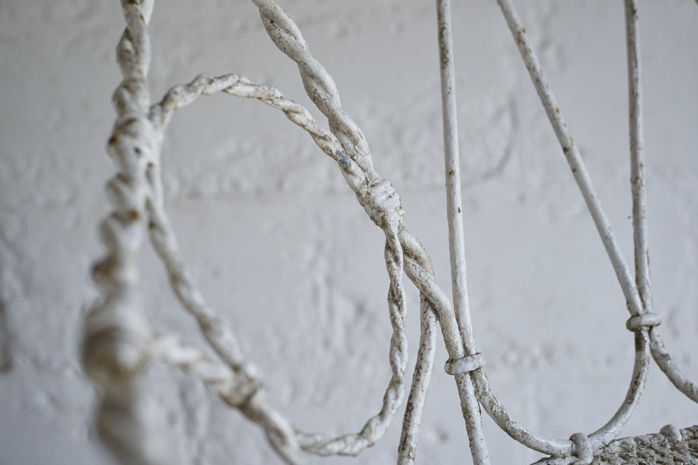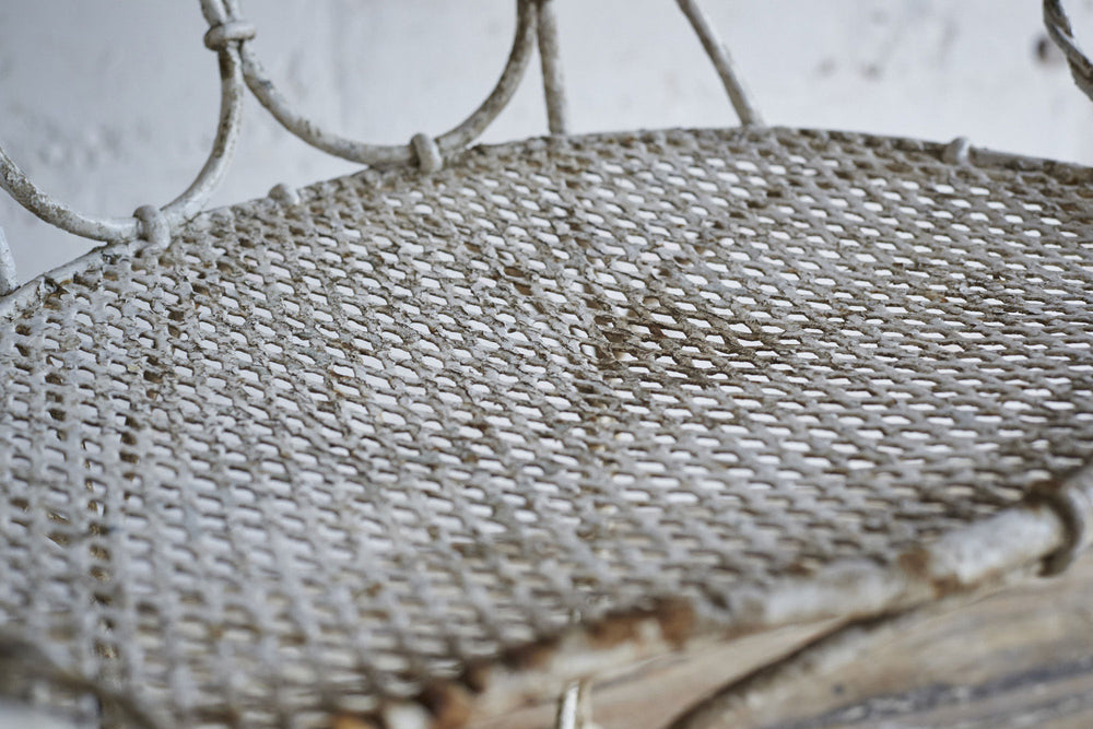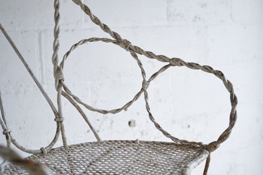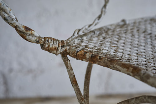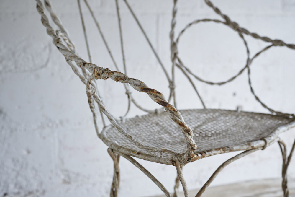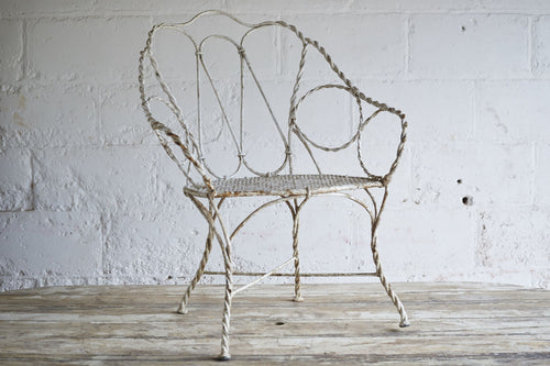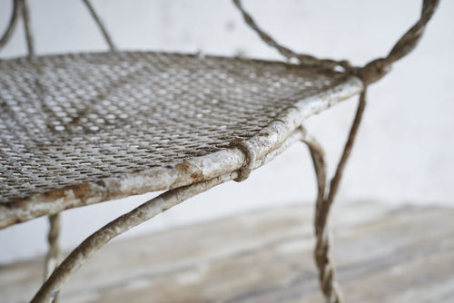 All joints are fixed with clips as it was handmade prior to the widespread use of welding or riveting. The metal would therefore have been heated and twisted to form the rope shaped legs and the decorative features.It has a hand punched mesh seat.