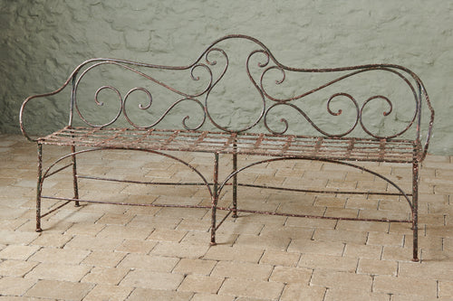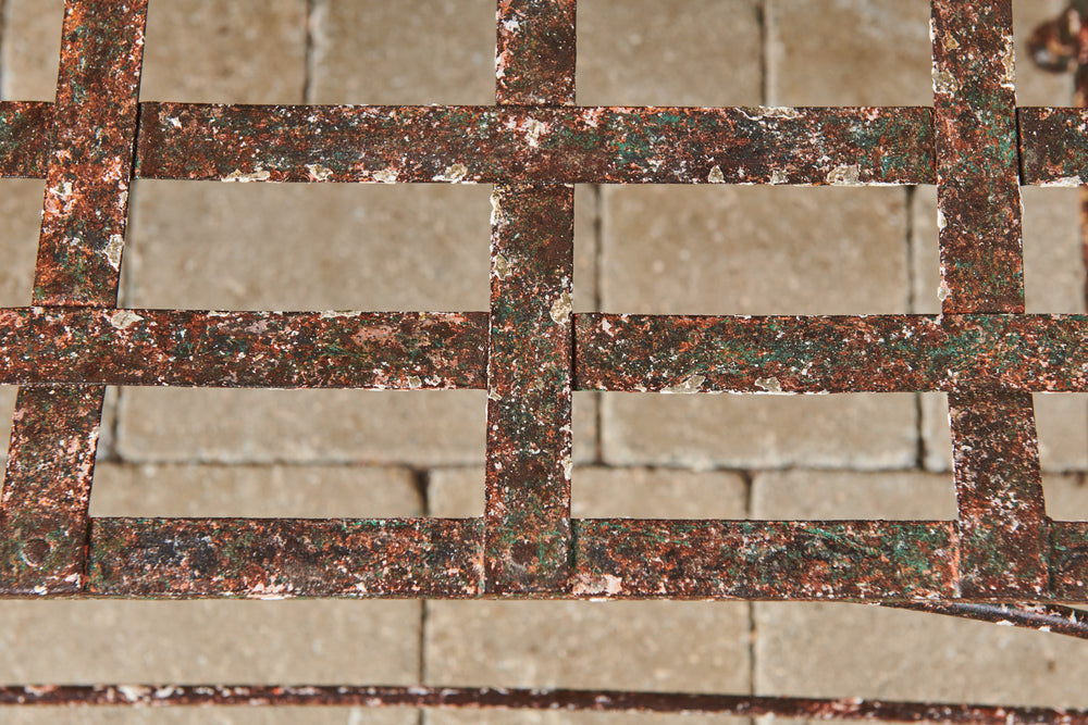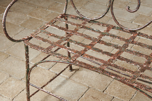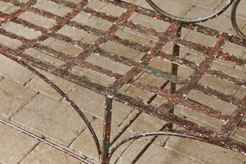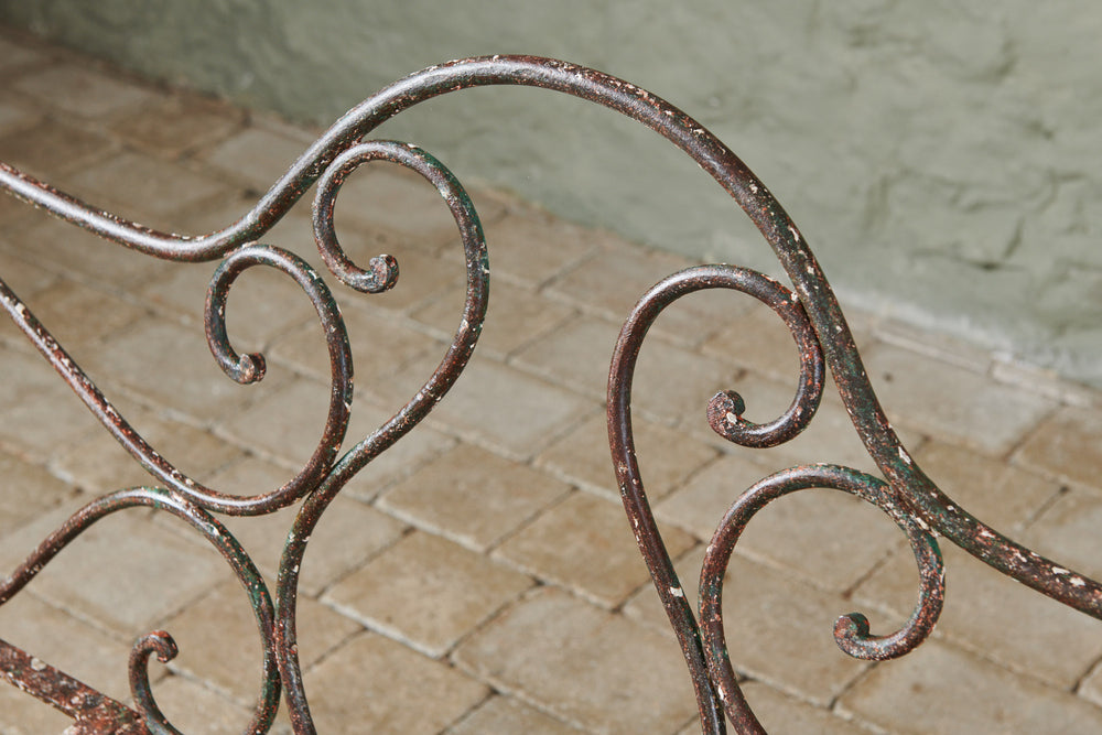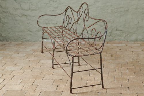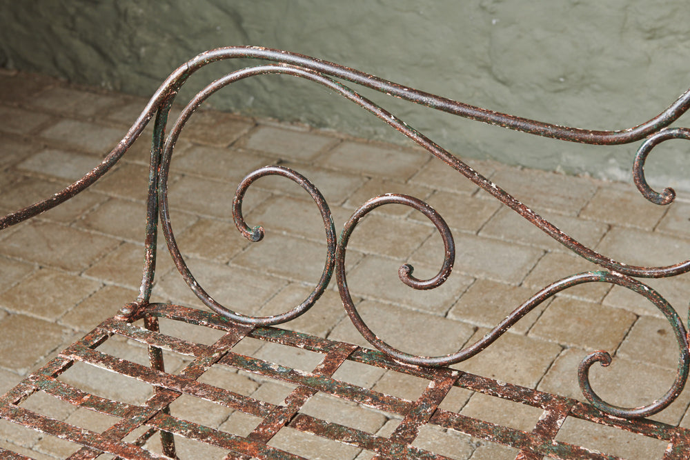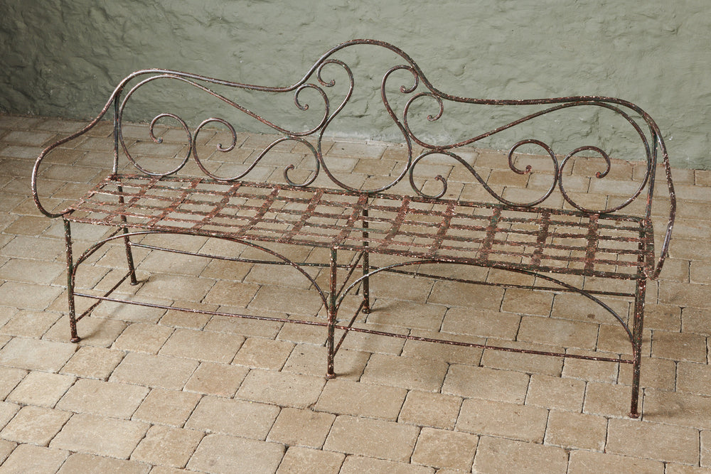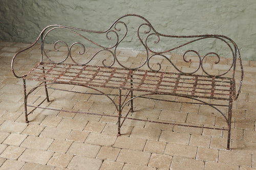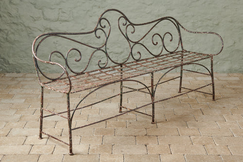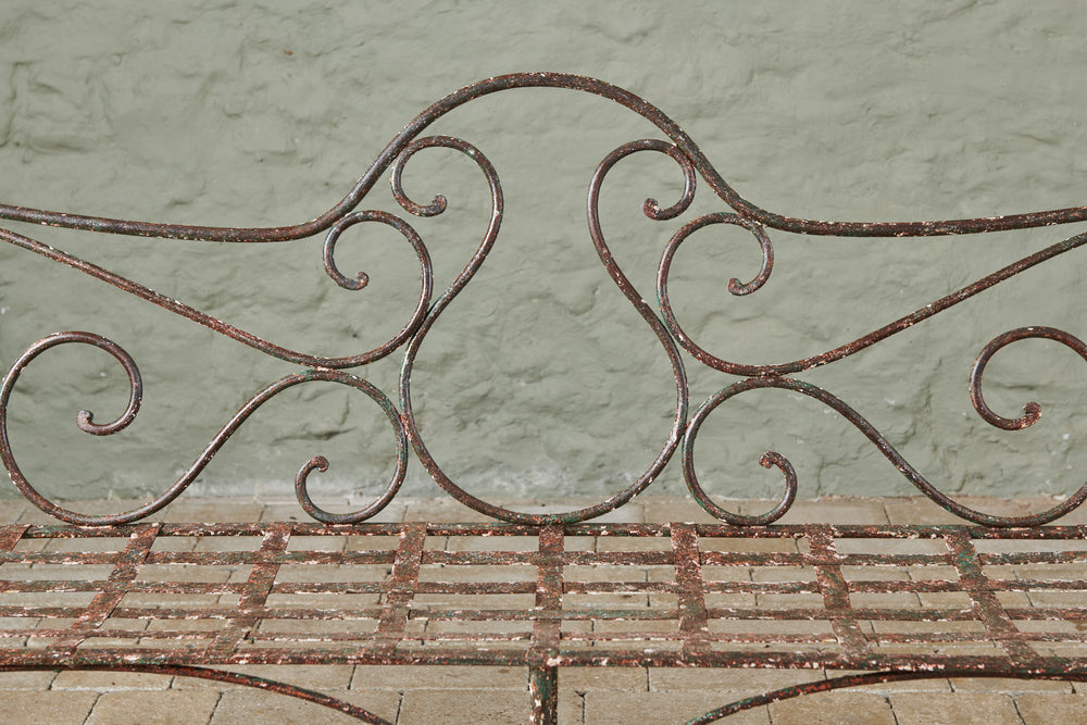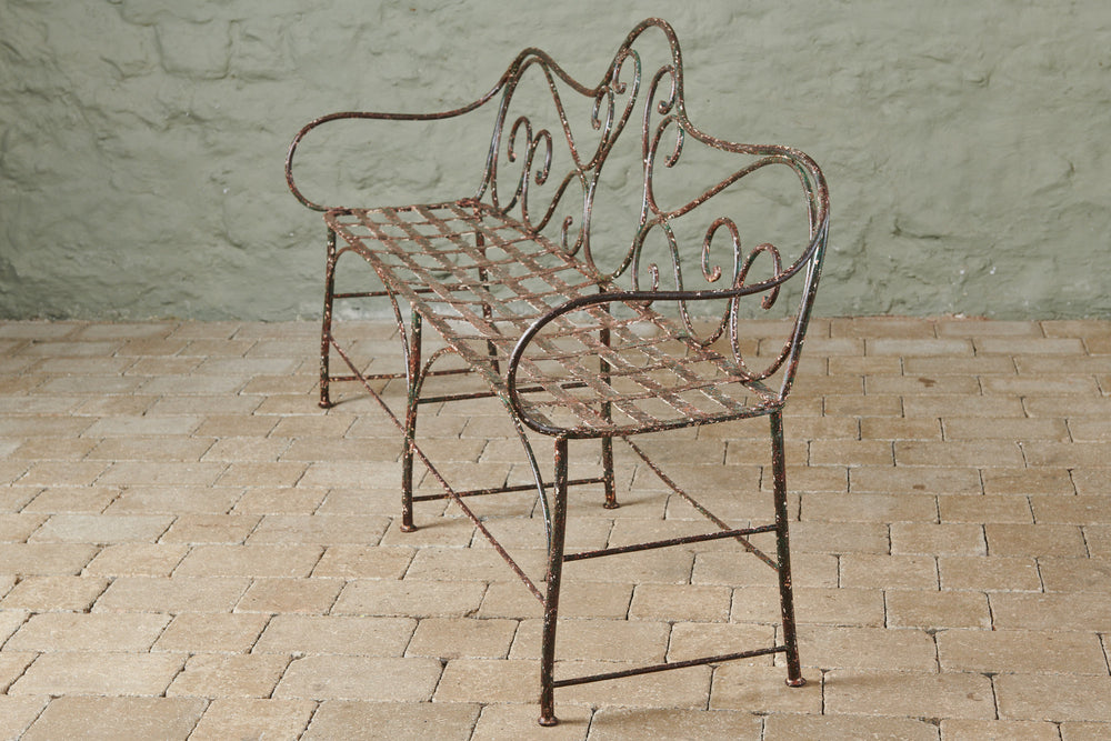 We bought this beautiful bench in Paris just before the lockdown. It was covered in loose and flaking paint and was crying out for some tender loving care. Once we had removed all the loose and flaking paint we were very pleased to expose a fantastic patina. The attractive frame and back are hand-forged in wrought iron. The seat is made from crisscrossed metal slats and the entire bench is riveted together as construction was before the advent of welding. A very genuine and original piece.