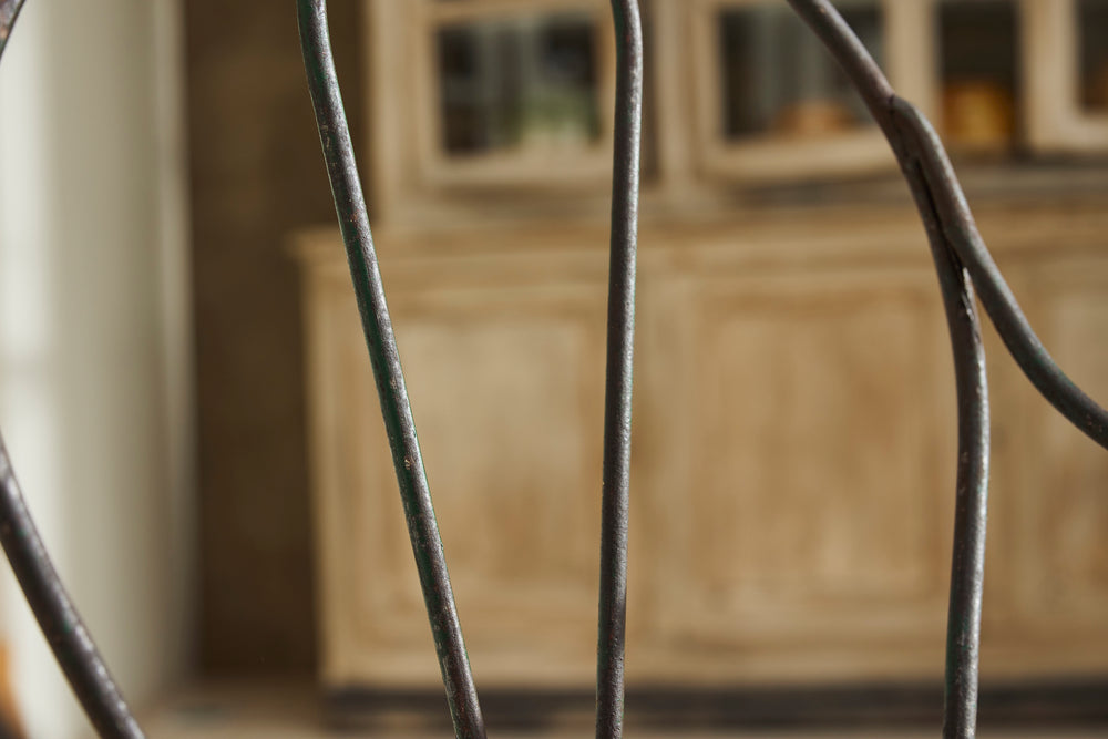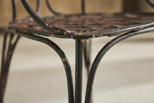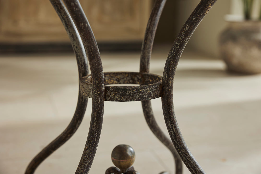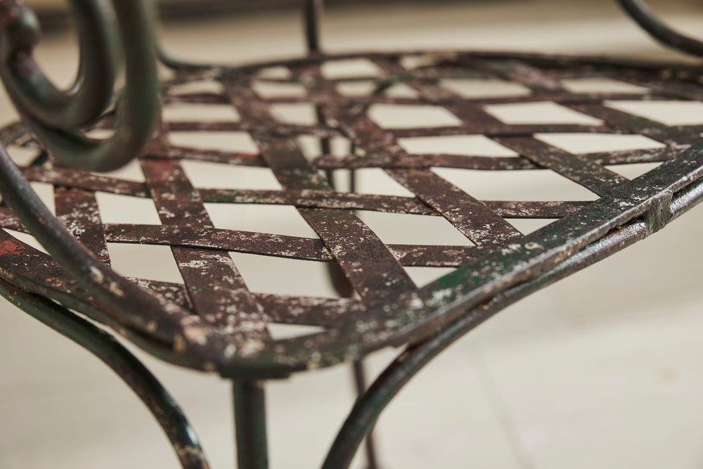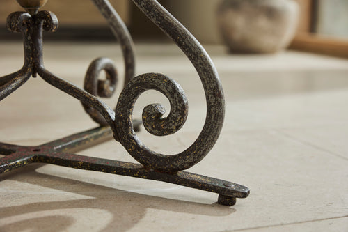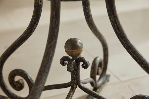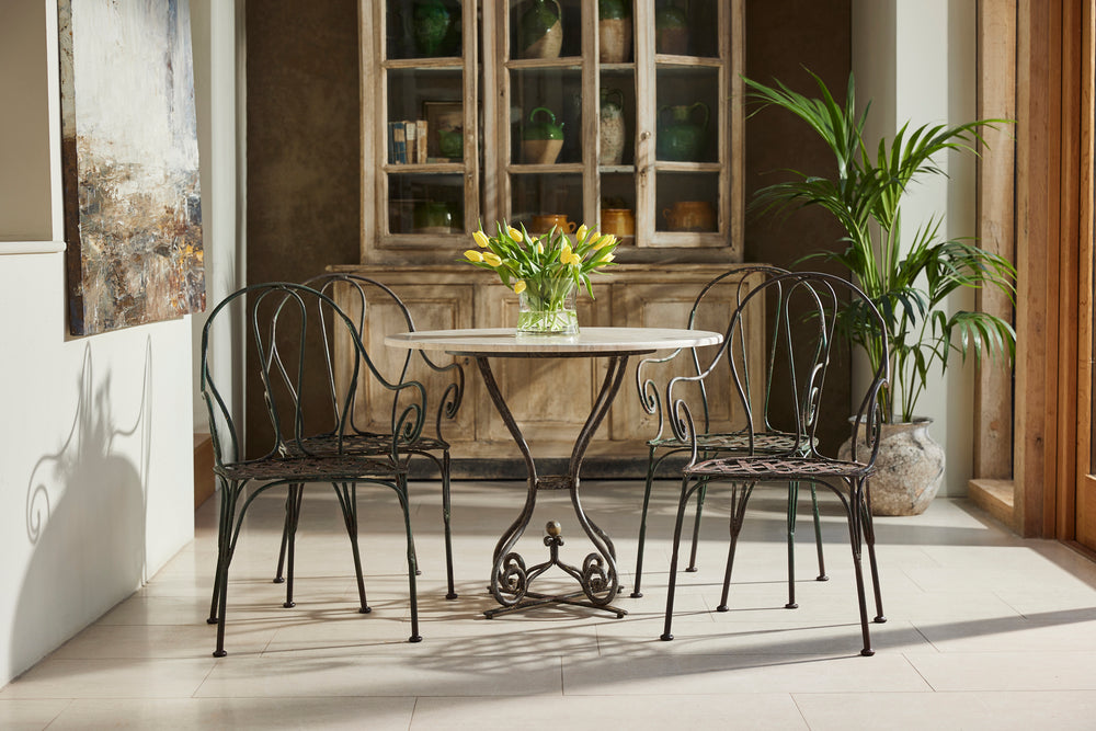 This exceptional mid-19th century dining set in original condition is a very rare find from the hilltop village of Menerbes in Provence. You can tell it was hand forged as the chairs are all very slightly different sizes with everything being either forged, clamped and riveted together. You can see traces of the original paint throughout both the table and chairs which we have now sealed to preserve the attractive patina and protect the set from the UK weather. The only new addition is the marble top. The original perished and has been replaced with a new piece exactly the same size as the old.The whole set is in very good condition and comfortably sits 4 either inside or out.