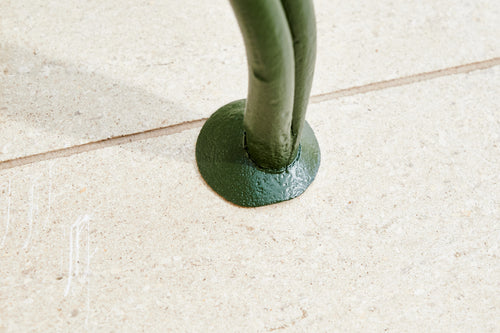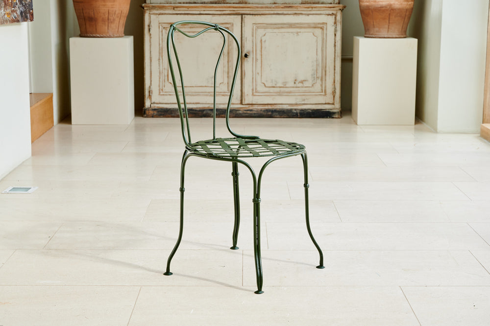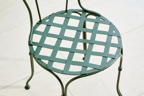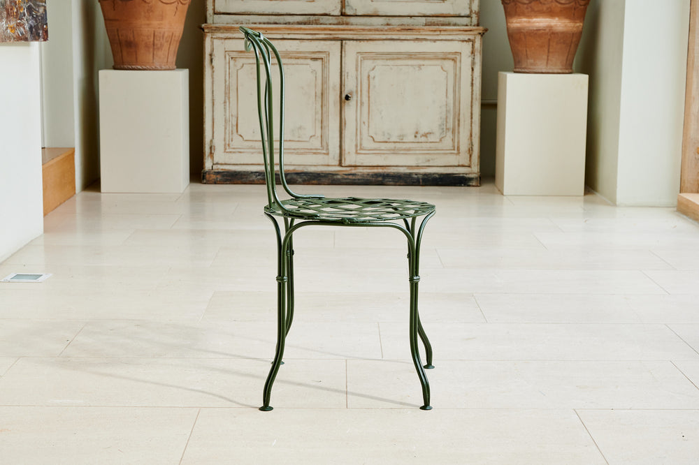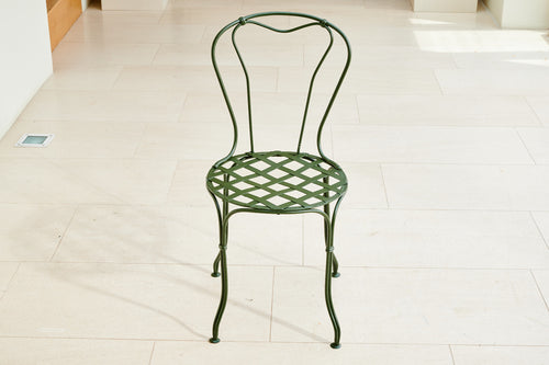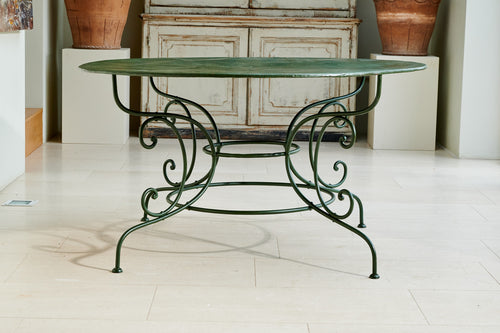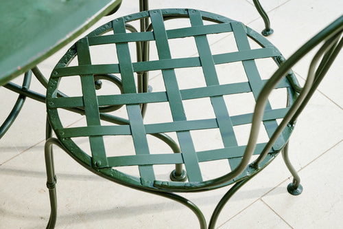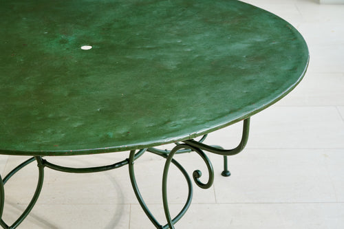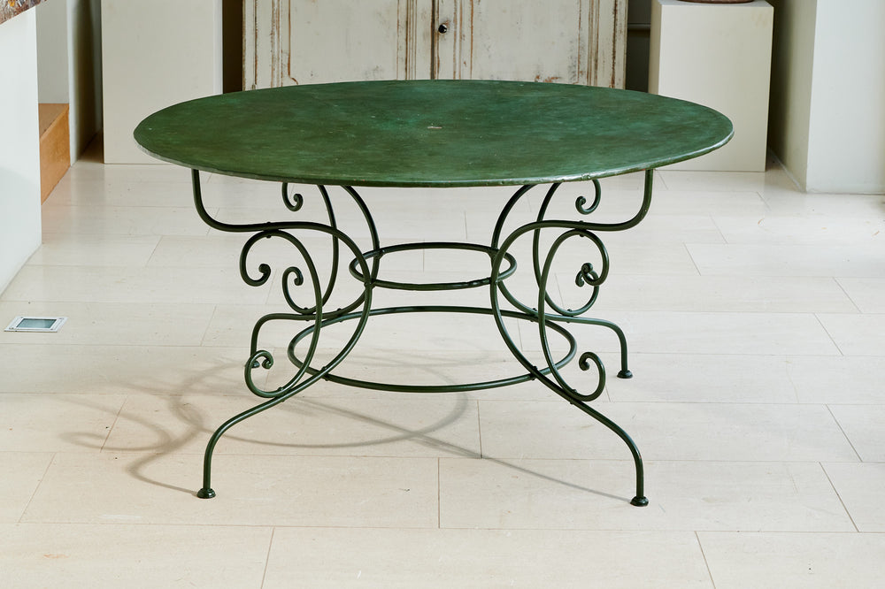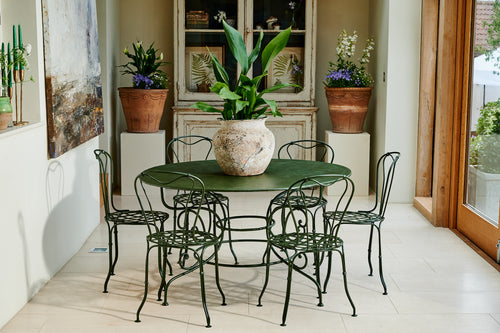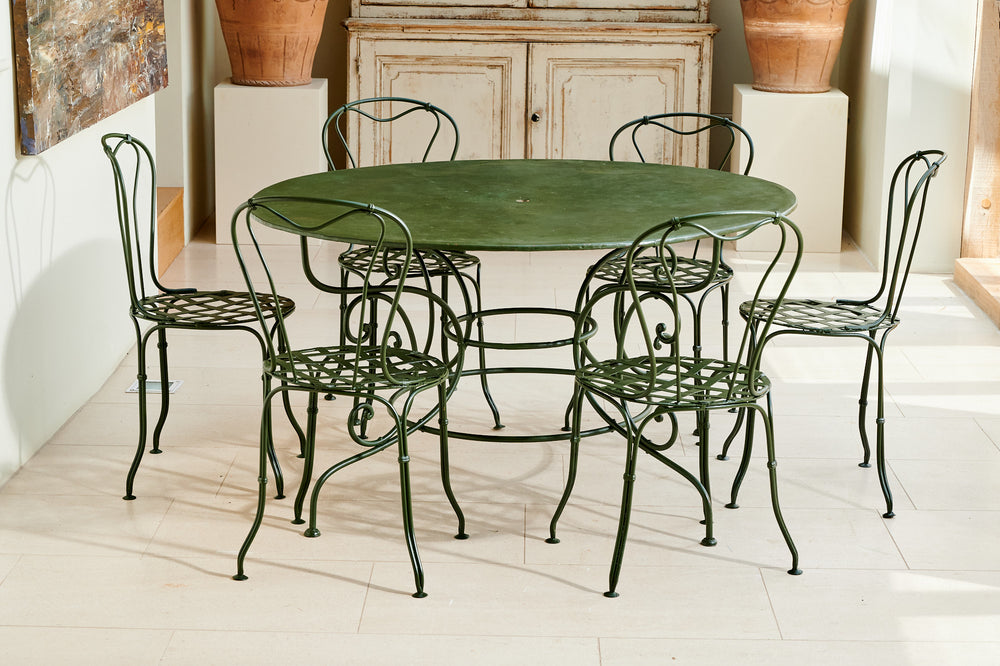 A French garden table and chairs from the late 19th century. When preparing the table a fantastic green patina was revealed after the old peeling top layer of paint was removed. The six chairs from the same period have been restored to complement the patina of the table to create a very attractive, functional and unique garden set.