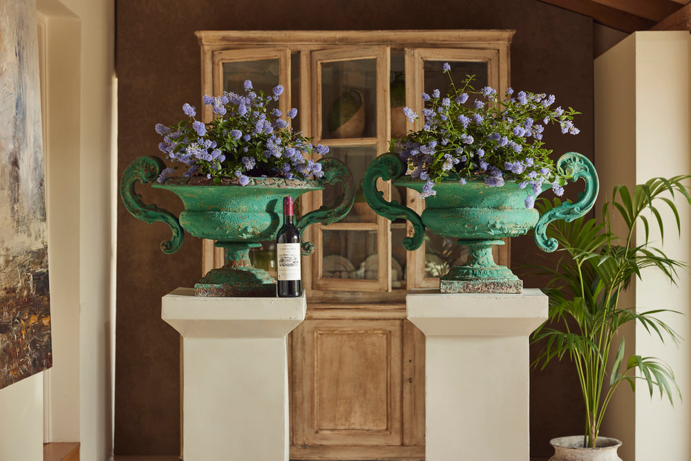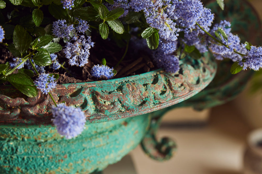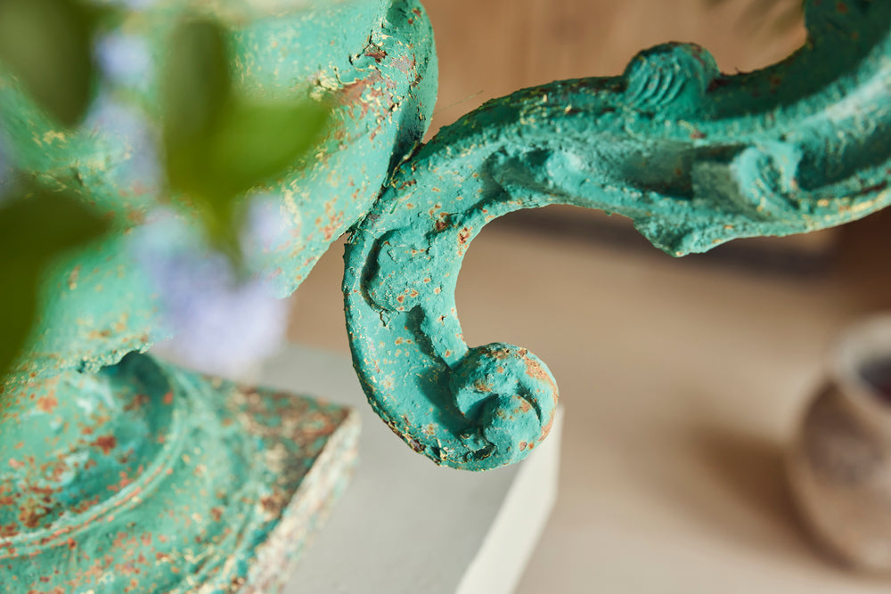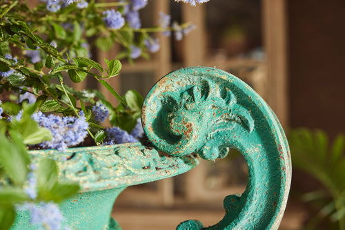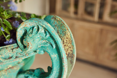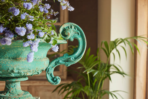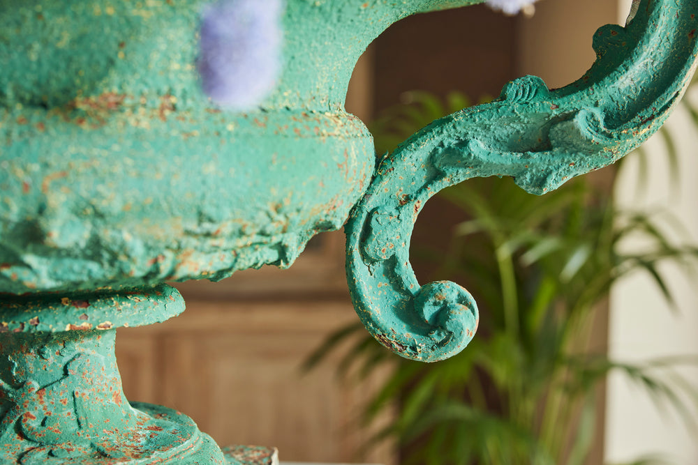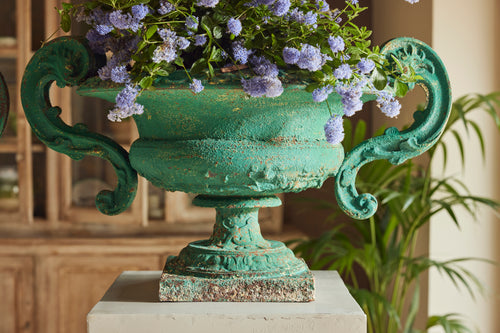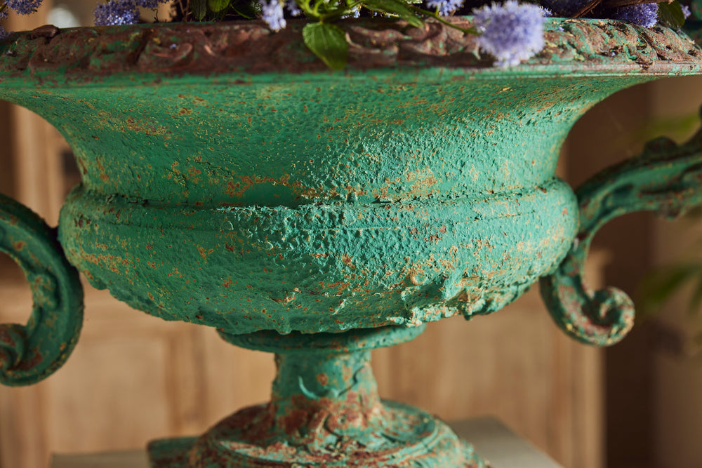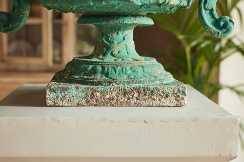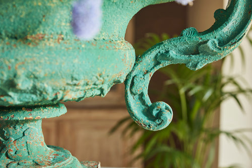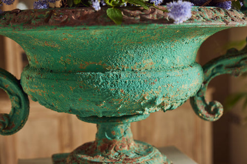 What we really love about these substantial urns is the fantastic colour that has developed after years of weathering. The vibrant but totally natural painted green patina could form the foundation for wonderful contrasting planting ideas. Made for cast iron in the late 19th century these urns are in very good condition and feature wonderful curved handles on each side further enhancing their appeal.