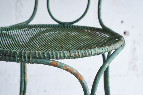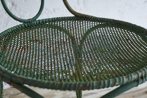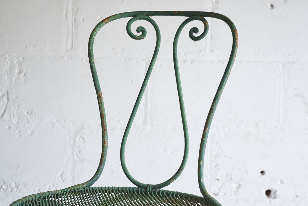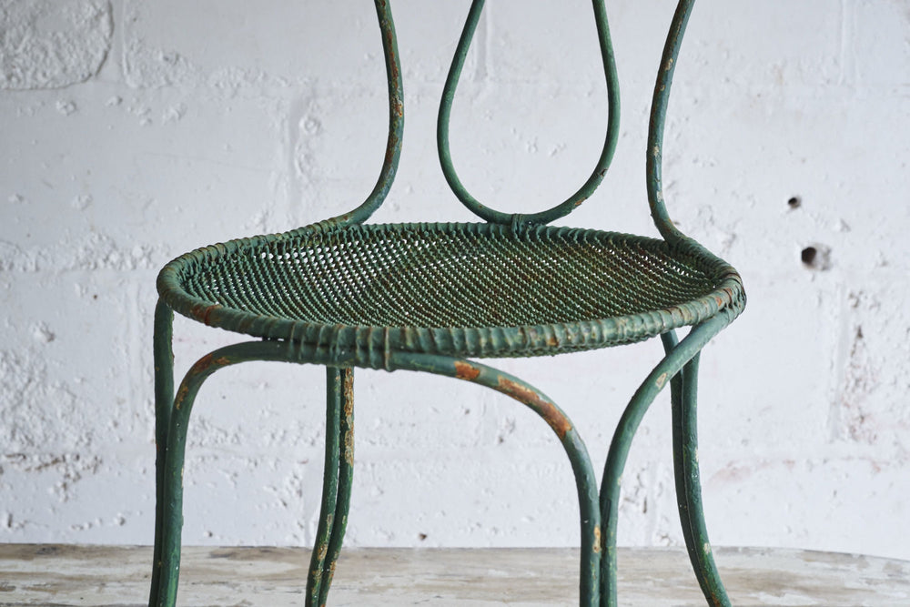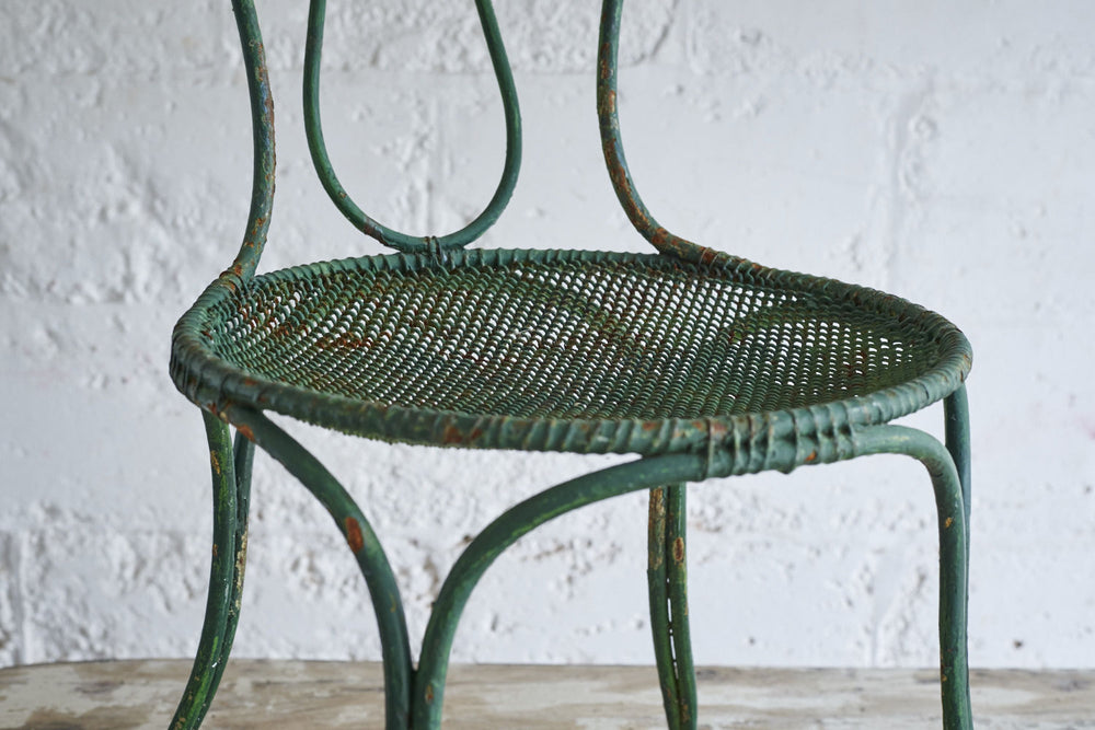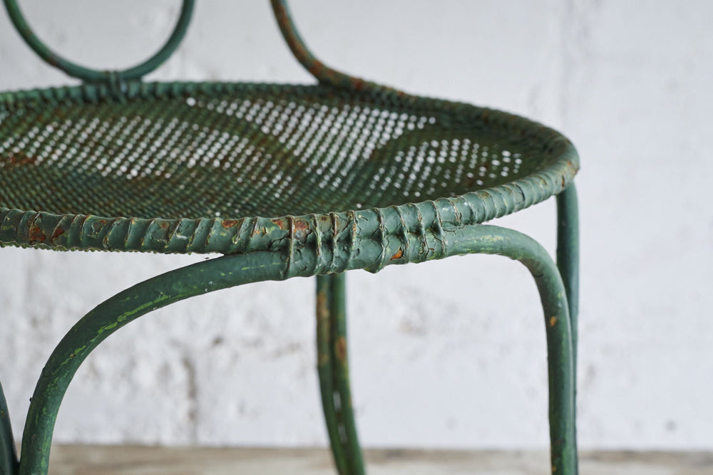The chairs have hand-forged wrought iron backs and mesh seats. The parts are clipped and riveted together as they were made before welding was widely introduced. They are particularly heavy, which indicates their authenticity.