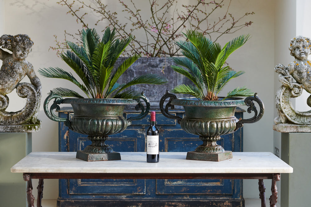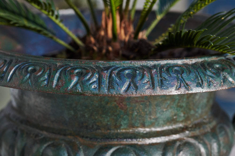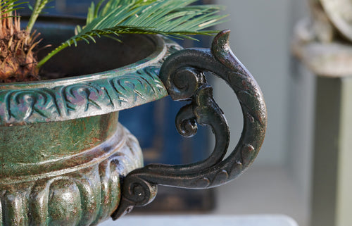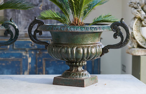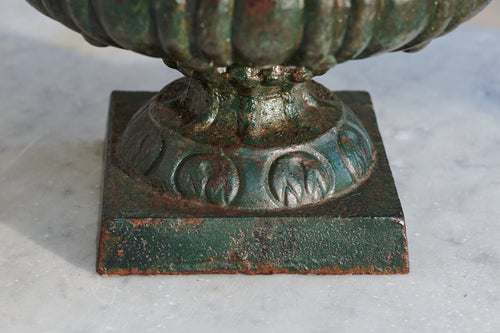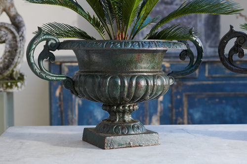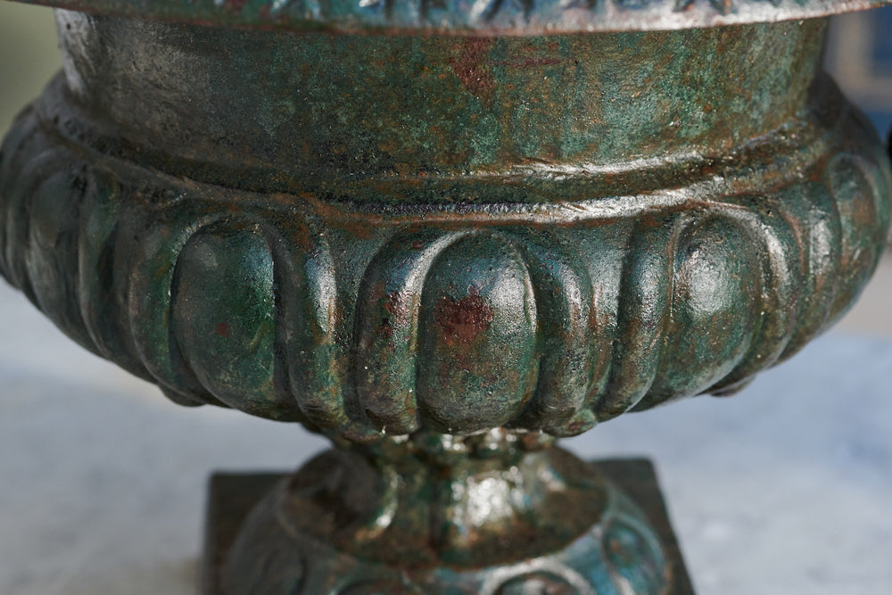 When we cleaned these we were amazed at the fantastic green patina we found beneath years of dirt and grim A pair of good-sized 19th century cast iron urn which would suitable for planted seasonal flowers or a small shrub. The lovely patina would make them suitable for use inside the home as well as the garden.