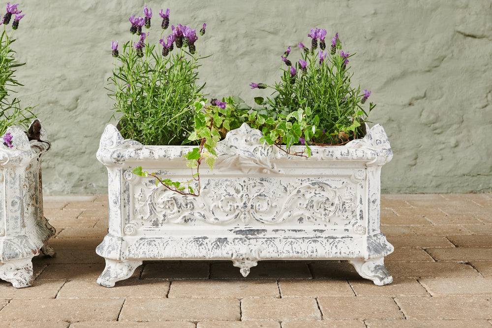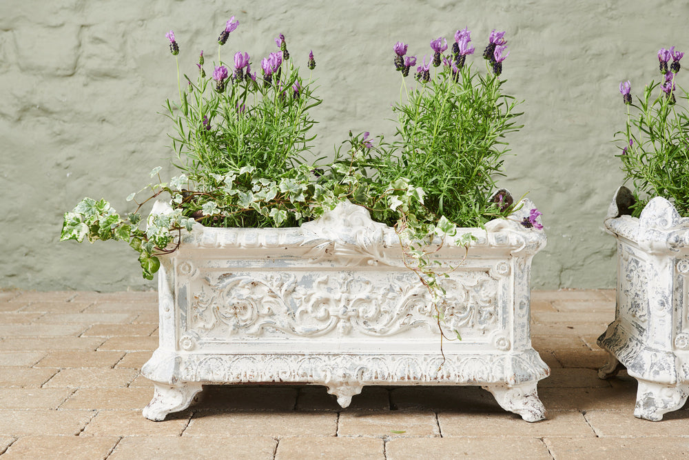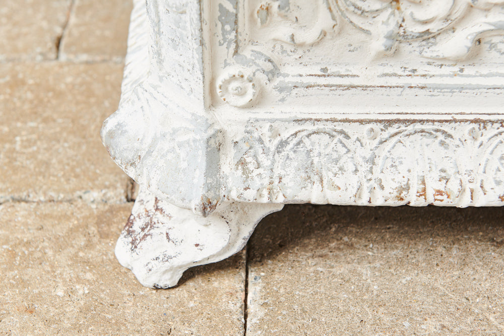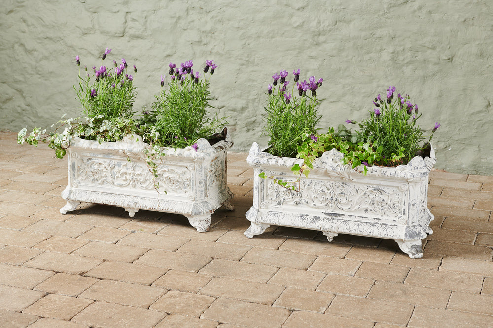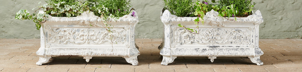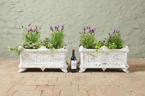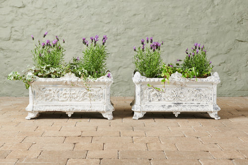 An interesting pair of cast iron jardinieres from the North of France. They are attractively designed and have a faded and attractive painted patina. They could be used inside or out and are deep enough for seasonal planting or to incorporate house plants.