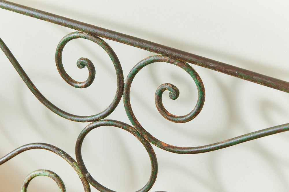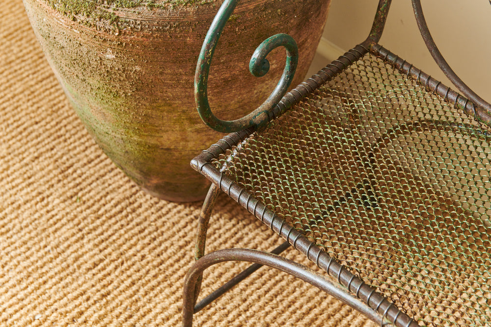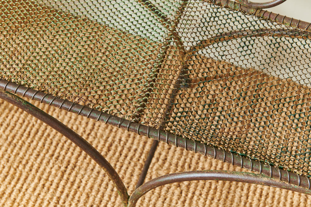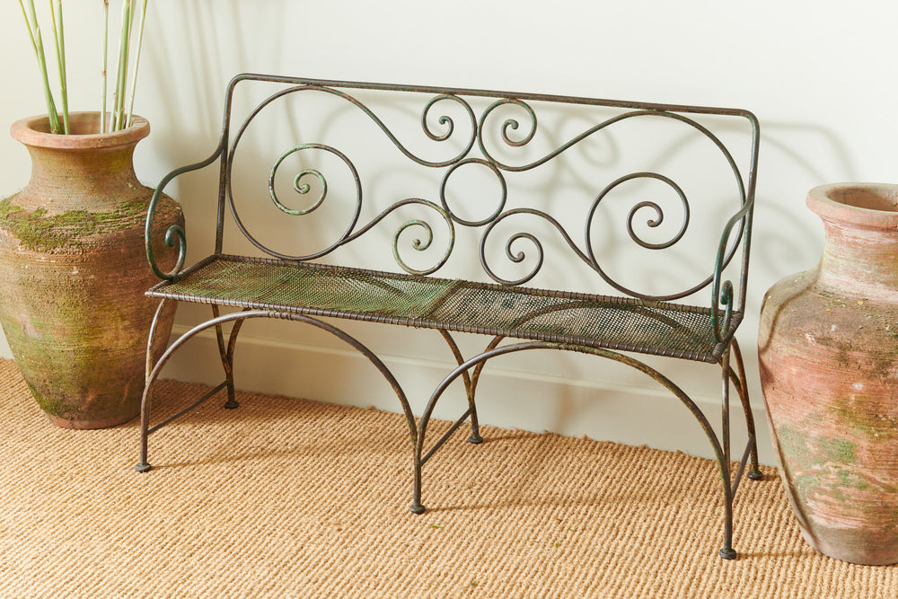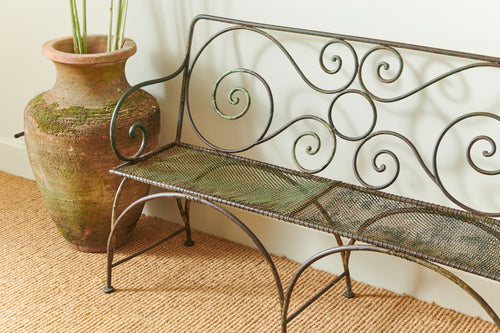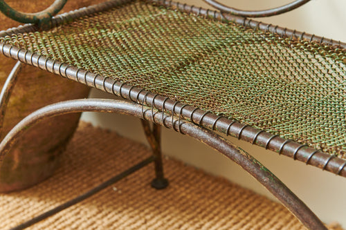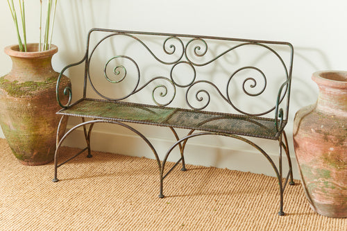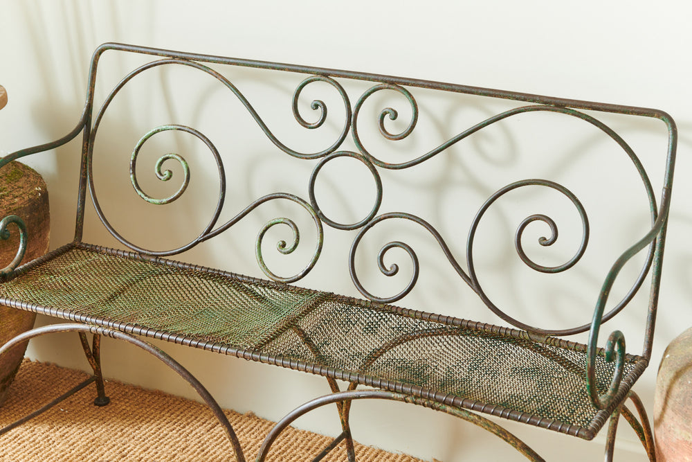 This delightful ladies bench is as irresistible as it is completely original. It is so pretty with a hand-forged scroll back and curved arm. The seat is made of mesh and is in unusually good condition considering age and use. Would look as good in the garden as it does inside the home complementing soft furnishings.