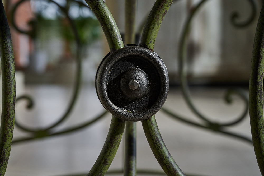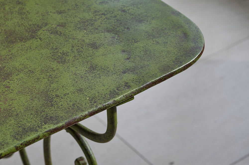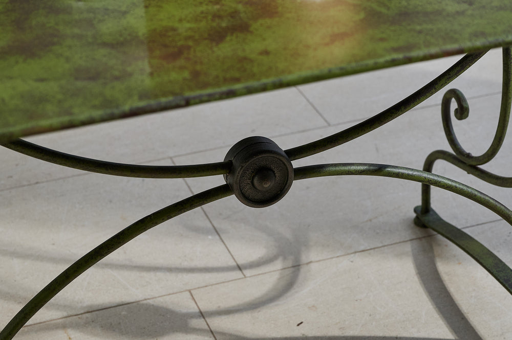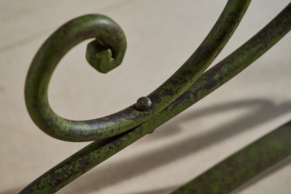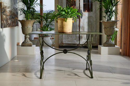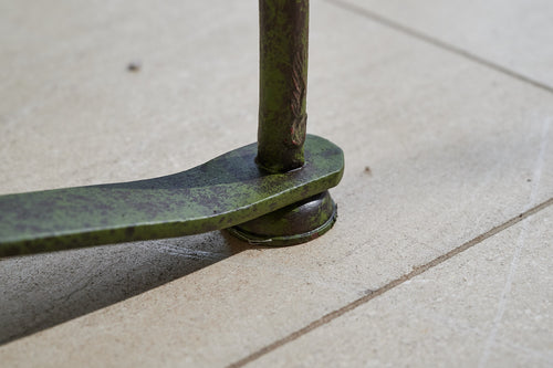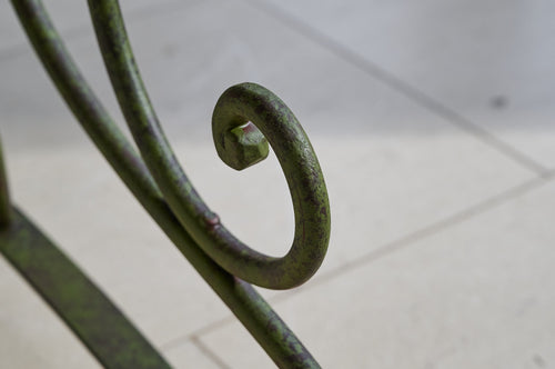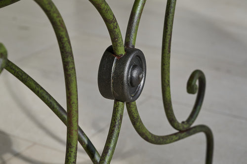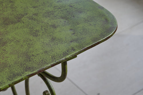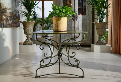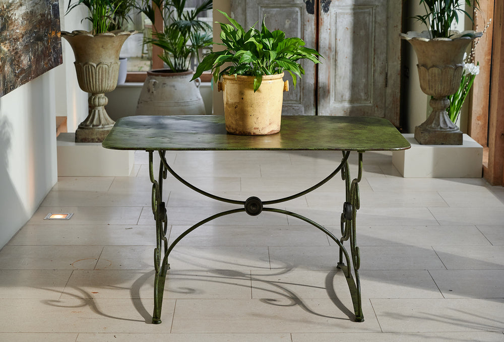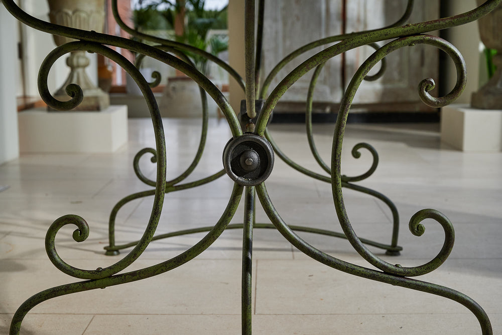This increasingly rare 19th-century French table is named after the macaroon shape of the lead features which join together the beautiful hand-forged curved base. During the restoration, we removed all the loose and flaking paint which uncovered a very attractive and original patina that we have sealed to preserve it for the future. This table has many potential uses. It would sit an easy 4 and is the correct height for dining. It would also make a very unique side or hall table.