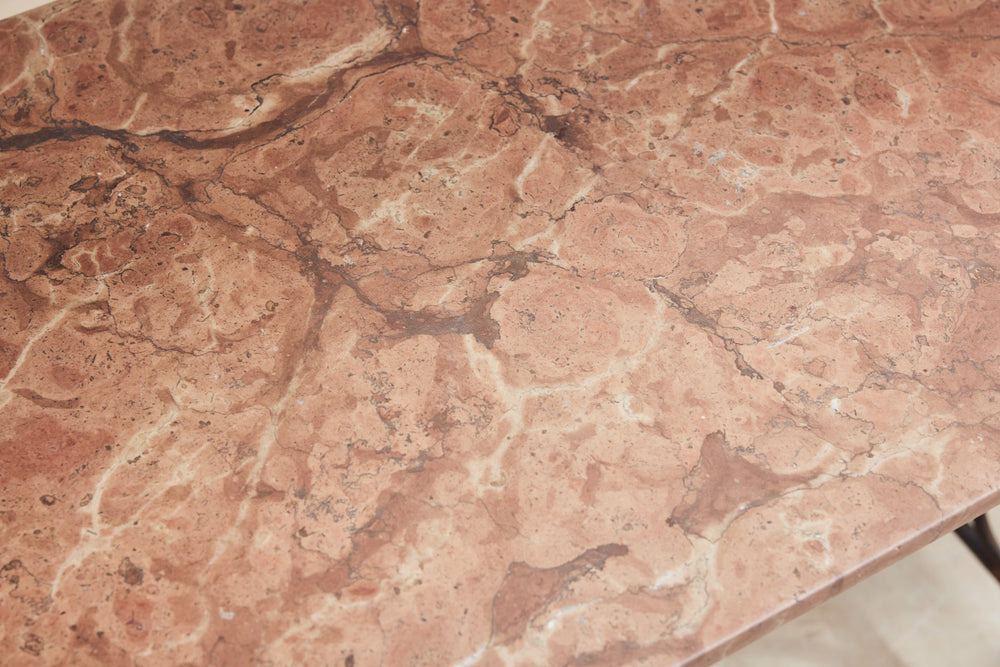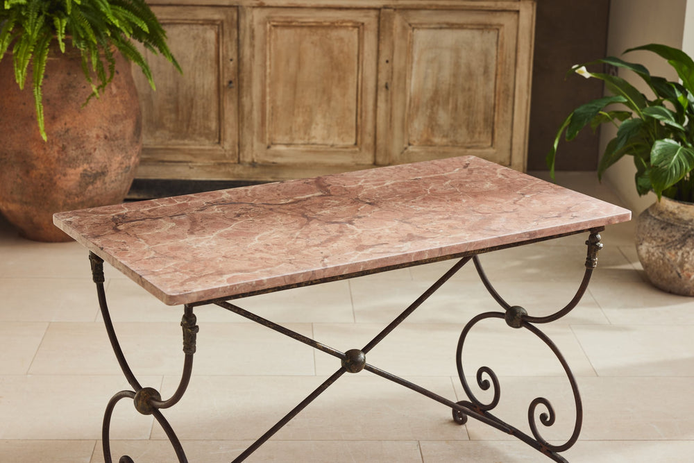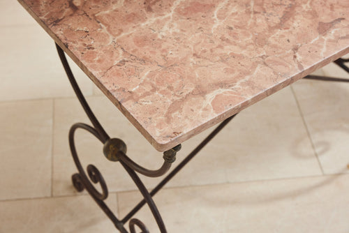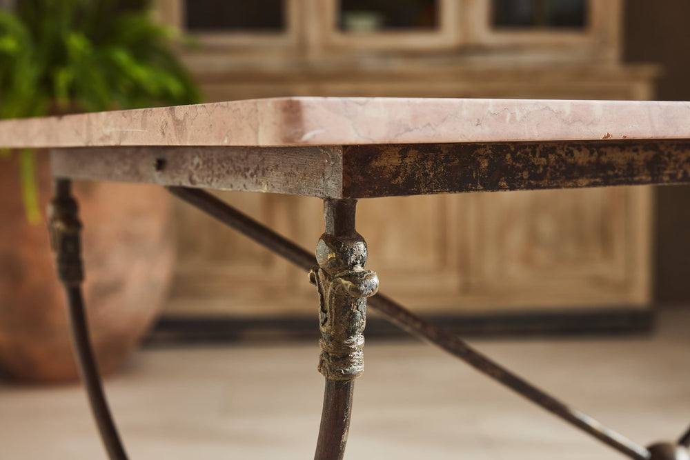 Hand-forged wrought iron table with bronze detailing at the joints and decorative points across the frame. The original 19th-century marble top is a deep, refined burgundy colour with natural veining, in excellent condition with no cracks or damage.