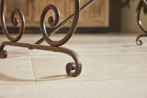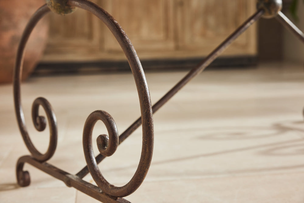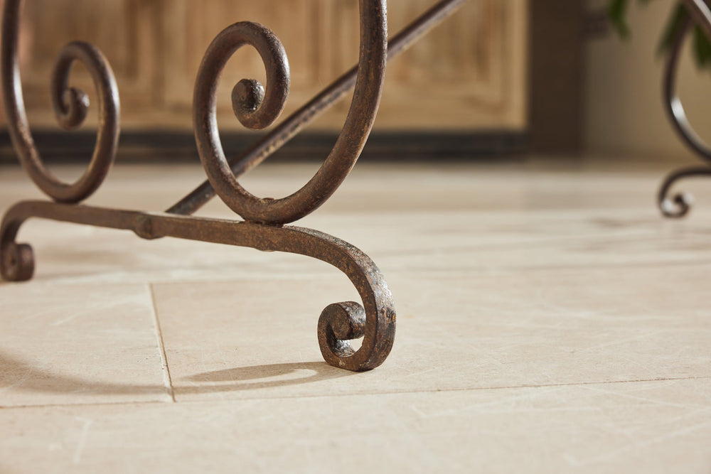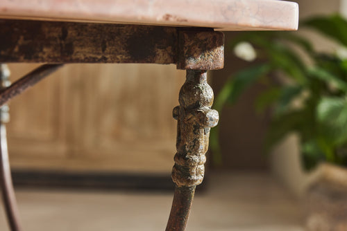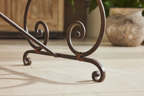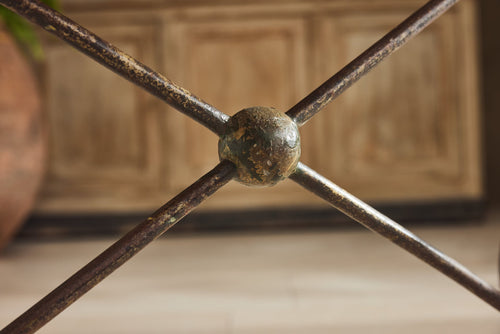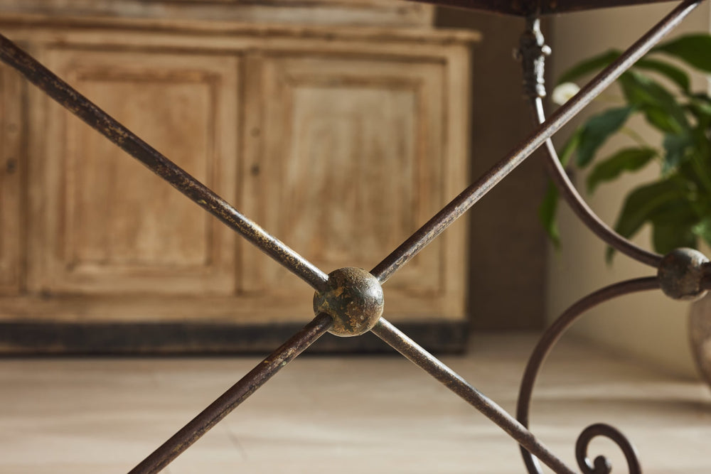 Set at dining height, it will comfortably seat four, though it also works well as a substantial side or display table for plants, flowers, or seasonal arrangements. The iron frame retains its original finish and patina, showing quality workmanship and age.