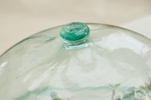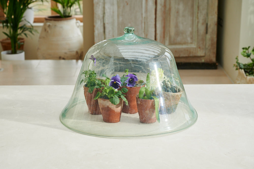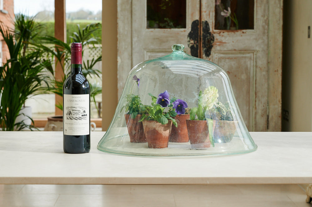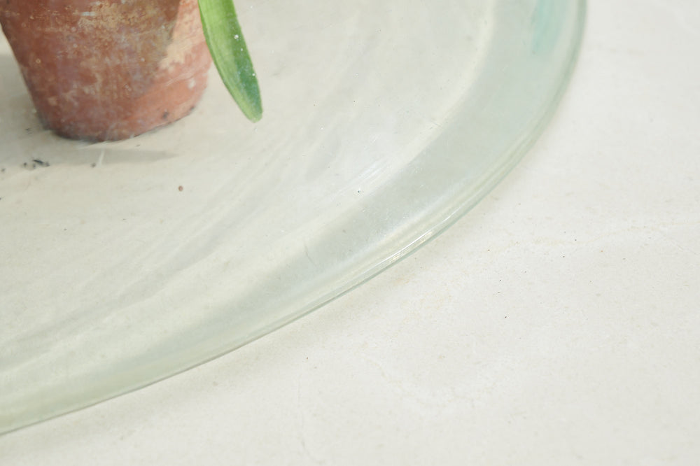 A large hand-blown glass melon garden cloche. Formed as a single piece of clear glass with a unique and irregular form and imperfections that add to its originality and charm.