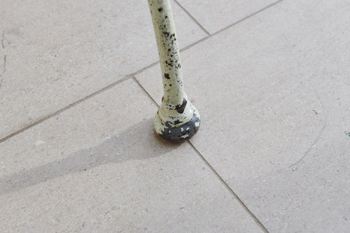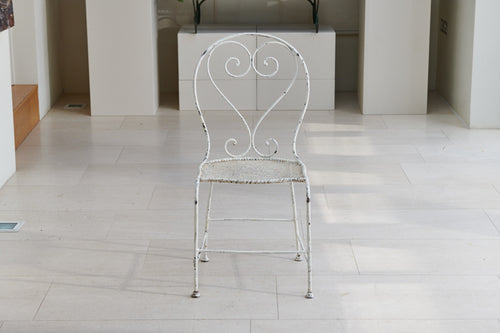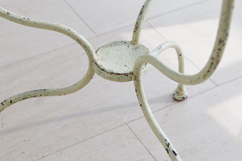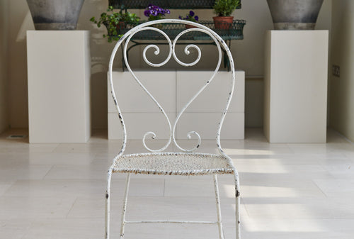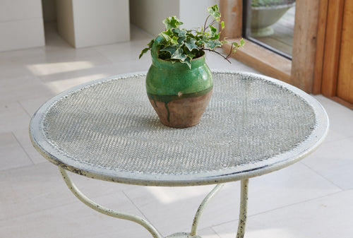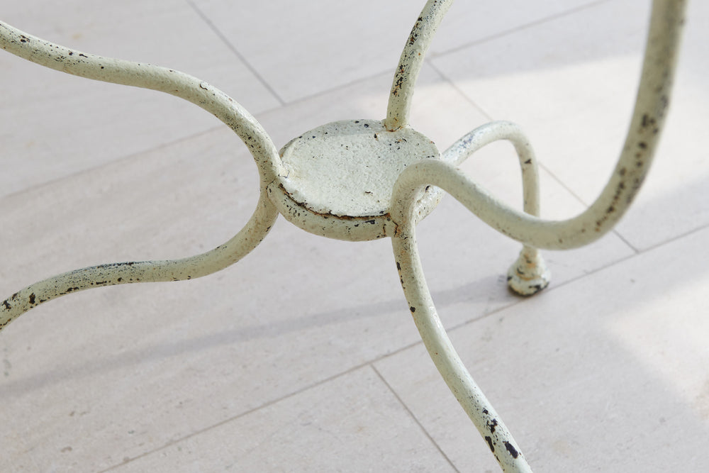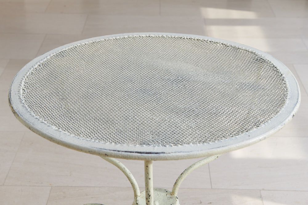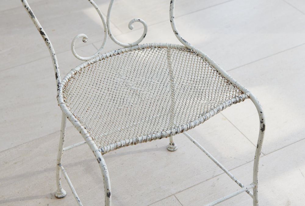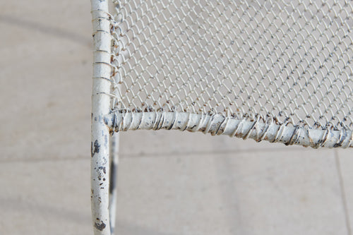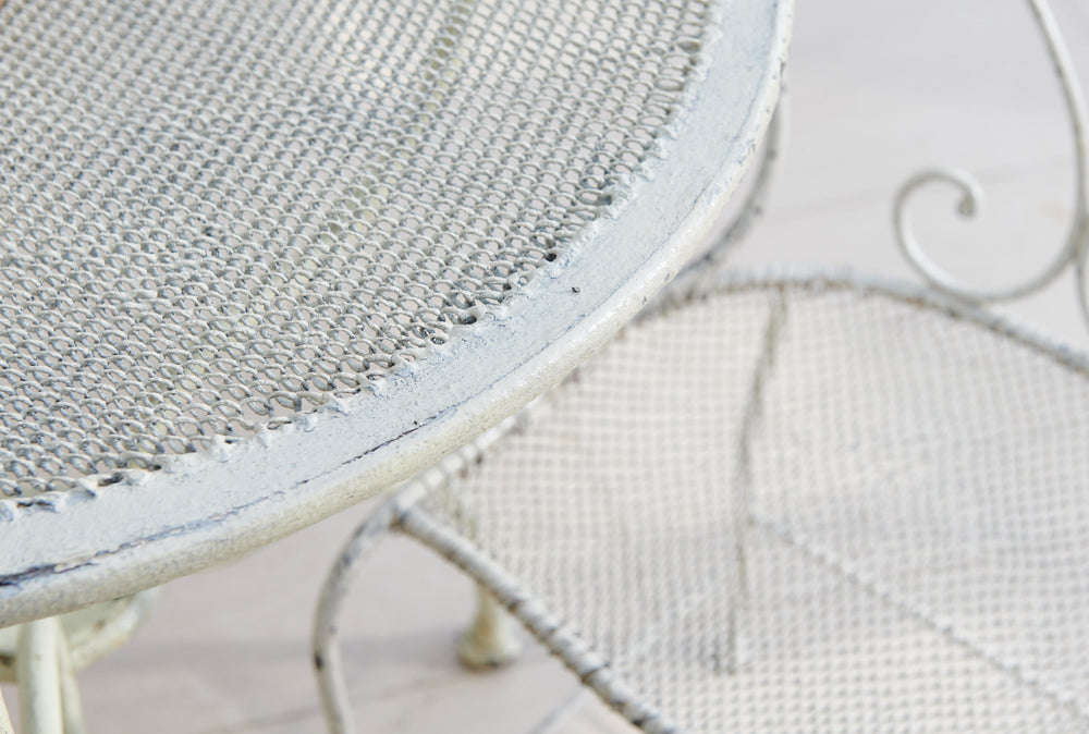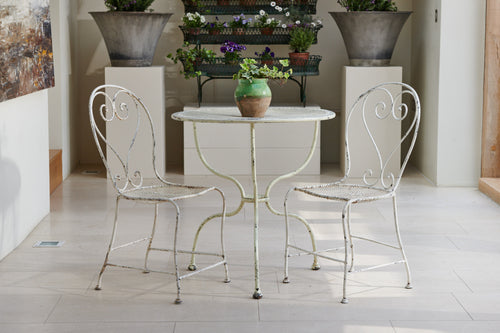 An early and rare 19th-century Bistro Set featuring two chairs and table which have metal chain link seats and top respectively. The chain link is in very good condition considering its age and is comfortable to sit on. Surprisingly the flexibility of the mesh tabletop provides a very stable base for crockery or glass to sit upon. This set would look great on a balcony or patio and is easily large enough to accommodate dinner for two.