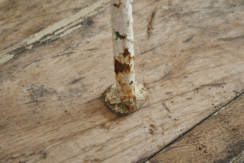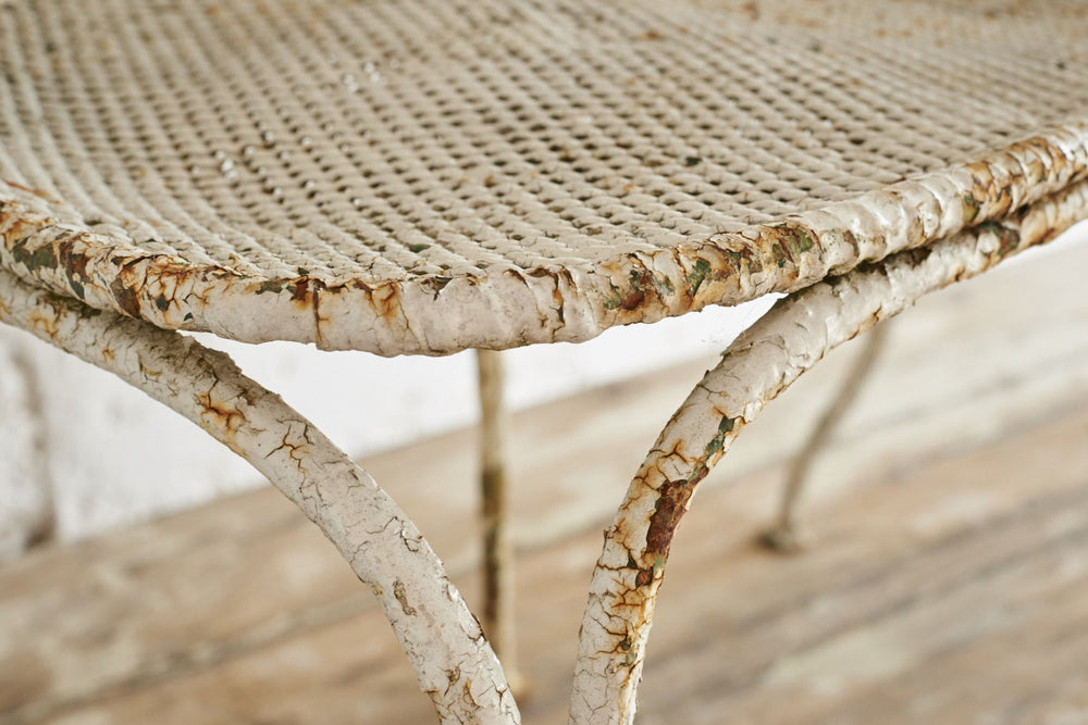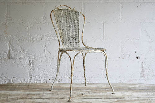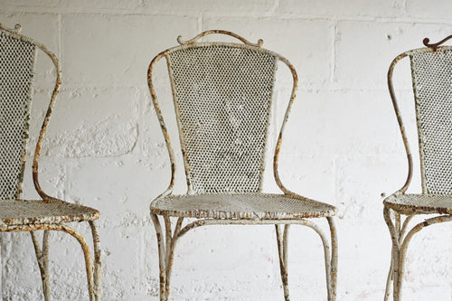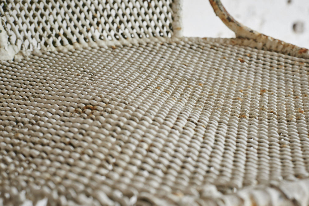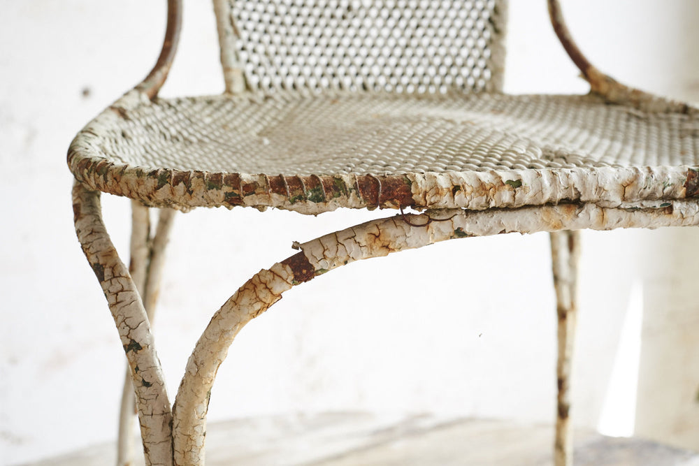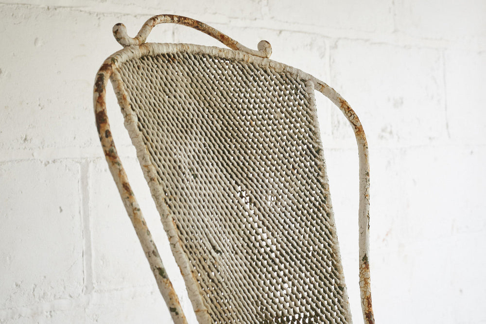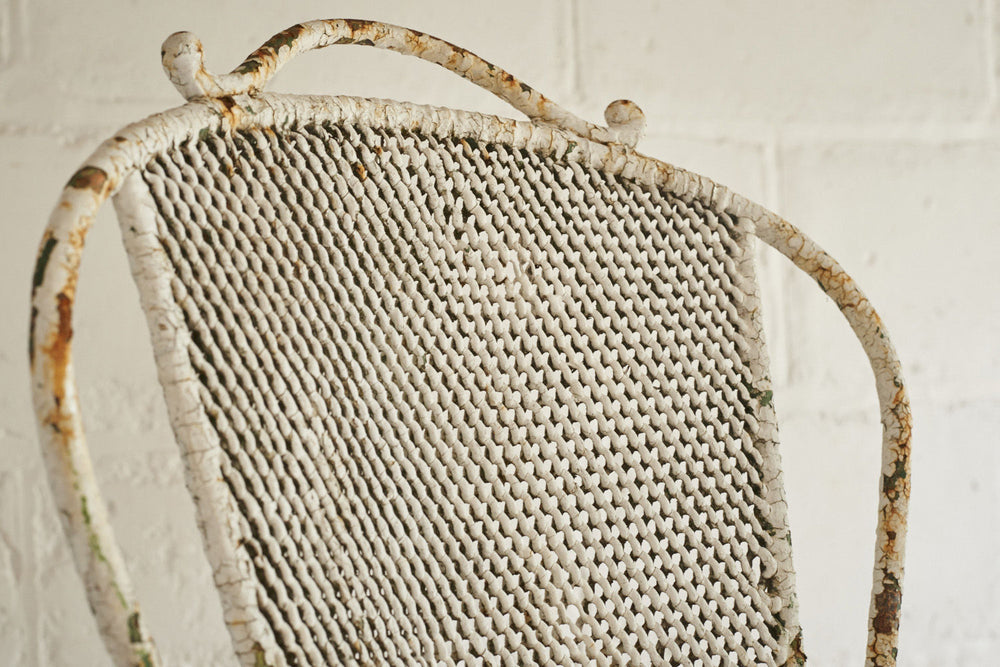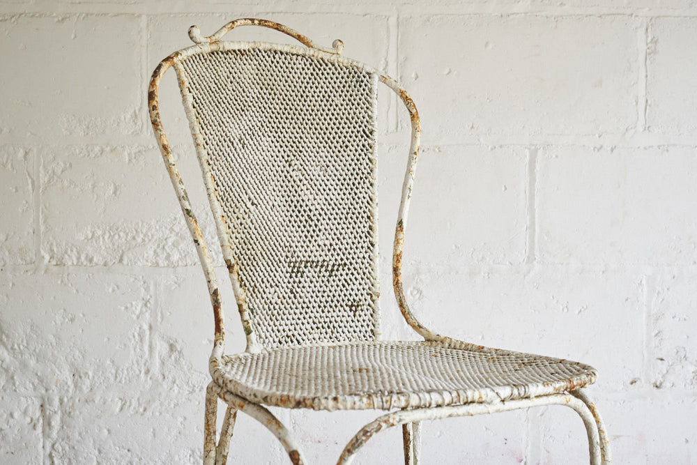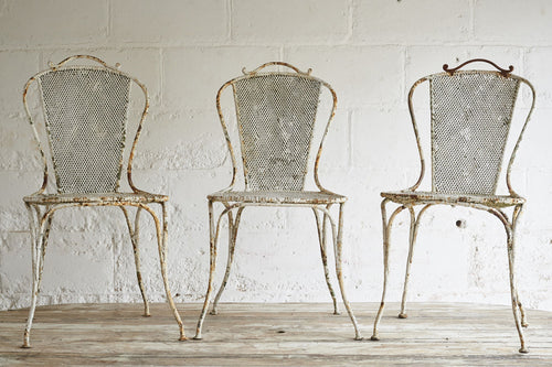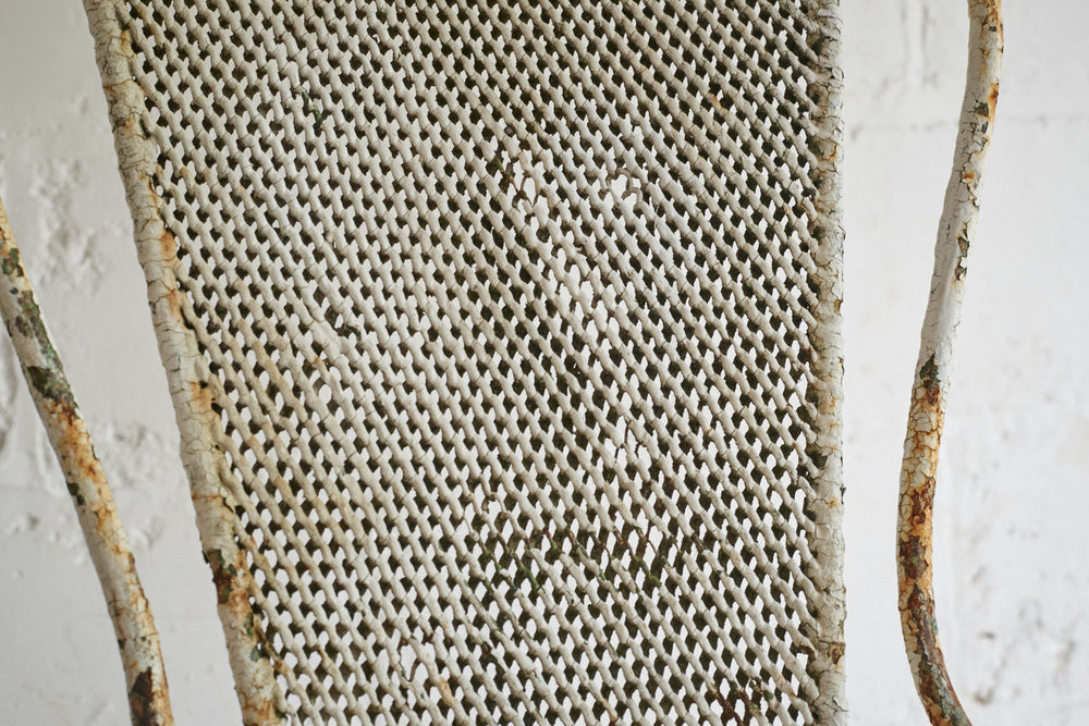 We found these in a brocante in Lyon, hidden among a pile of 20th century bistro chairs. We were immediately struck by the unsually good condition of the mesh backs and seats. The hand-forged frames are riveted together, and include a handy carrying handle at the top. The original paint is cracking to create a fantastic patina.