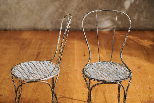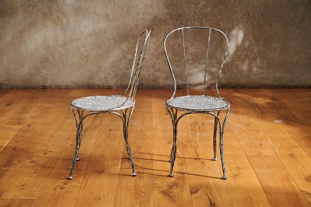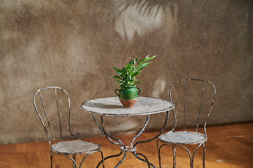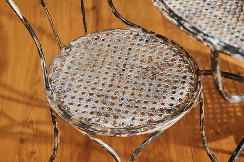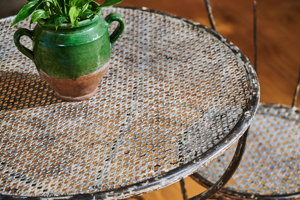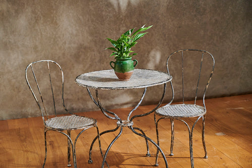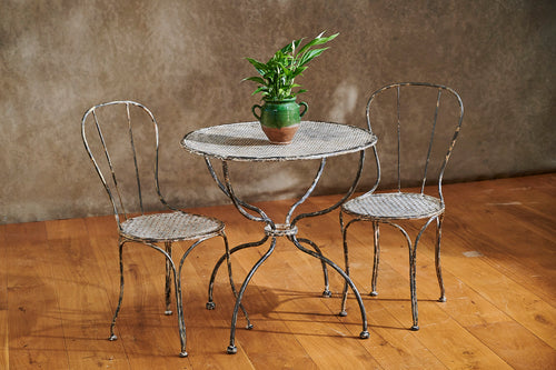 A rare 19th-century wrought iron garden set that provides an ideal outdoor dining option for two. The mesh seats of the chairs and top of the table are matching and the set retains traces of its original paint to create a lovely patina. In excellent condition, it would sit perfectly on a balcony or patio and is stylish enough to be used inside the home.