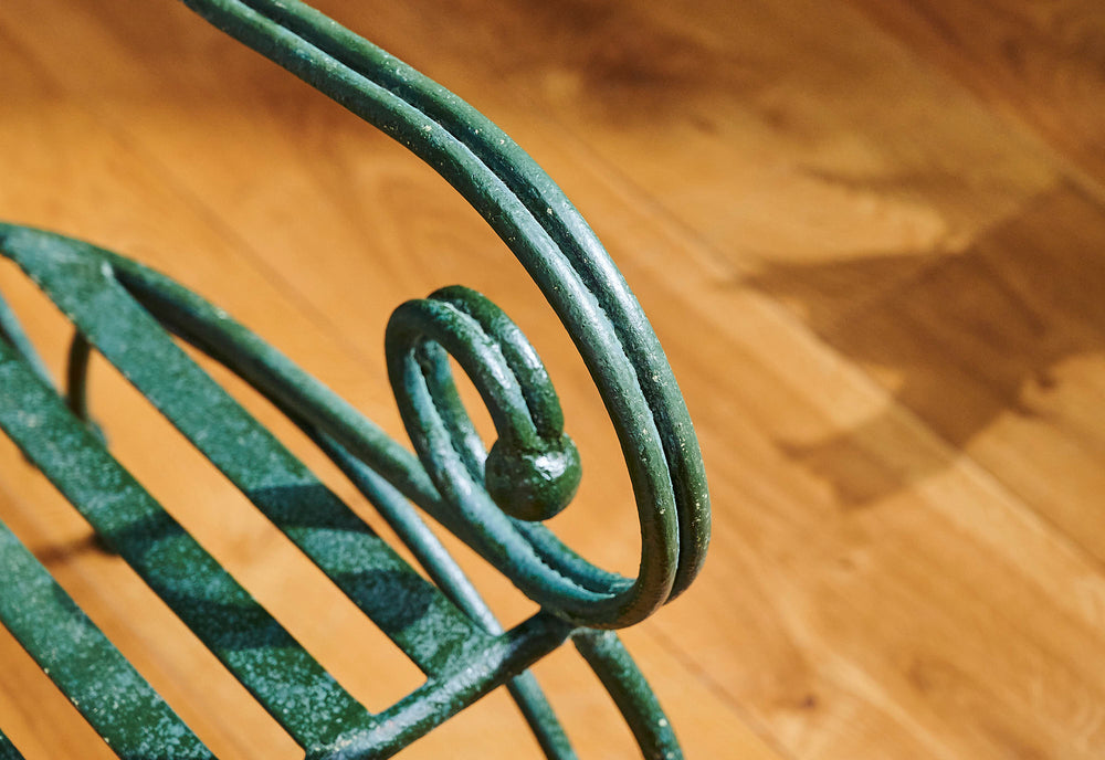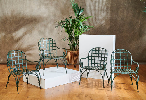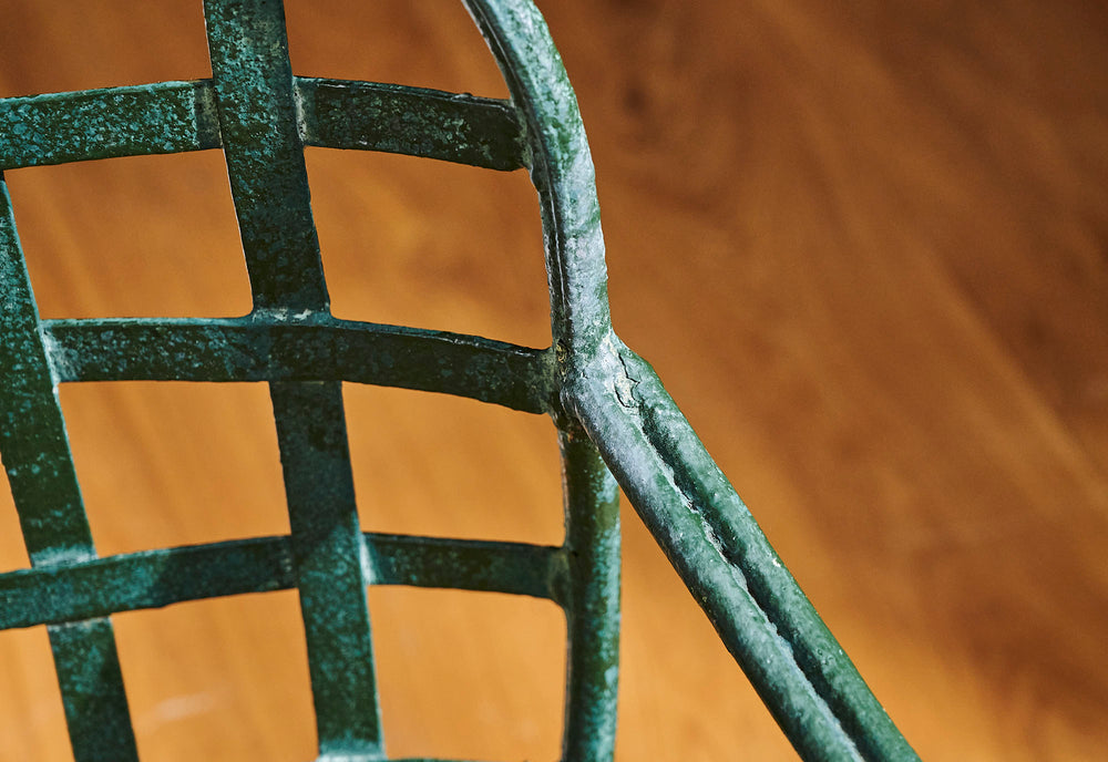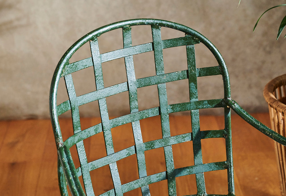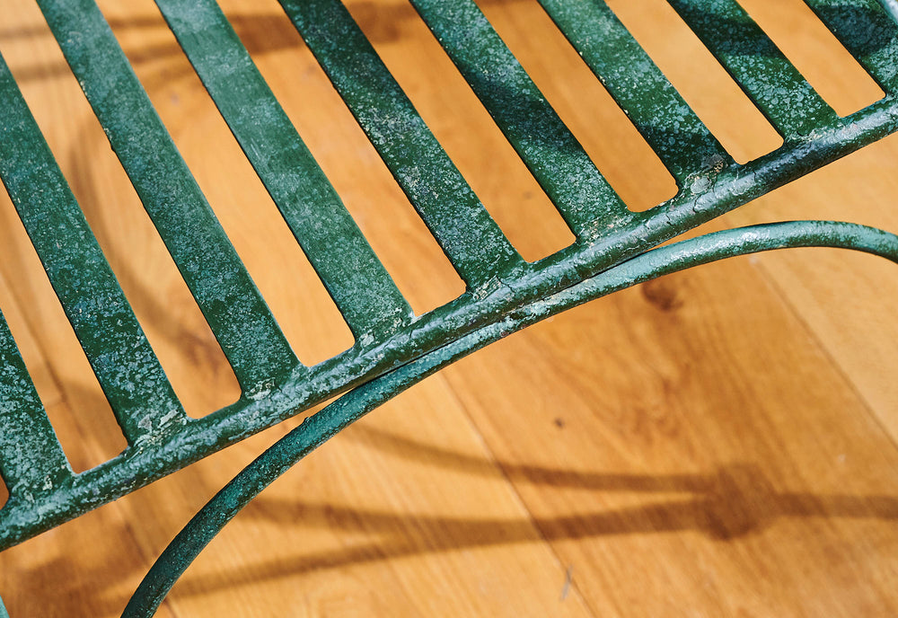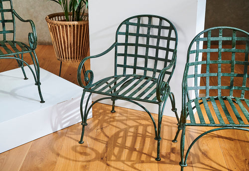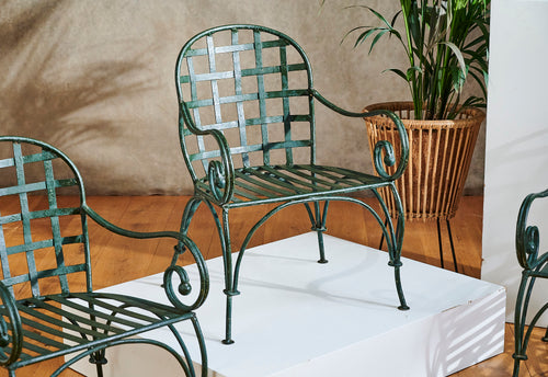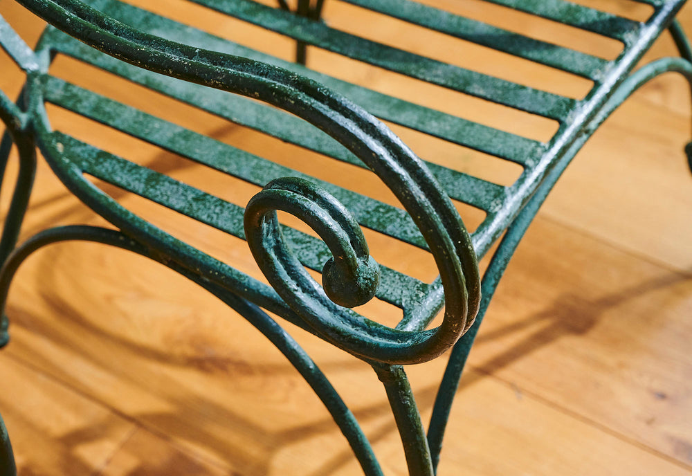 A very rare set of early 19th-century orangery armchairs. Handforged in wrought iron, these heavy and comfortable chairs have developed a beautiful weathered green painted patina. They could be used in the garden room or on the patio to relax and enjoy the sun whilst enjoying drinks and snacks before dinner.
