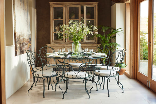 We have matched the table with eight garden armchairs to create a rare and attractive hand forged, garden dining set that is perfect for outdoor entertaining. It comes complete with modern waterproof seat cushions
