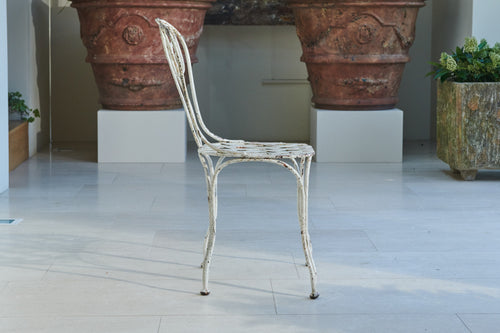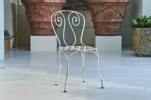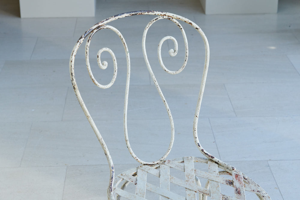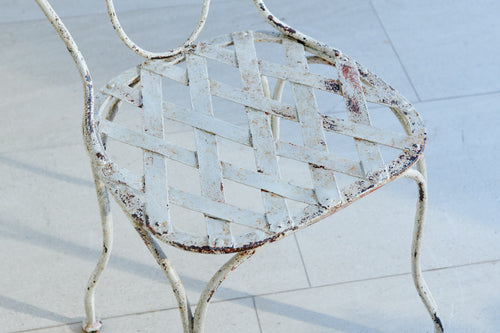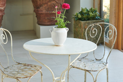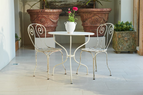 Comprising of a white wrought iron table and two chairs this pretty bistro set would be at home on a balcony or in a quiet corner of the garden. The hand-forged chairs have scrolled back and latticework seats