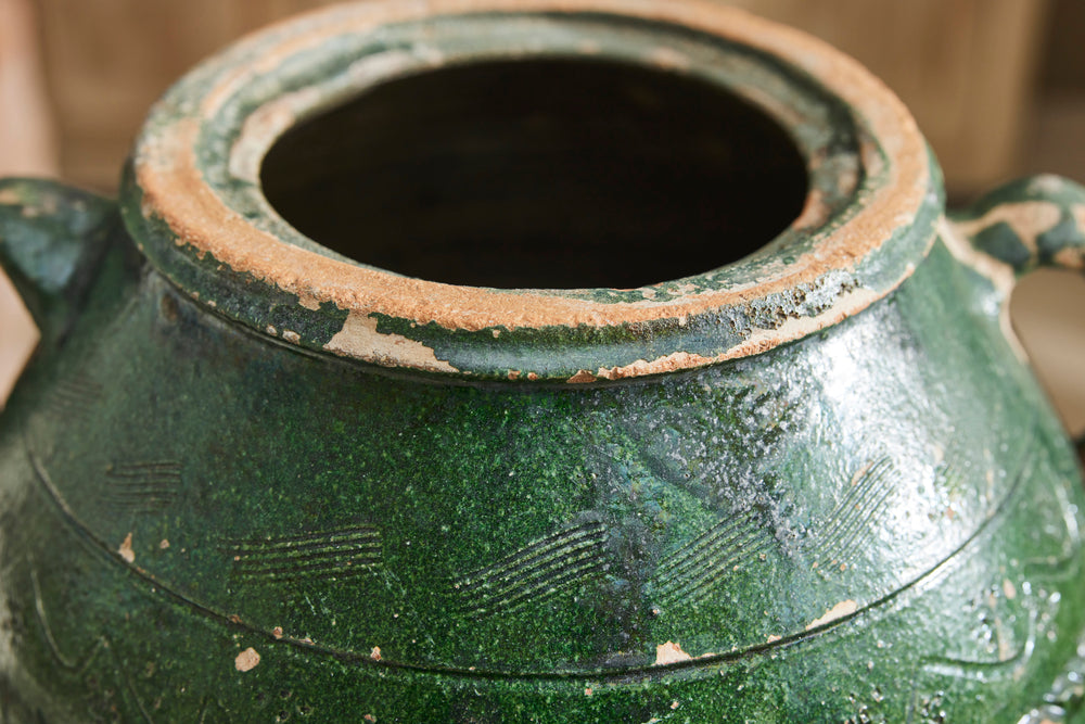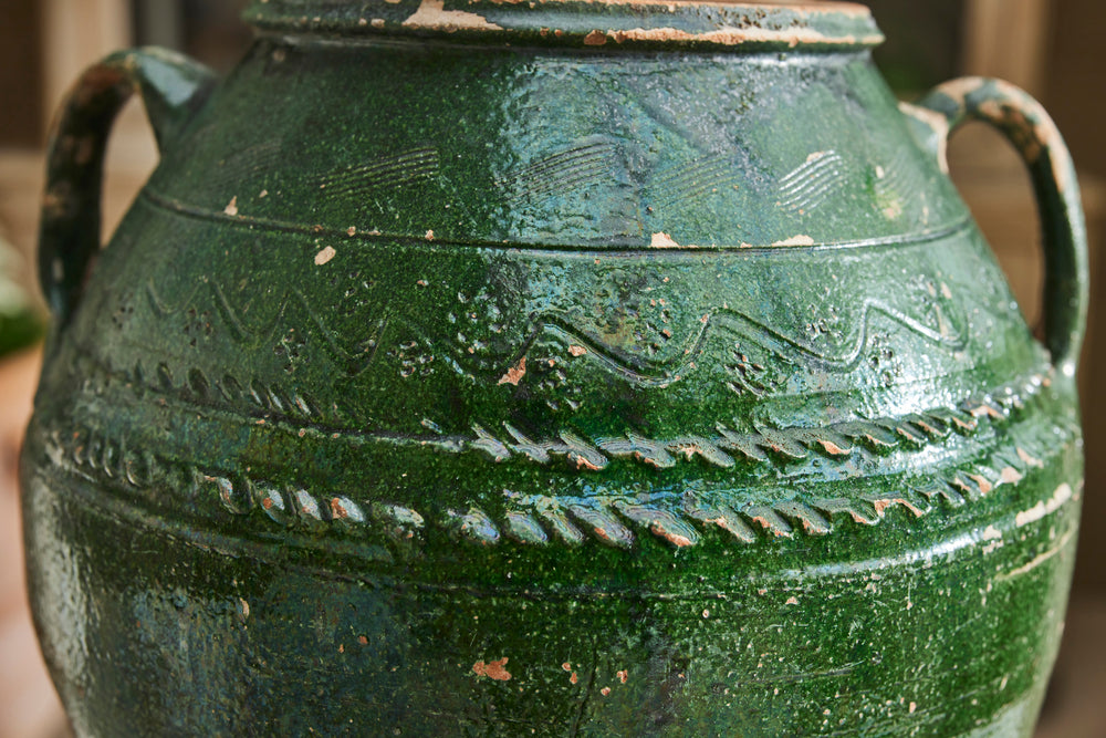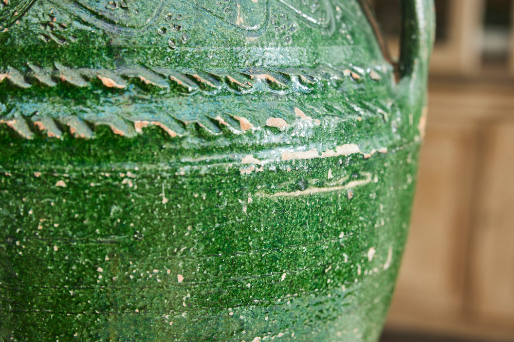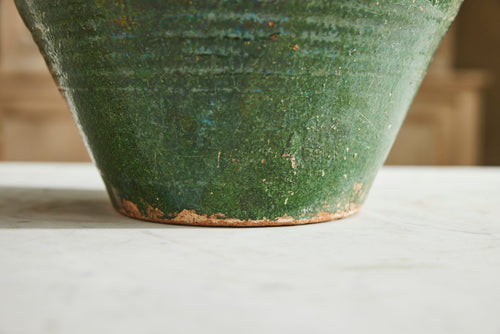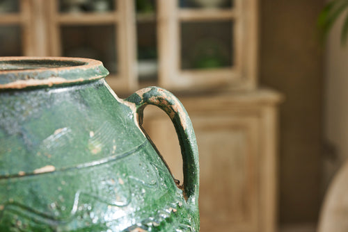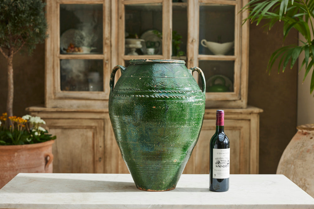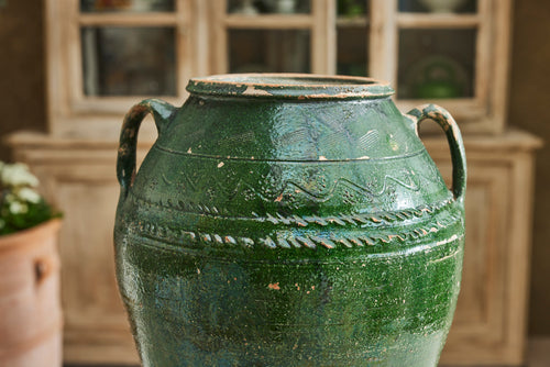 This authentic Greek olive oil urn dates to the mid-19th century and features a soft green glaze with classic side handles. Once used for storing olive oil, it now makes a characterful decorative piece for the home or garden.
