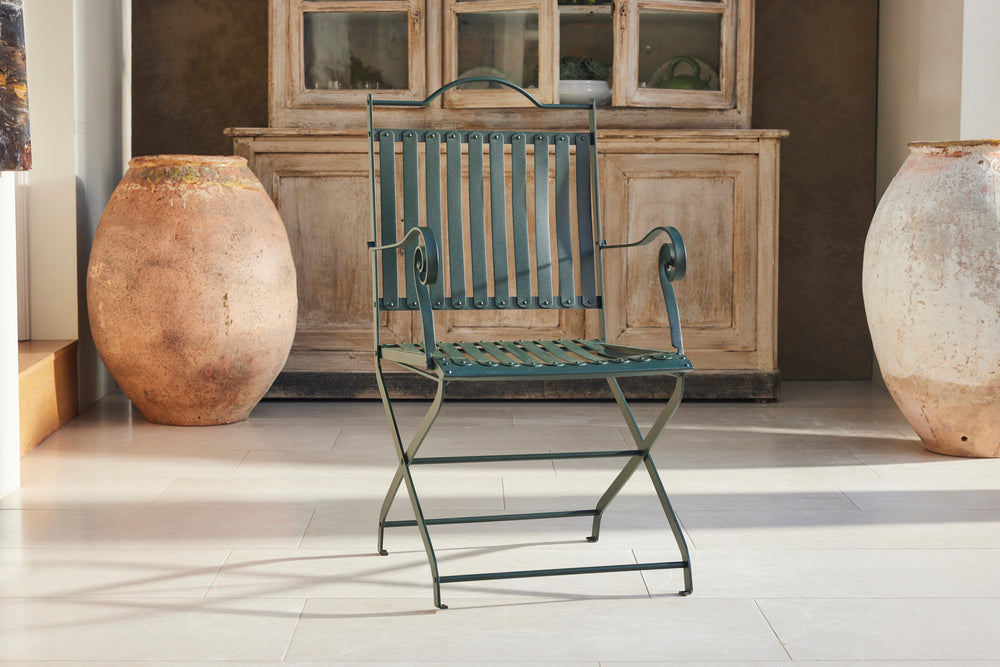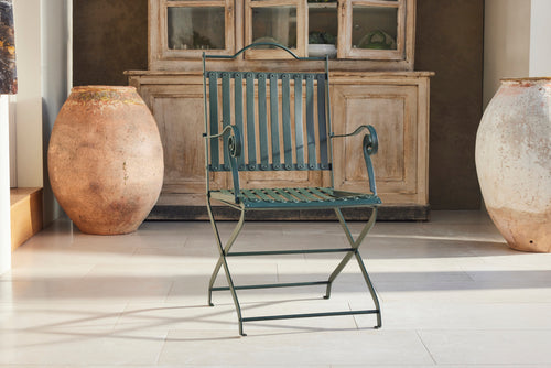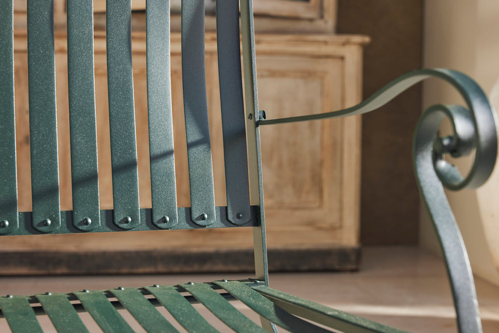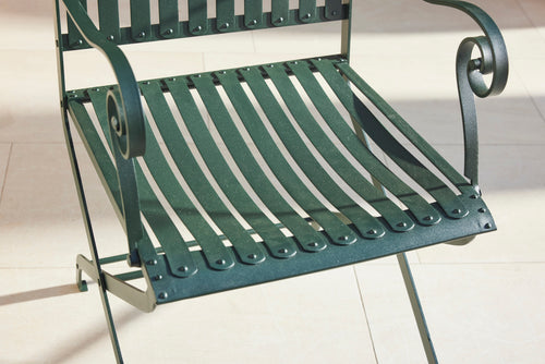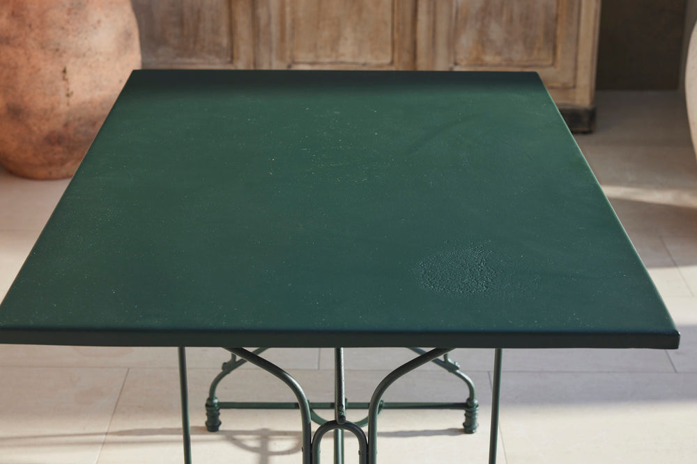 This elegant French dining set from 1930s features a metal table with a beautifully detailed frame and two matching slatted armchairs.