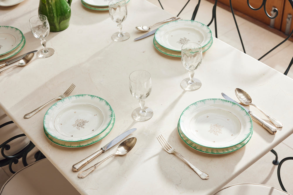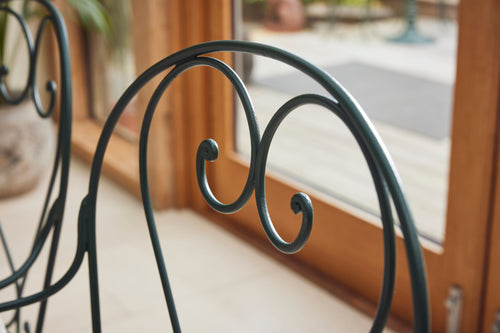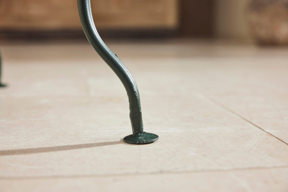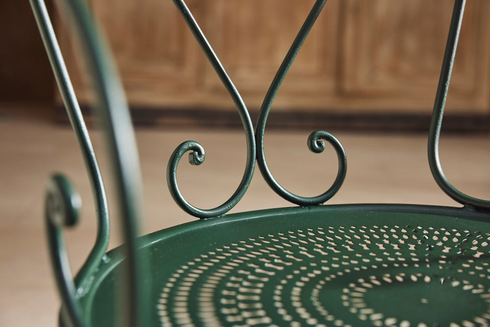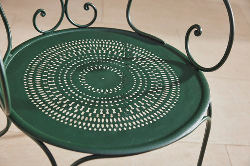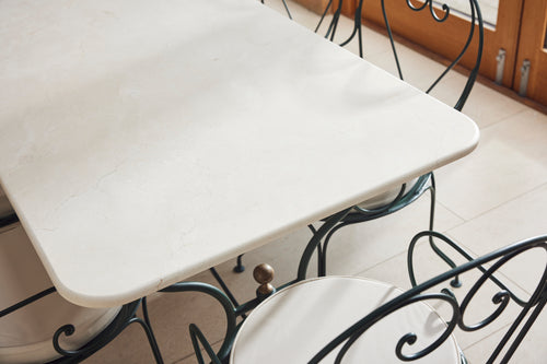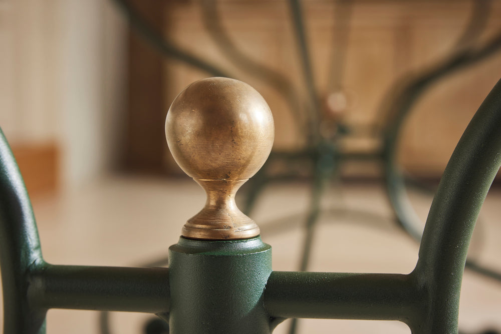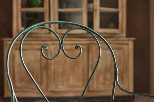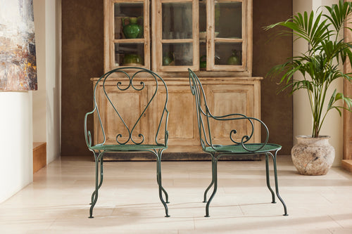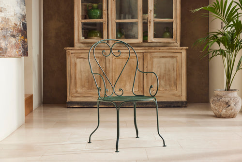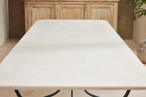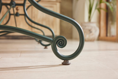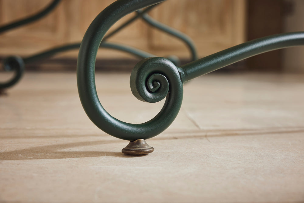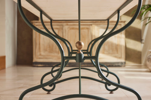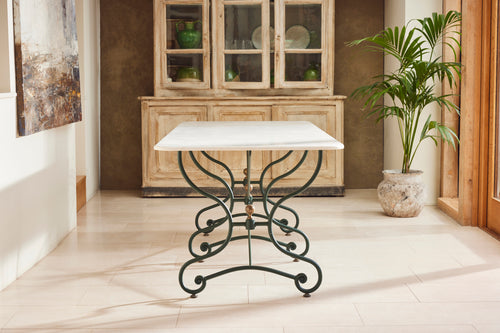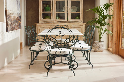 We found this exceptional garden table and armchairs chairs in Lyon France. The table has a wrought iron frame and a new marble top as the original had perished. It features 3 brass finals and small brass feet . The table comes together with eight matching armchairs all of which have been restored and powder coated and are therefore in very good condition. Powder coating offers the ultimate protection from weathering. The chairs come with hand made seat cushions.