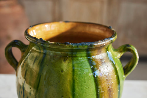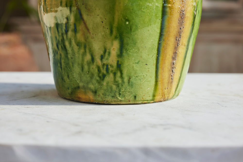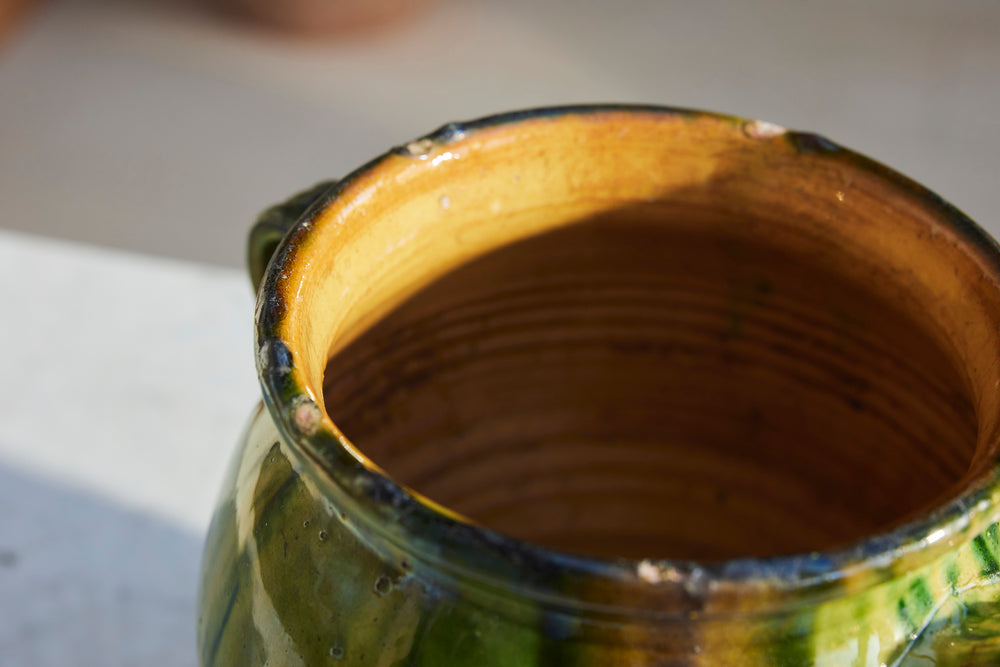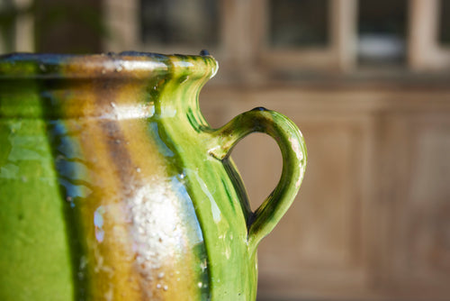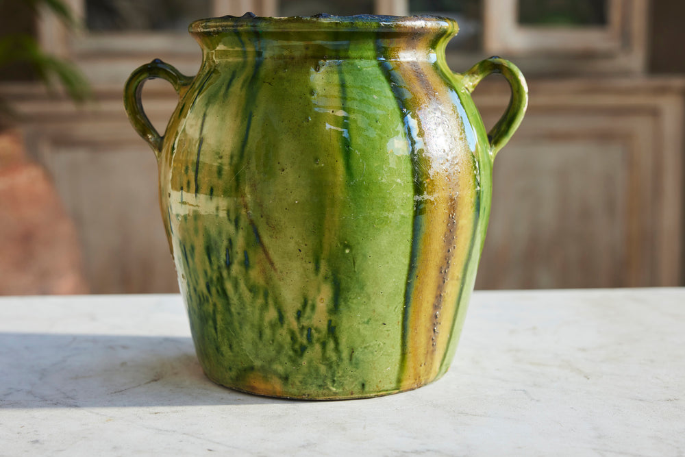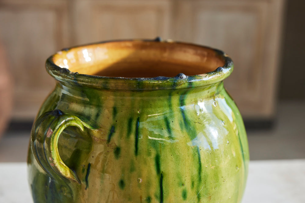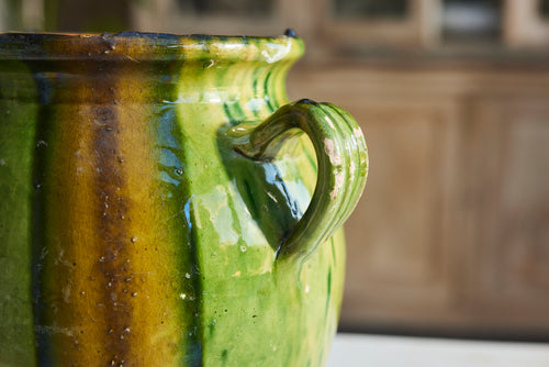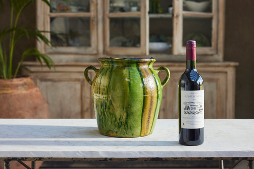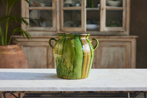 This striking multi-coloured confit pot immediately caught our eye. With beautiful shades of green and yellow, it’s a rare find and a true standout. piece. Originally used in kitchens for storing seeds, oils, and other essentials, it remains in very good condition. A timeless piece, perfect as a decorative accent with a rich history.