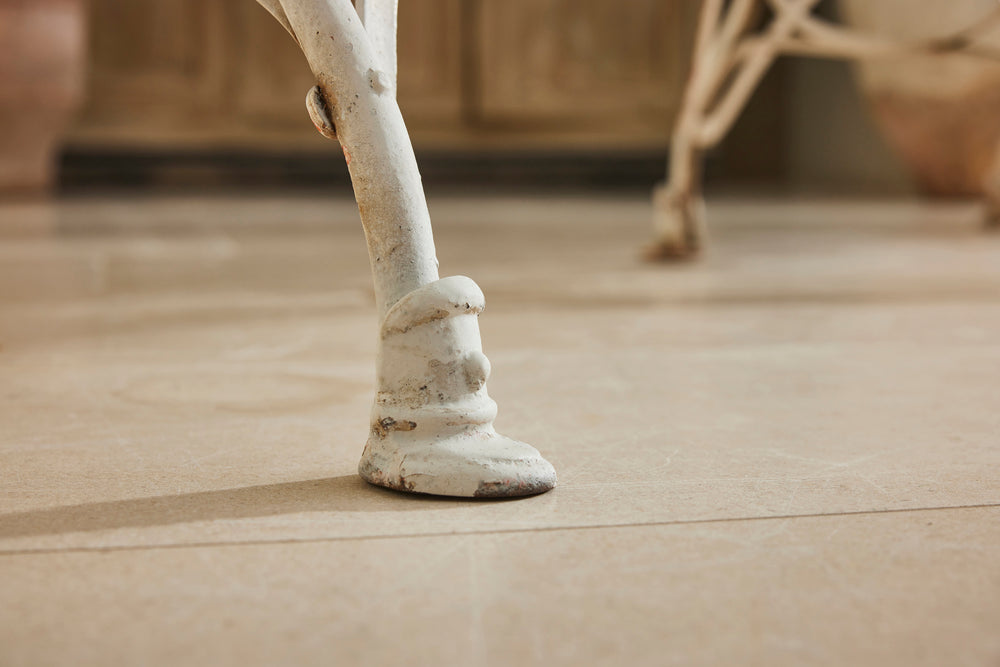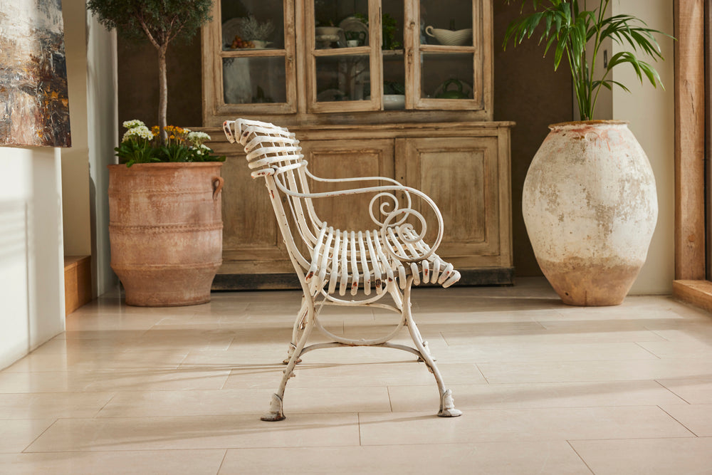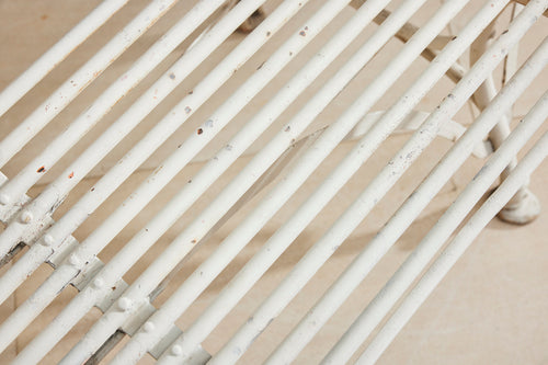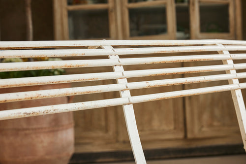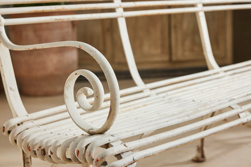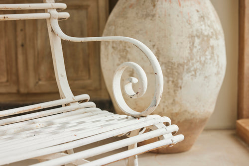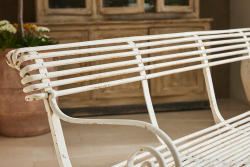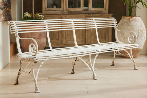 Of all the various designs of Arras benches, we think this wrought iron 4 seater half-back version with curved arms is the most attractive. Manufactured in Northern France in and around 1900 it features the cast iron hoof feet associated with the foundries later designs. In very good original condition this substantial bench would look great in either a modern or traditional garden.