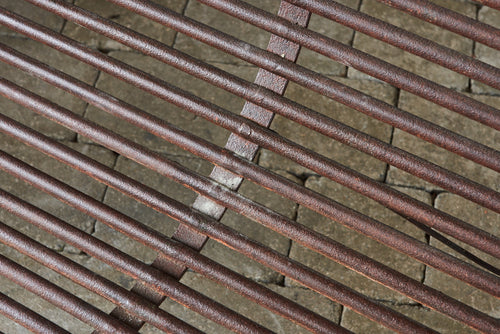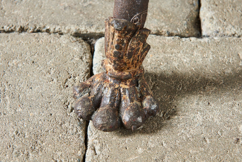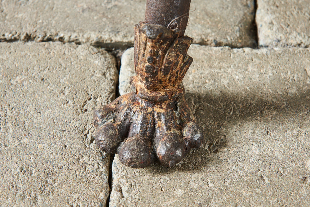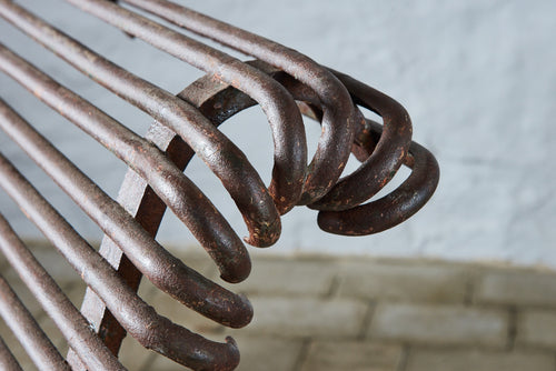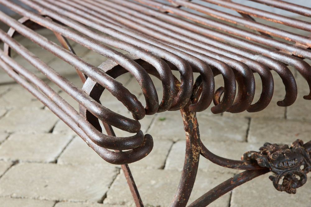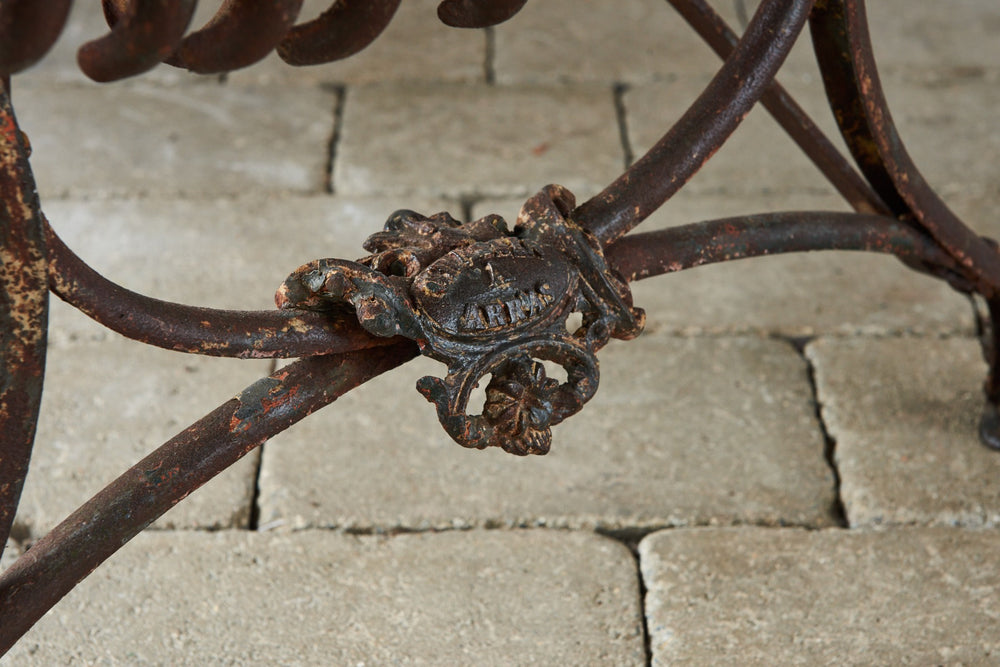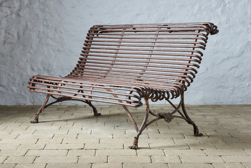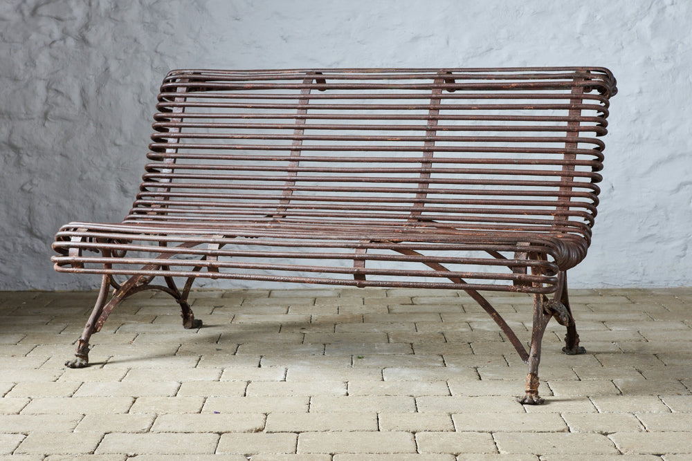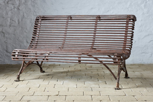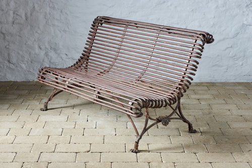 An attractive three-seater Arras bench. This genuine Arras bench was manufactured Grassin Baledans in the mid 19th century. The lions claw feet are typical of early Arras furniture design as is the attractive emblem at each end of the frame This bench which is in very good condition is made from the patented half-round hollow wrought iron that characterises this collectable make which would look great in either a contemporary or traditional garden.